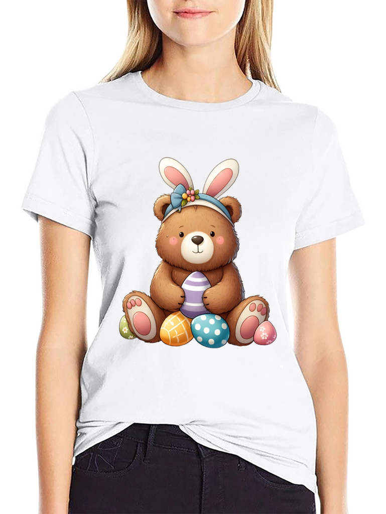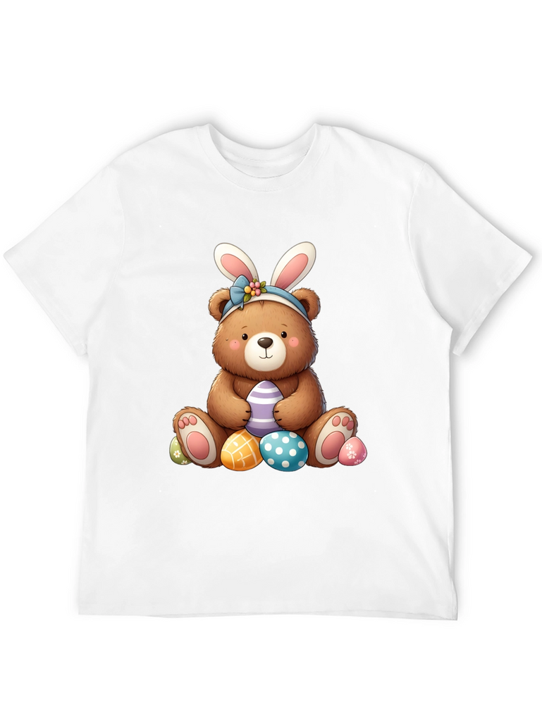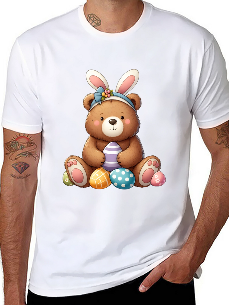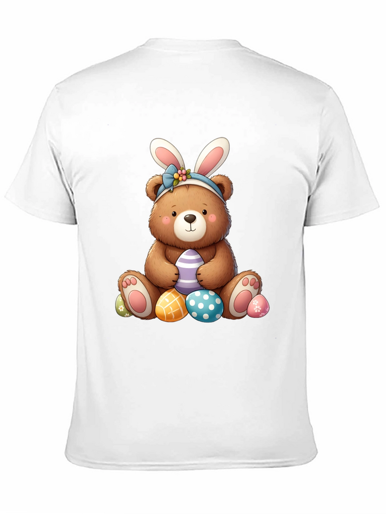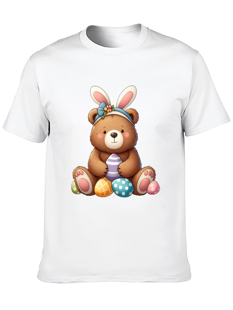 Celebrate Easter in style with this adorable black t-shirt featuring a charming bear wearing bunny ears. The cute bear graphic is surrounded by colorful Easter eggs, perfect for adding a touch of holiday cheer to your wardrobe. Made from soft, comfortable fabric, this t-shirt is ideal for casual wear, Easter egg hunts, or family gatherings. The playful design is sure to bring a smile to everyone's face and makes a great gift for Easter lovers of all ages. Get ready to hop into the Easter spirit with this fun and festive tee!