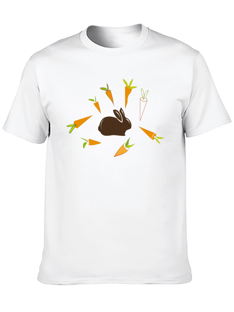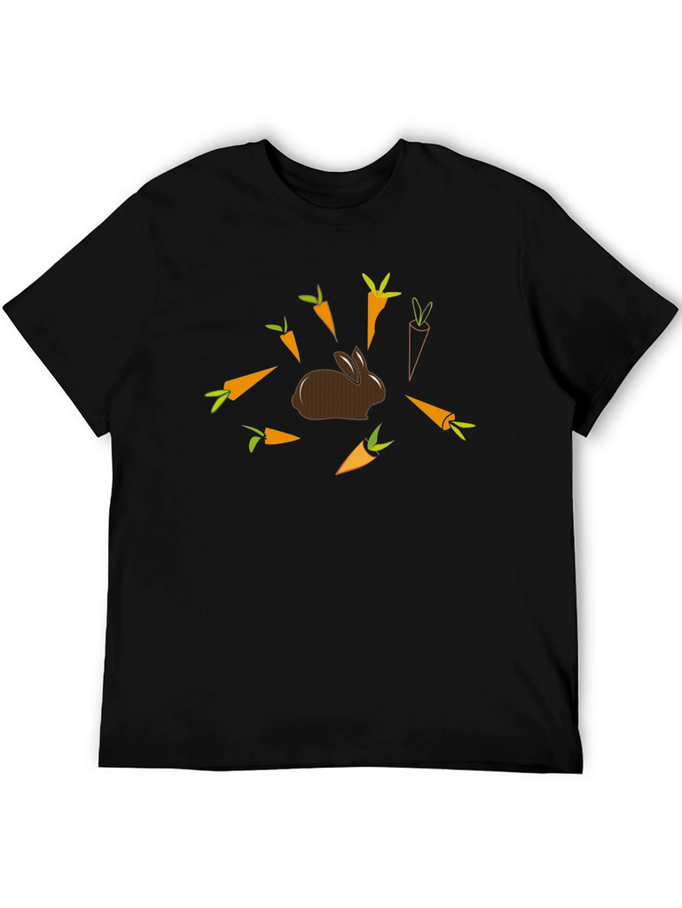This charming black t-shirt features a delightful Easter-themed graphic. A brown bunny sits at the center, surrounded by playful orange carrots with green tops. The design offers a whimsical, festive appeal, perfect for celebrating Easter or adding a touch of fun to your casual wardrobe. Made from a comfortable, soft fabric, this tee is ideal for everyday wear. Pair it with jeans, shorts, or leggings for a relaxed and stylish look. It's a great conversation starter and a fun way to express your love for Easter.