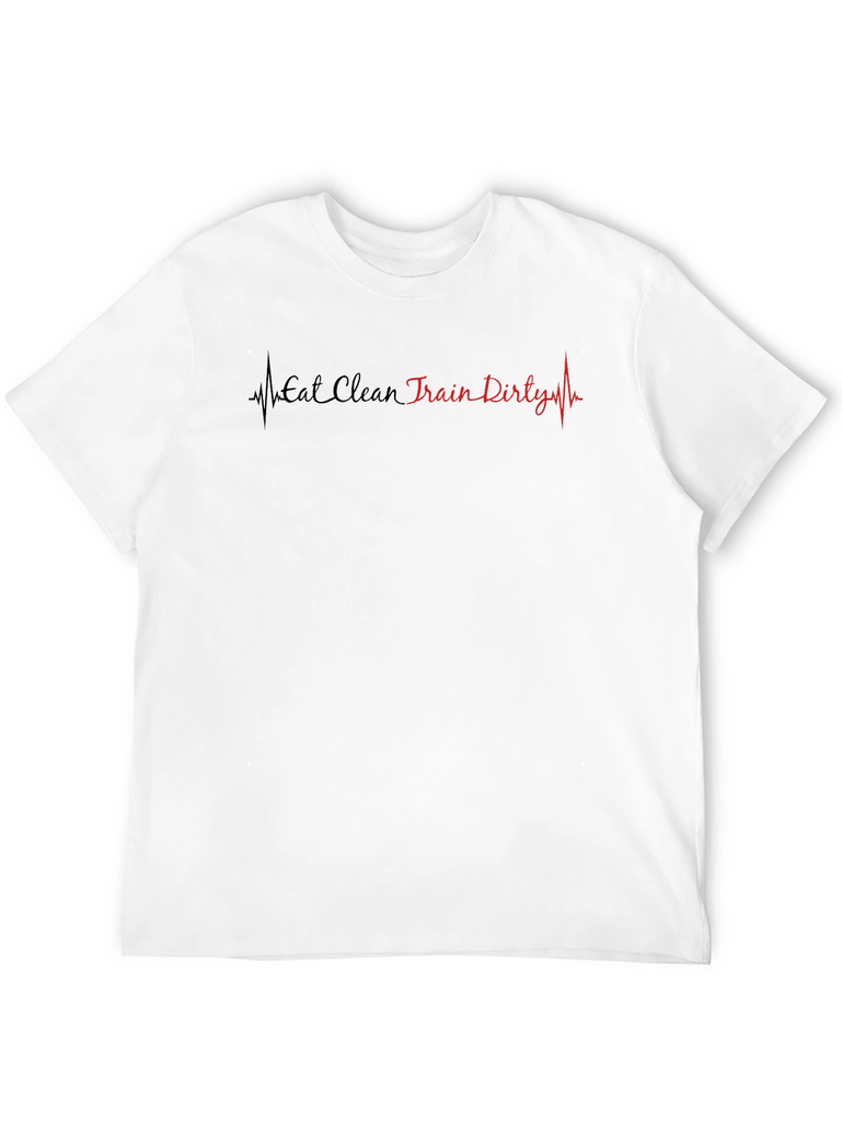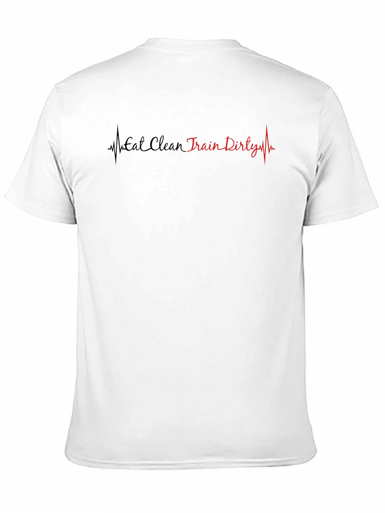 Show off your dedication to health and fitness with this stylish black graphic tee. The shirt features a unique design with the phrase "Eat Clean Train Dirty" displayed in a cursive font, emphasized by a heartbeat line detail in black and red. This eye-catching design is perfect for gym enthusiasts, athletes, or anyone who wants to express their commitment to a balanced lifestyle. Made from a comfortable material, this tee is ideal for workouts, casual outings, or lounging at home. It's a versatile addition to any wardrobe.