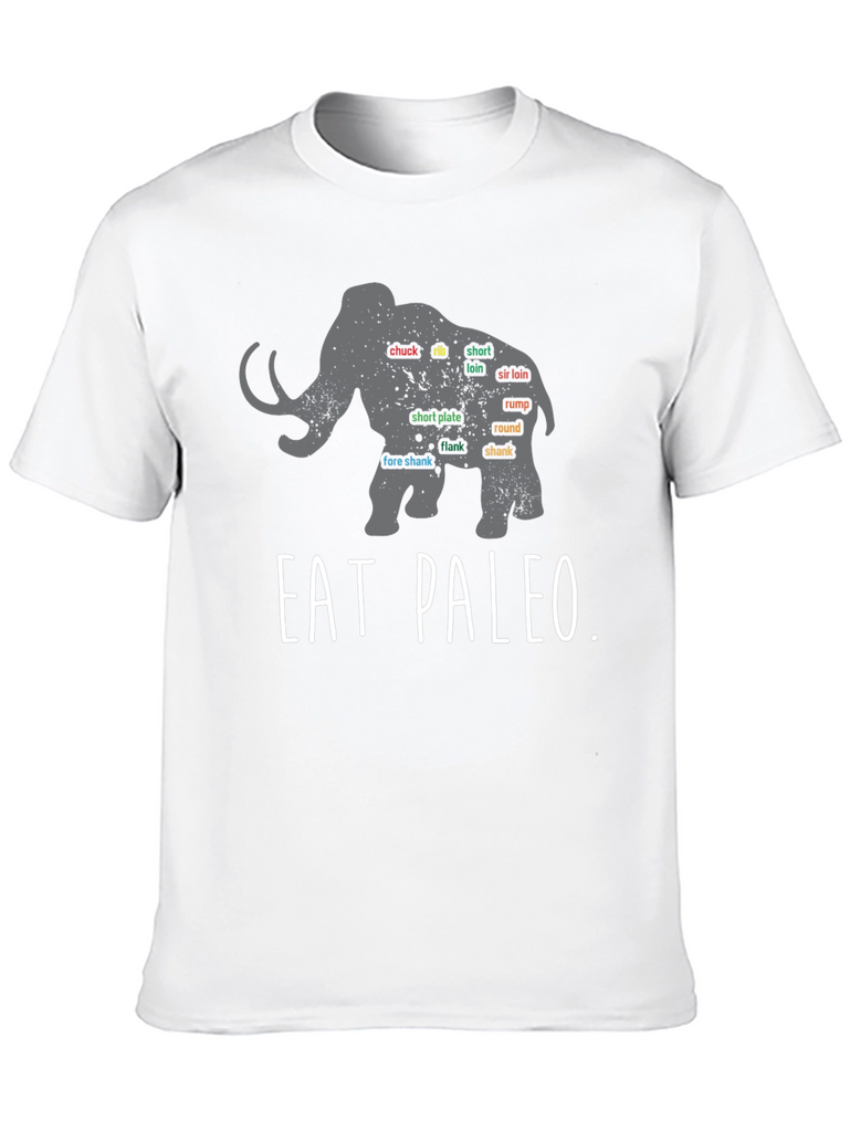 This black t-shirt features a gray graphic of a woolly mammoth with different sections labeled as cuts of meat, such as "chuck", "rib", "short loin", and "shank". Below the mammoth illustration, the phrase "EAT PALEO" is printed in white block letters. The shirt appears to be made of a soft, comfortable fabric, possibly cotton or a cotton blend. Ideal for paleo diet enthusiasts, hunters, cooks, or anyone with a quirky sense of humor. This unique tee makes a statement, showcasing your dietary lifestyle in a fun and eye-catching way. A great conversation starter!