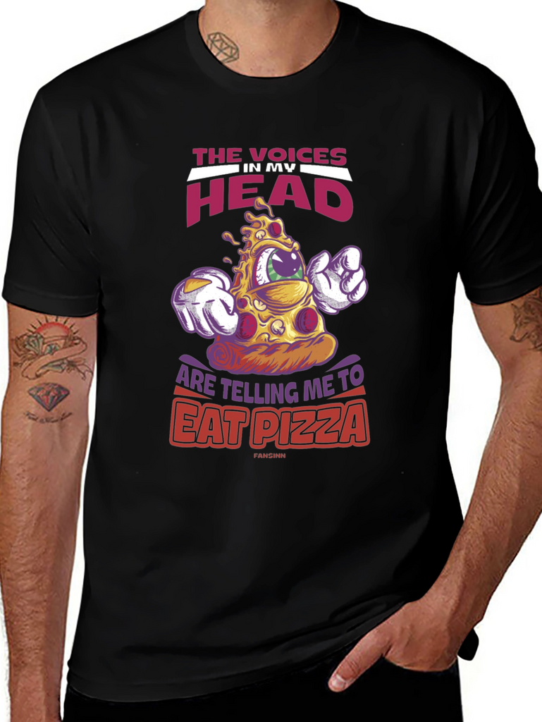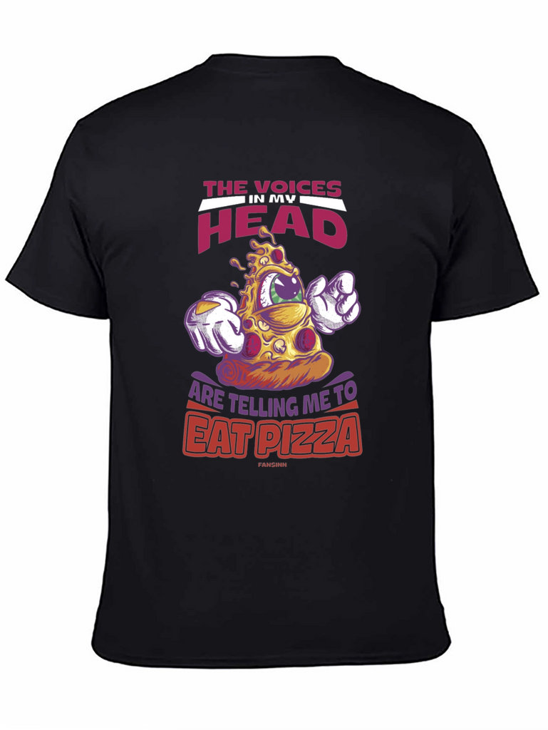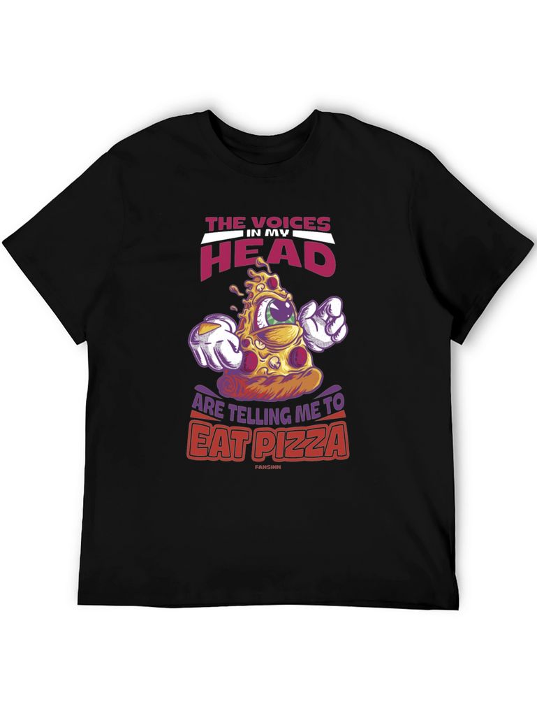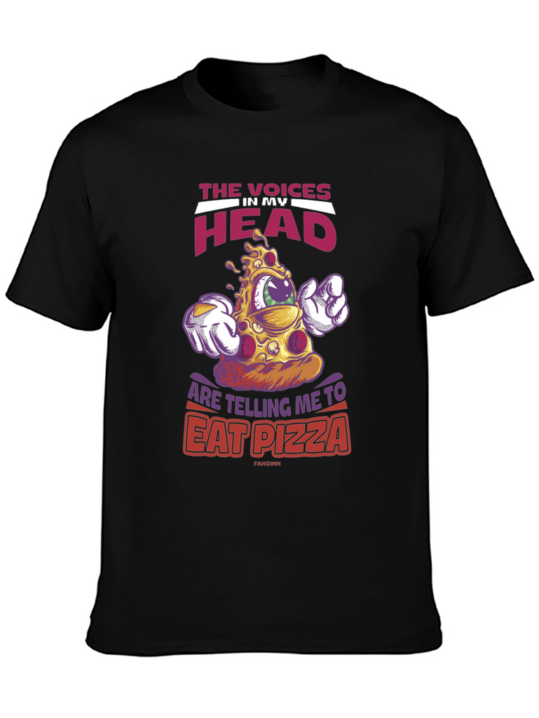 This eye-catching black t-shirt features a quirky, cartoon-style graphic. The design showcases a slice of pizza with a funny face, complete with googly eyes and expressive hands. Above and below the pizza are the words "The Voices in My Head" and "Are Telling Me to Eat Pizza" in a playful, stylized font. The t-shirt appears to be made of a comfortable material, perfect for casual wear. It's a fun and unique piece that's sure to grab attention and spark conversations. Ideal for pizza lovers and those with a sense of humor!