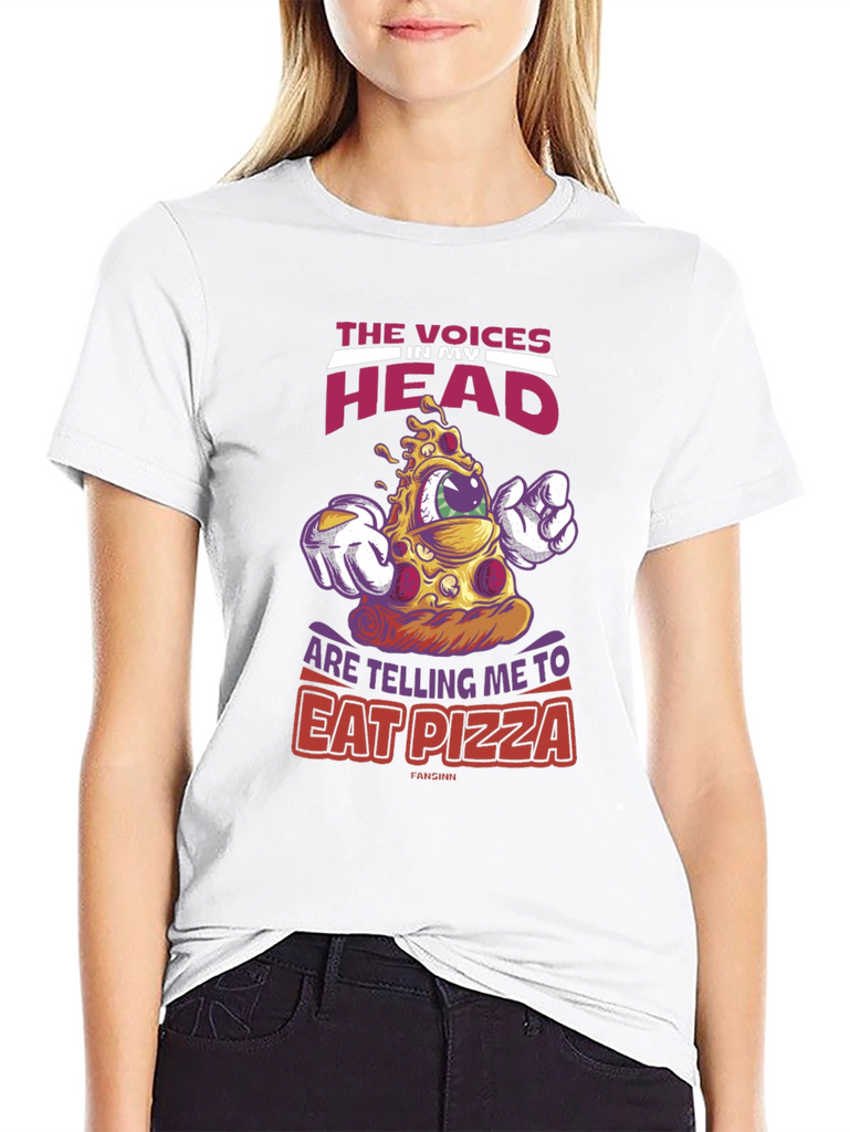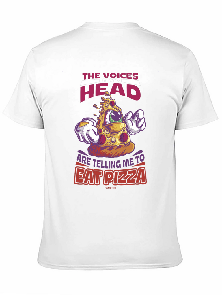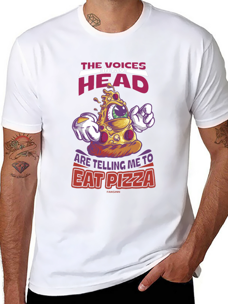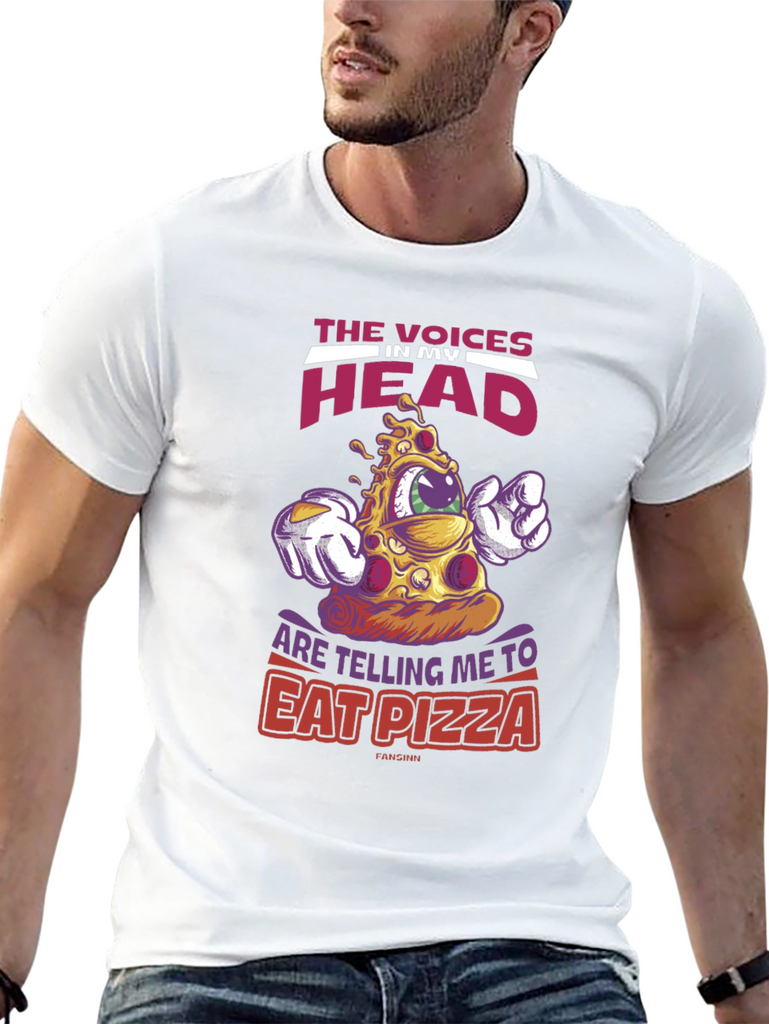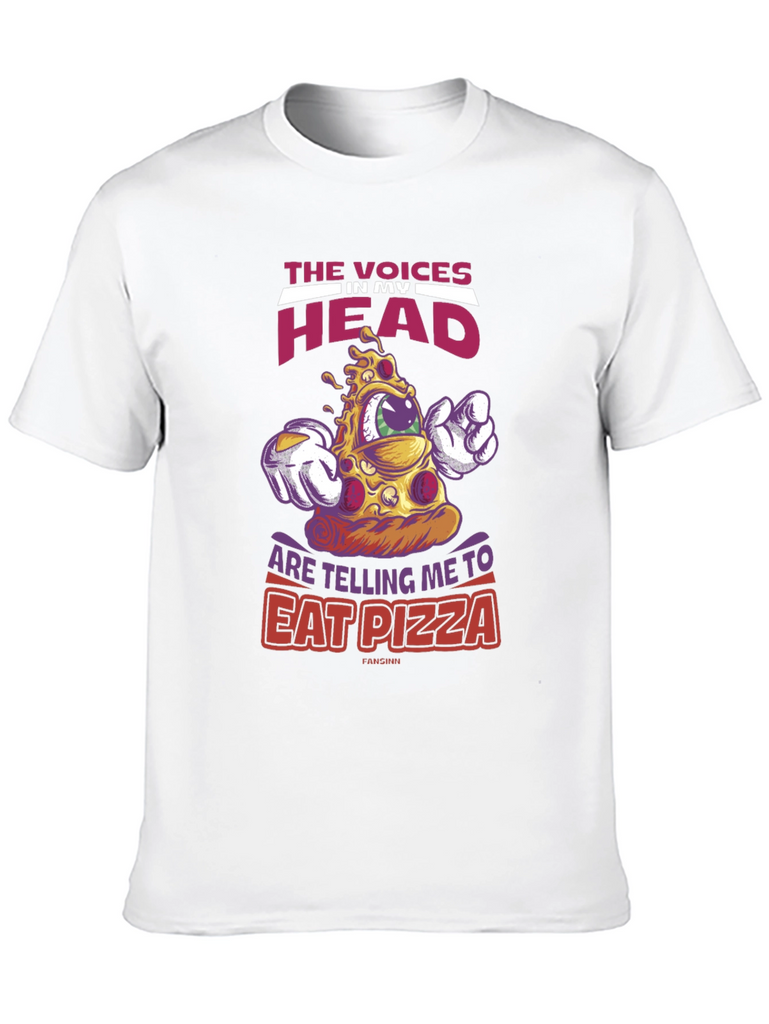 This eye-catching black t-shirt features a quirky, cartoon-style graphic. The design showcases a slice of pizza with a funny face, complete with googly eyes and expressive hands. Above and below the pizza are the words "The Voices in My Head" and "Are Telling Me to Eat Pizza" in a playful, stylized font. The t-shirt appears to be made of a comfortable material, perfect for casual wear. It's a fun and unique piece that's sure to grab attention and spark conversations. Ideal for pizza lovers and those with a sense of humor!
