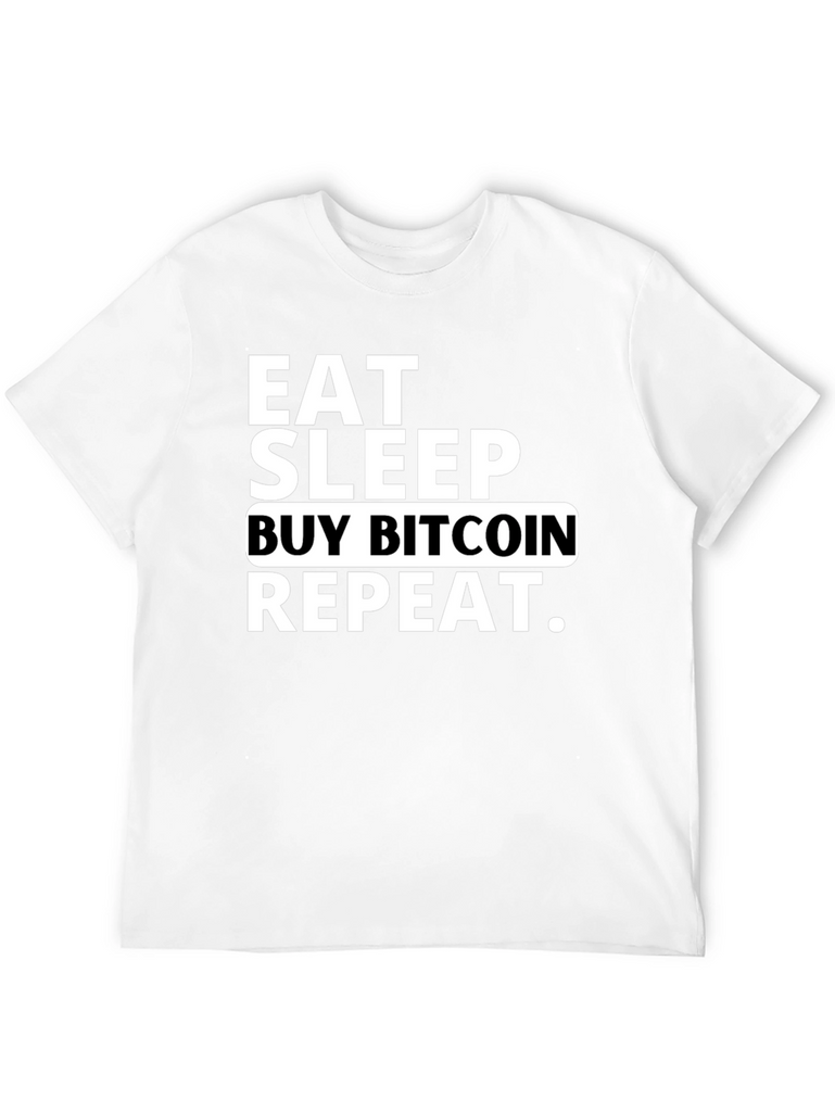 This black t-shirt features the phrase "Eat Sleep Buy Bitcoin Repeat" in bold white lettering. The shirt has a classic fit, short sleeves, and a crew neck. Made from a comfortable and breathable fabric, this tee is perfect for everyday wear and showcasing your interest in cryptocurrency. Wear it casually, to crypto meetups, or just lounging around. This Bitcoin-themed shirt will be a conversation starter and show your passion for digital currency.