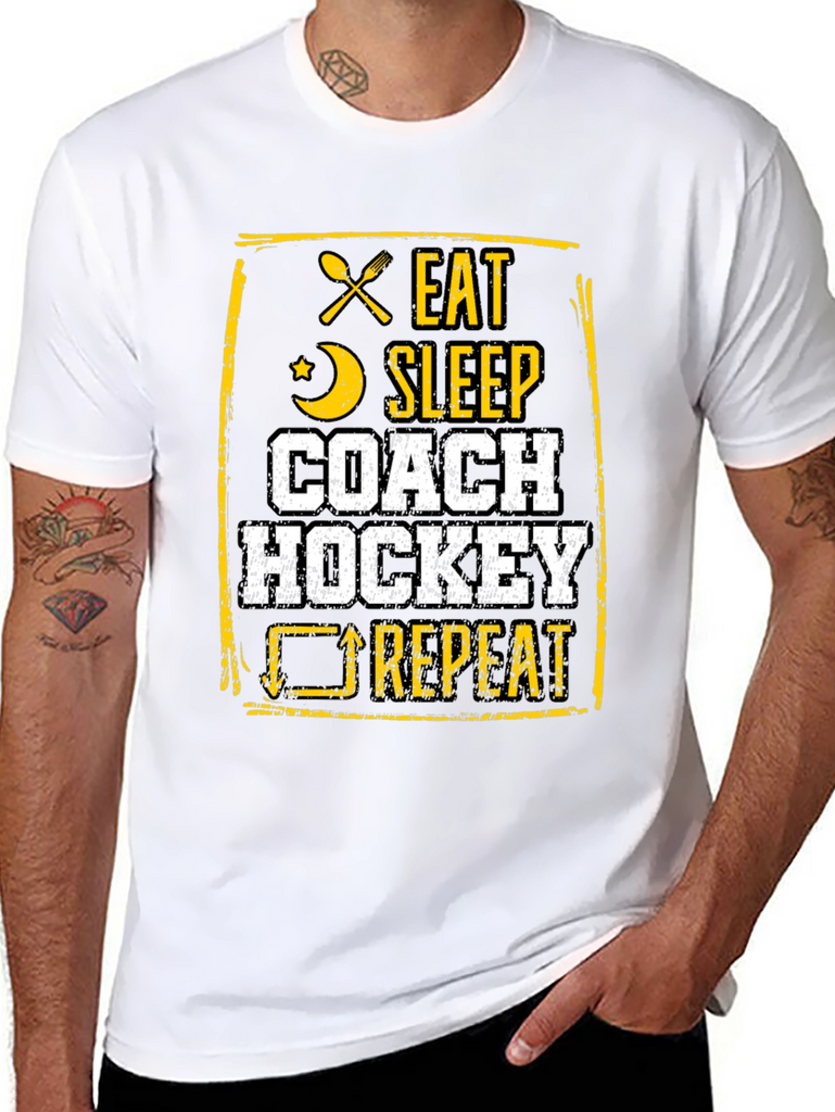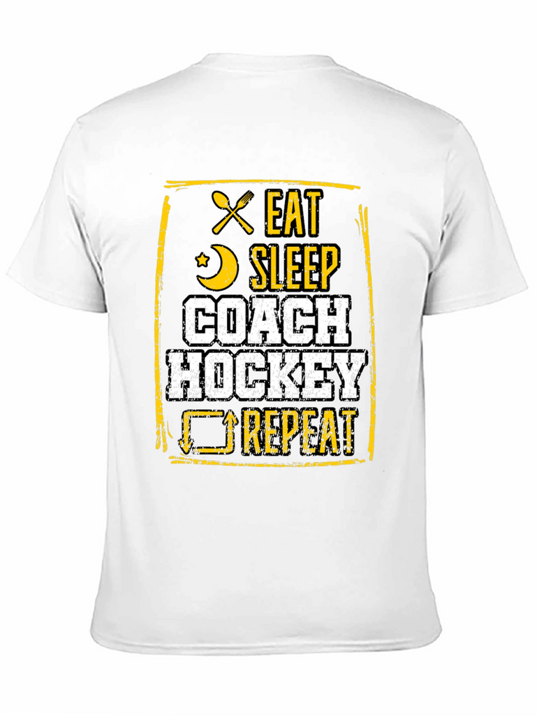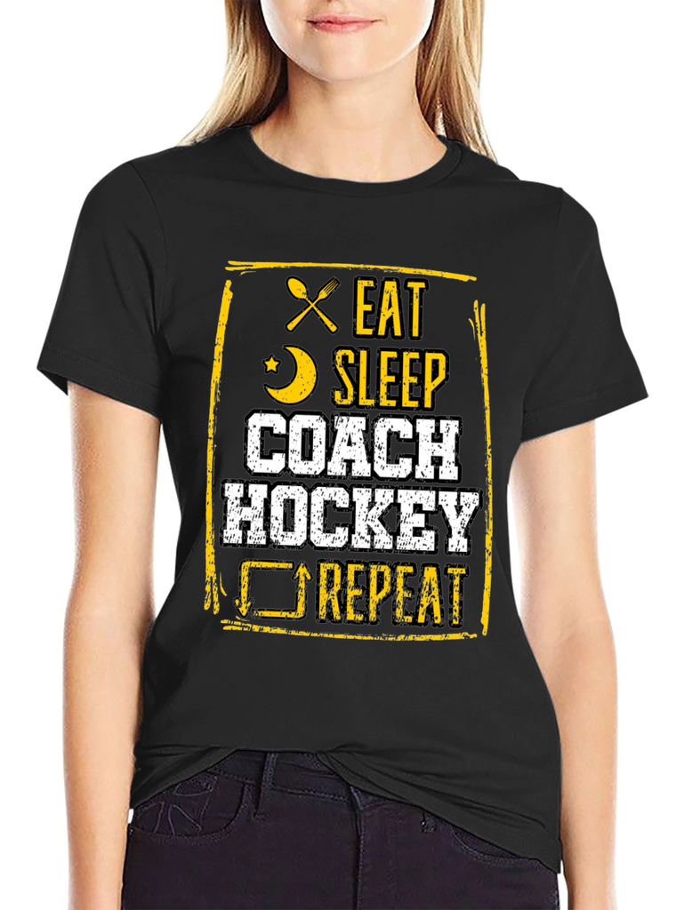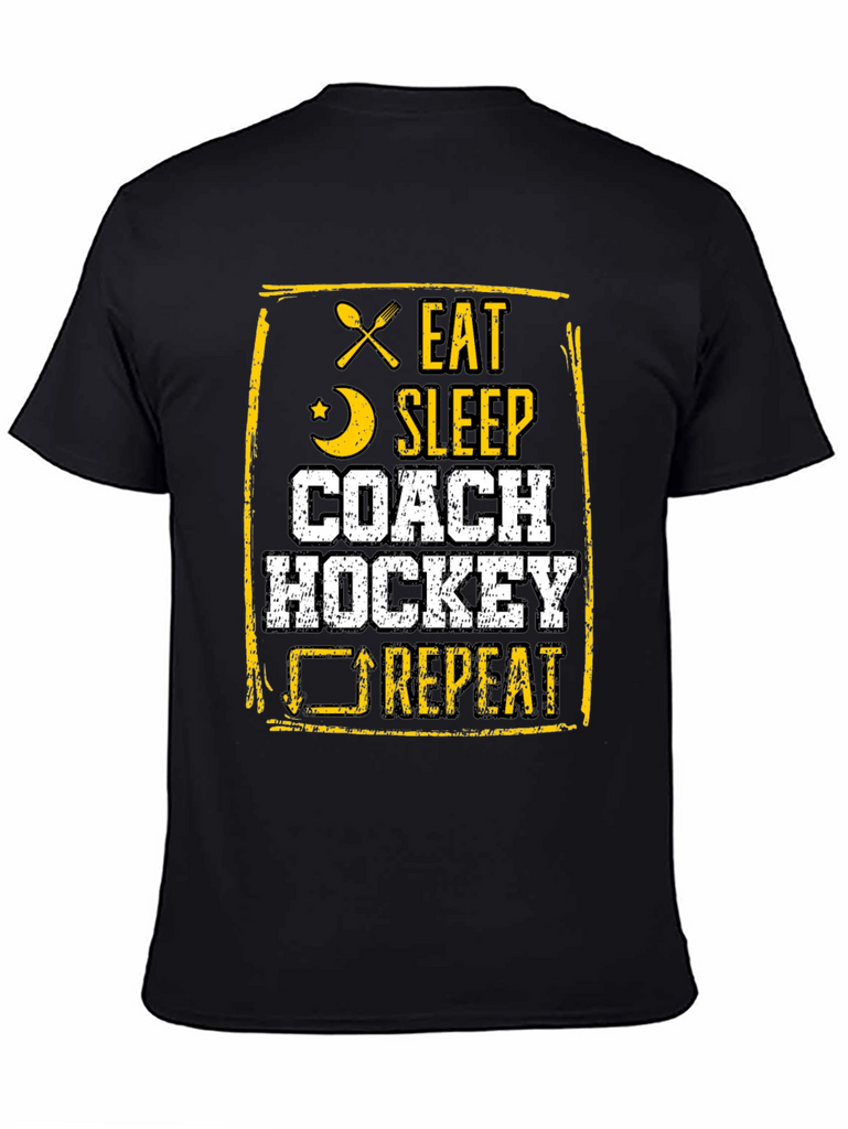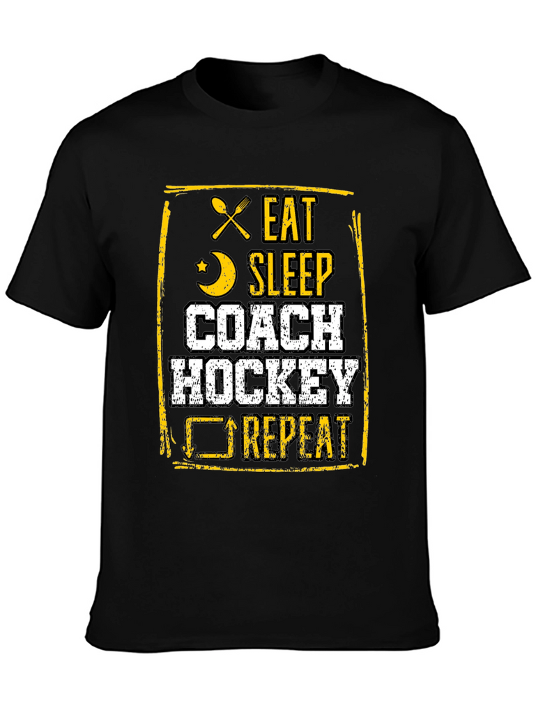 This black t-shirt features a bold, distressed graphic design in yellow and white. The design includes crossed silverware, a crescent moon, and a cyclical arrow, accompanied by the text "EAT SLEEP COACH HOCKEY REPEAT." Made from a comfortable fabric, this tee is perfect for hockey coaches who live and breathe the sport. Ideal for casual wear, coaching sessions, or showing off hockey passion, it's a must-have for any dedicated hockey enthusiast's wardrobe. The unique design makes it a standout piece.