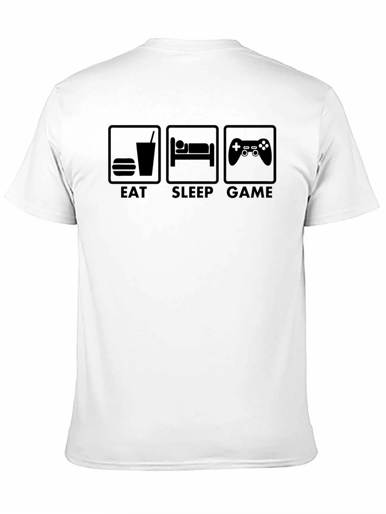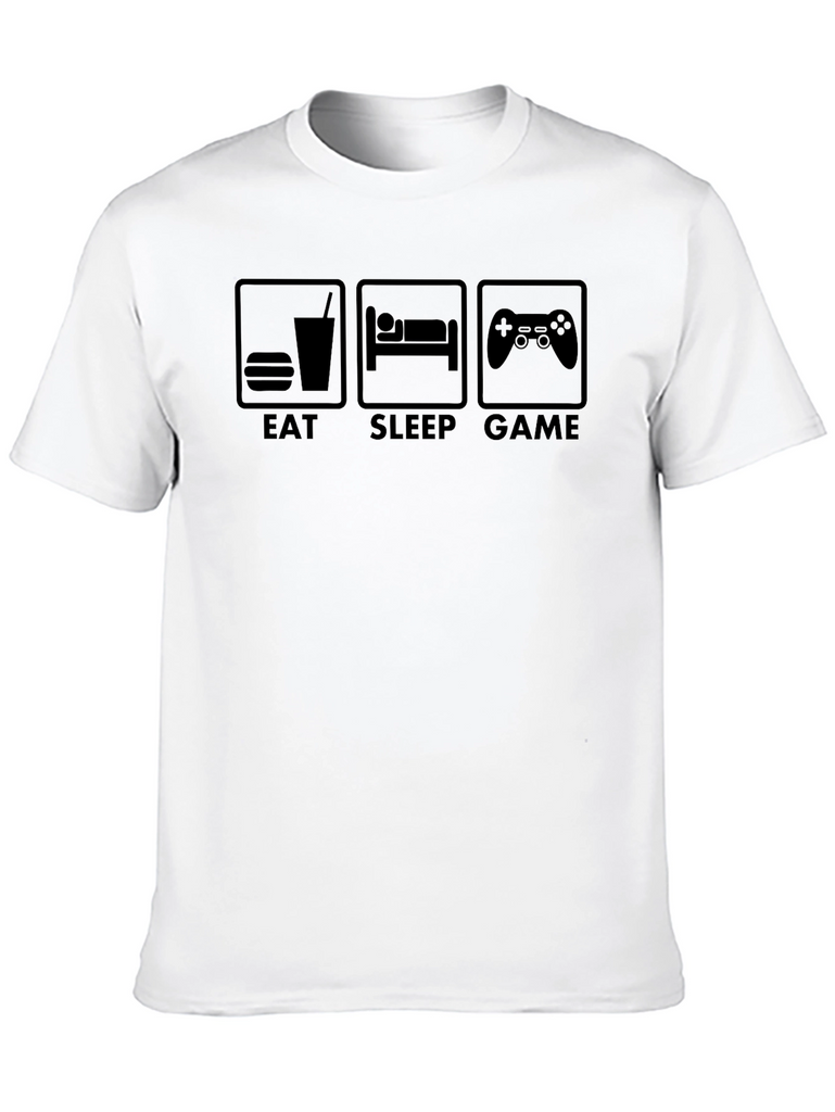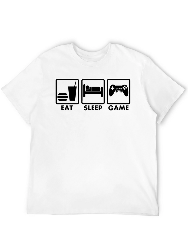 This black t-shirt features a fun and relatable "Eat Sleep Game" graphic. The design consists of minimalist icons representing each activity, making it a stylish and humorous choice for gamers and anyone who enjoys a good meal and a restful sleep. The shirt appears to be made of a comfortable, breathable fabric, perfect for casual wear and gaming sessions. Whether you're lounging at home, hanging out with friends, or attending a gaming convention, this t-shirt is a great way to express your passion. It's also an excellent gift for the gamer in your life. The classic black color ensures it pairs well with any outfit.
