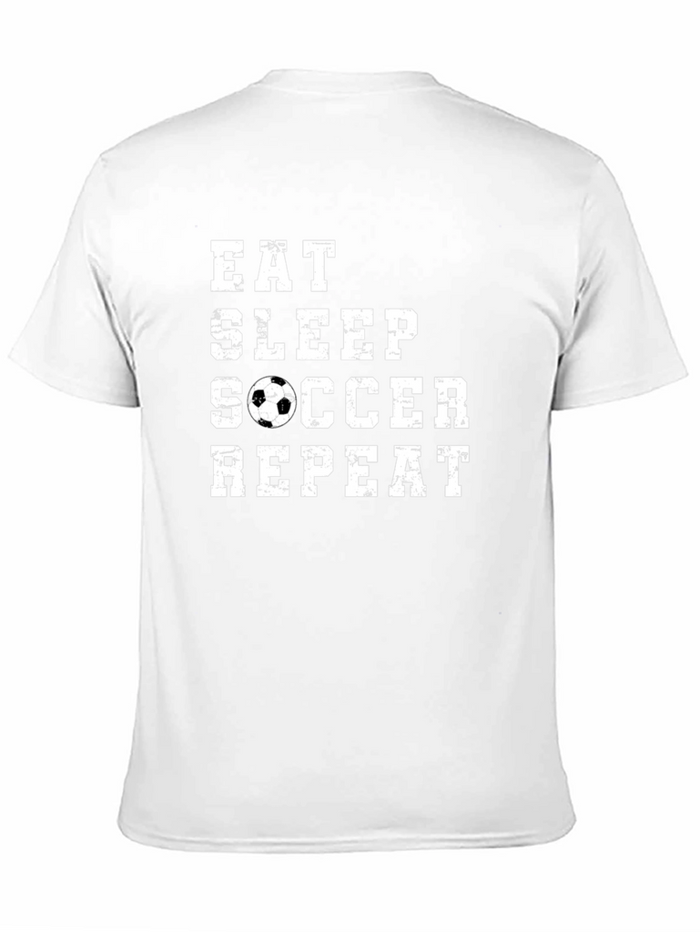 Score style points with this fun and sporty graphic tee! Featuring a bold "Eat Sleep Soccer Repeat" design, with a soccer ball replacing the letter O, this black t-shirt is perfect for soccer players and fans alike. Made from what appears to be a soft and comfortable cotton blend, this classic fit tee will keep you feeling good whether you're on the field, watching the game, or just hanging out. Show off your love for soccer with this eye-catching and stylish t-shirt, a must-have for any soccer enthusiast's wardrobe. It's a perfect gift for soccer players!