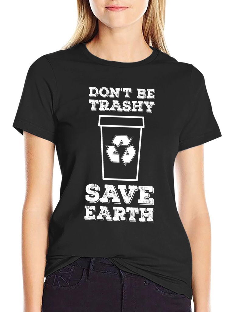 Show your commitment to the environment with this stylish black t-shirt featuring a bold, eco-conscious design. The shirt prominently displays the message "Don't Be Trashy" above a recycle bin graphic and "Save Earth" below it, all in a clean, white font. Made from a comfortable and breathable fabric, this tee is perfect for everyday wear. It's a great conversation starter and a simple way to promote environmental awareness. Wear it to school, work, or any casual occasion. Make a statement while making a difference with this unique and meaningful t-shirt.