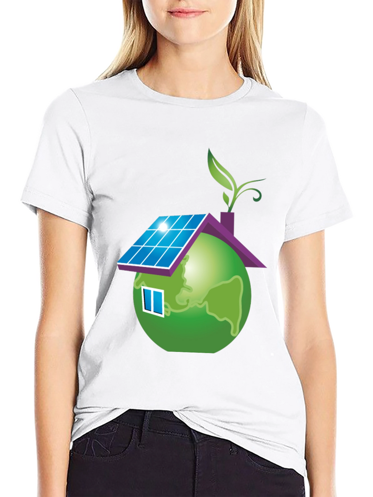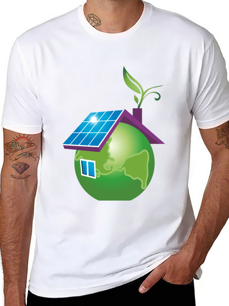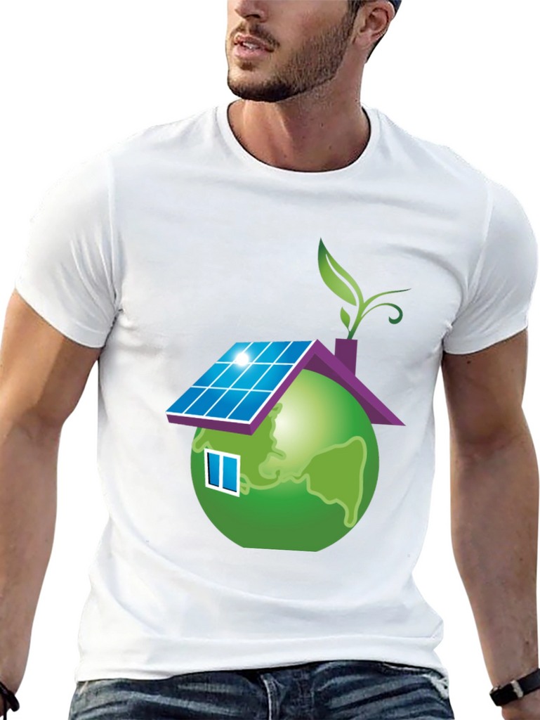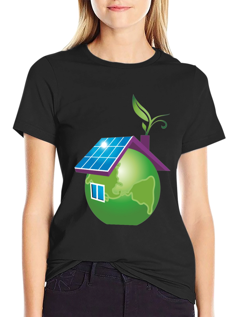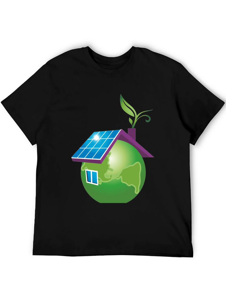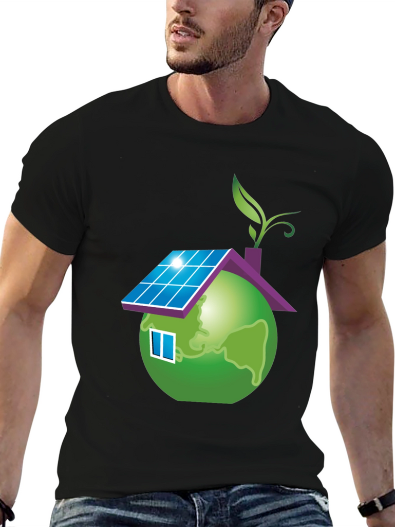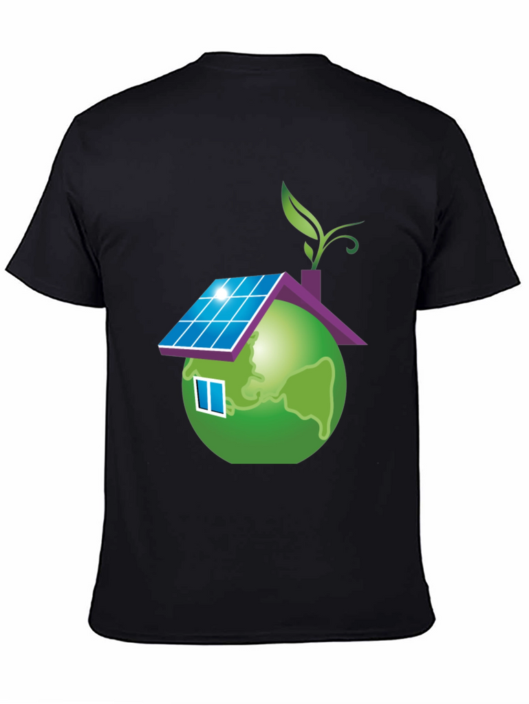 Show your love for the planet with this unique eco-friendly t-shirt. The design features a globe stylized as a house, complete with solar panels on the roof, a window, and a leafy sprout. This design represents sustainability and a commitment to green living. Made from a soft, comfortable fabric, this black t-shirt is perfect for everyday wear. It's a great way to make a statement and start conversations about environmental awareness. Wear it to school, casual outings, or environmental events to promote a greener future.