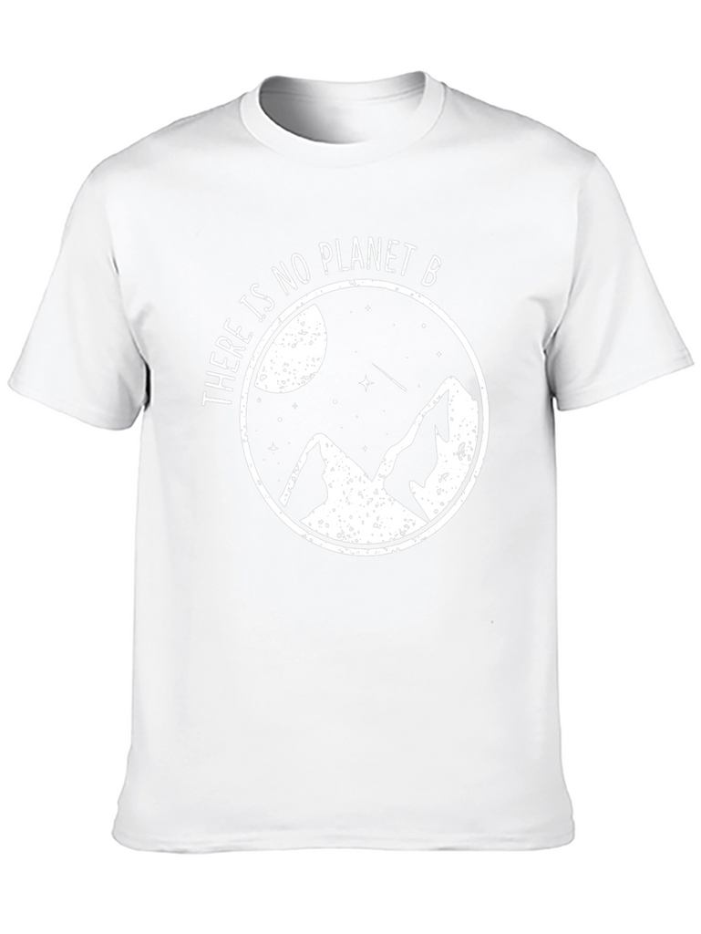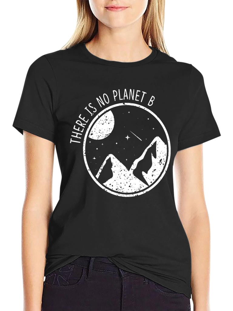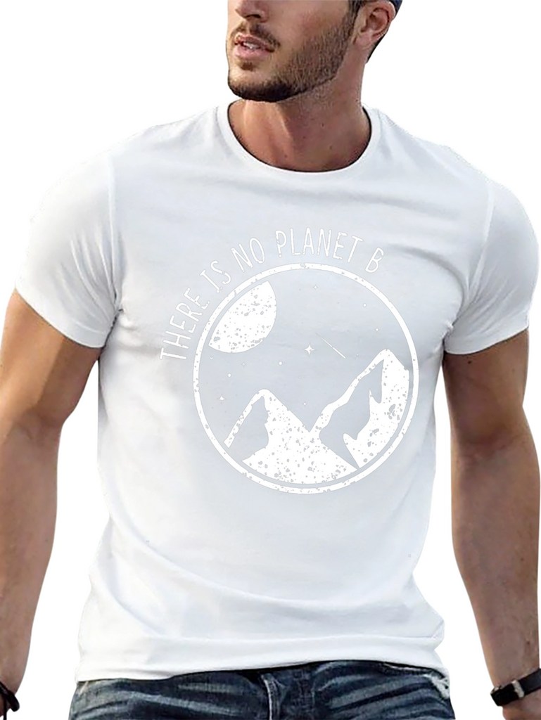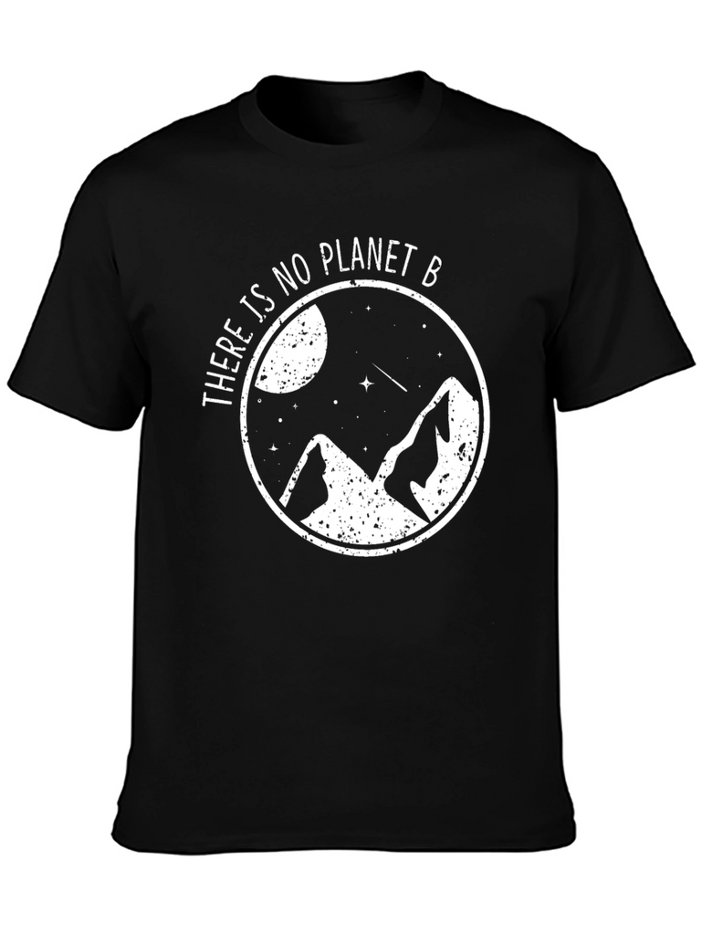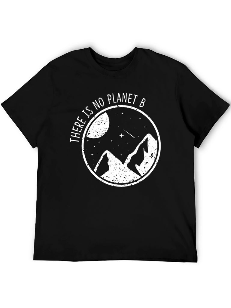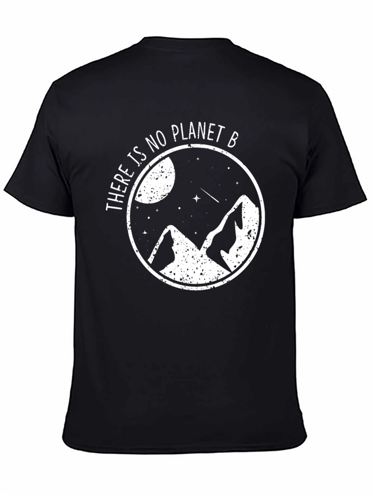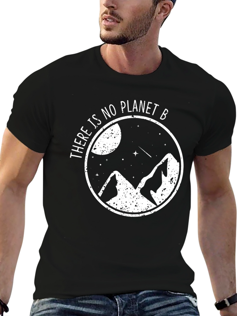 Show your love for the planet with this stylish black t-shirt. Featuring a white graphic design of mountains, stars, and a moon encapsulated in a circle with the phrase "There is no Planet B". This tee is made from a comfortable-looking, breathable fabric, perfect for everyday wear or outdoor adventures. The design advocates for environmental awareness and sustainability. Makes a great gift for eco-conscious friends and family. Pair it with jeans or shorts for a casual, effortless look. Add this unique and meaningful piece to your wardrobe today!