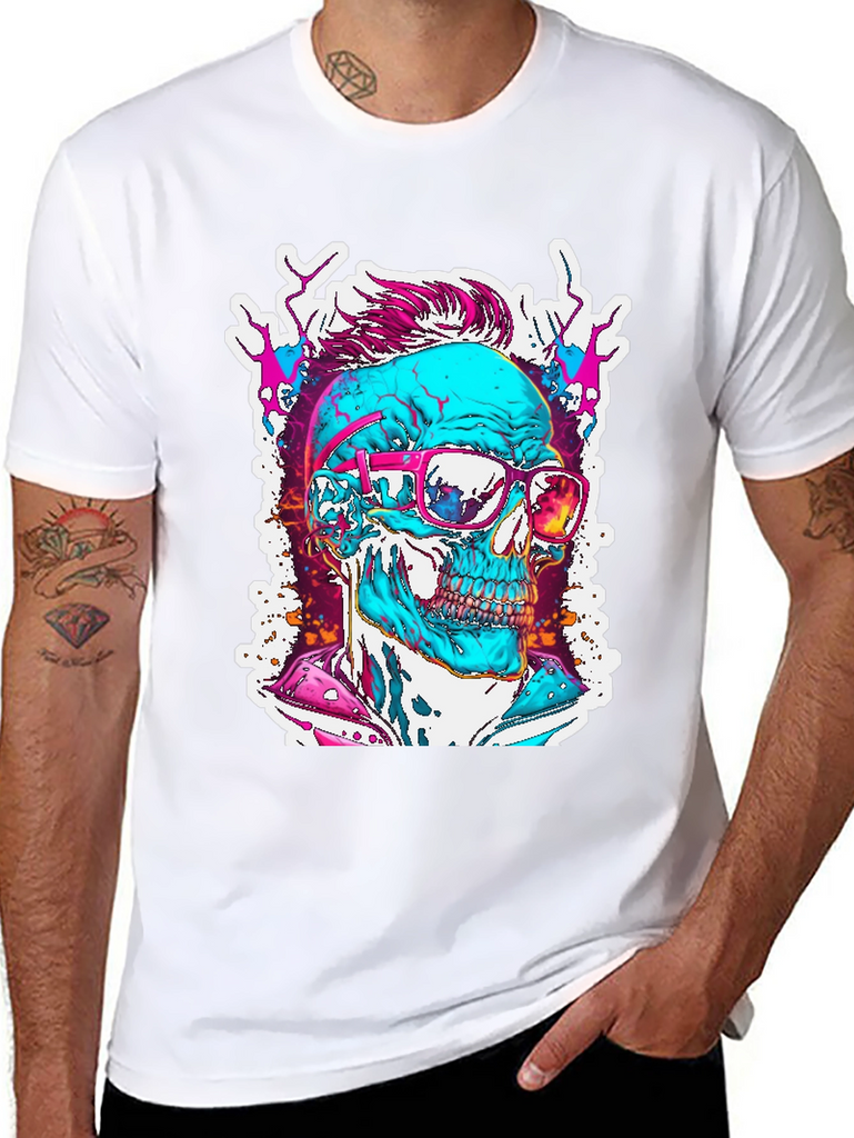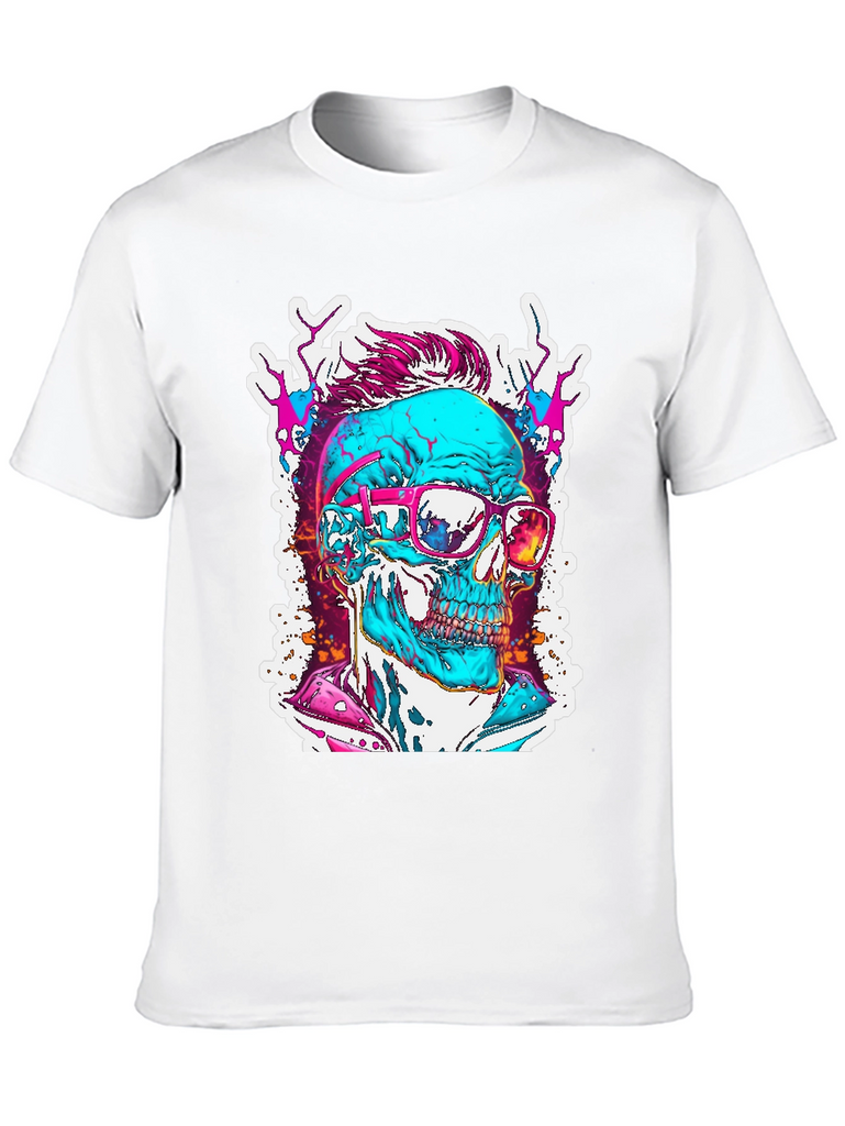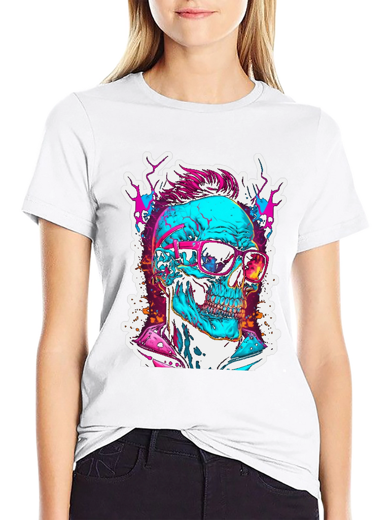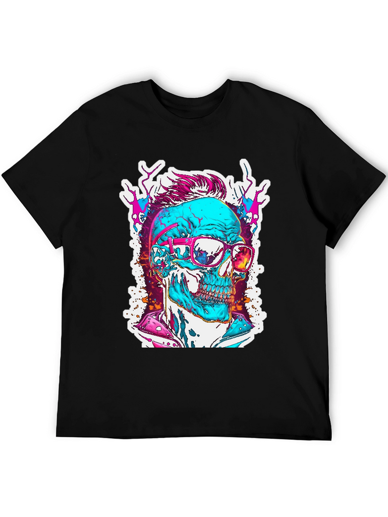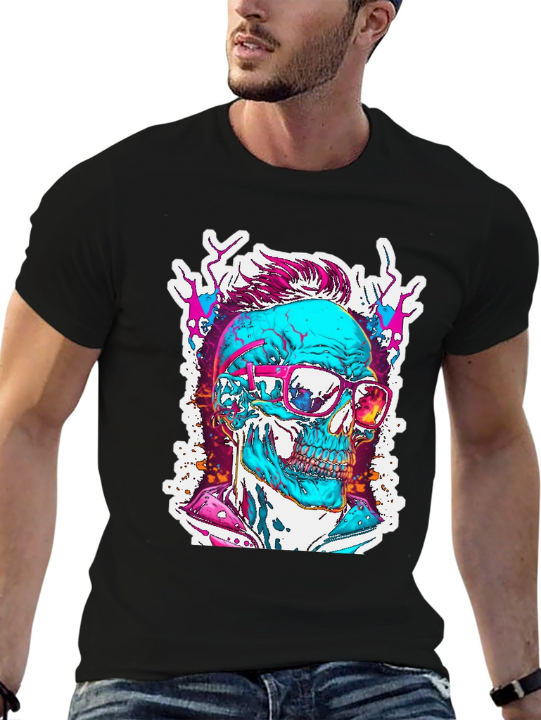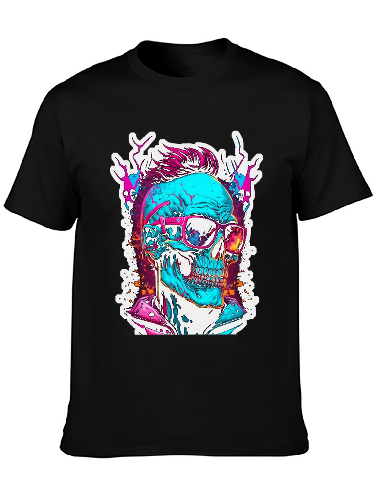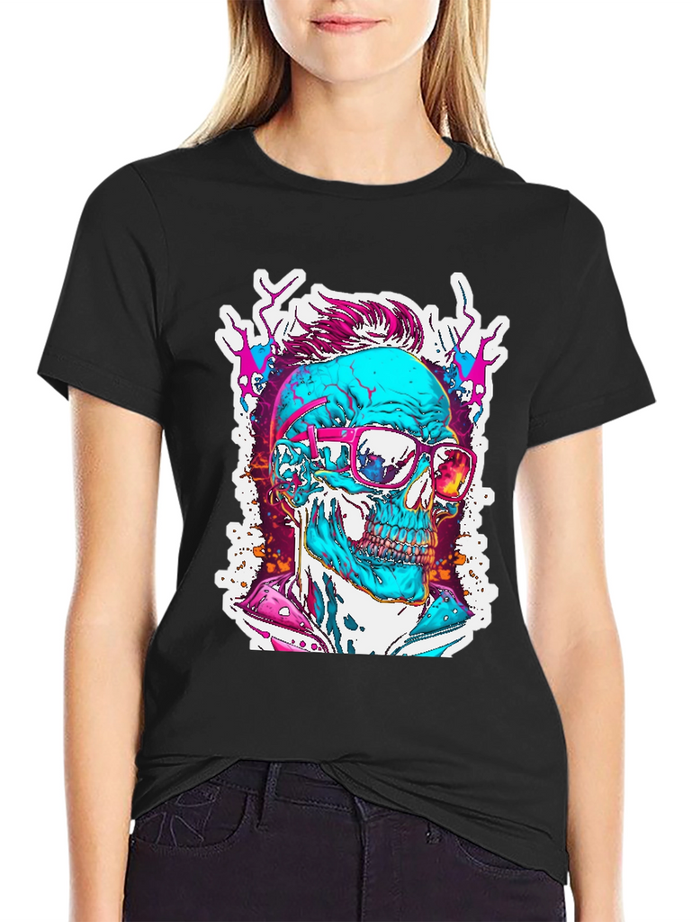 Make a statement with this eye-catching black tee featuring a vibrant skull graphic. The design showcases a teal skull with punk pink hair, stylish glasses, and cool artistic flair. The unique color scheme and bold illustration are sure to turn heads. Made from a soft, comfortable fabric, this t-shirt is perfect for everyday wear or to add an edgy touch to any outfit. Ideal for concerts, casual outings, or as a gift for those who love alternative fashion. Express your individuality with this striking graphic tee.