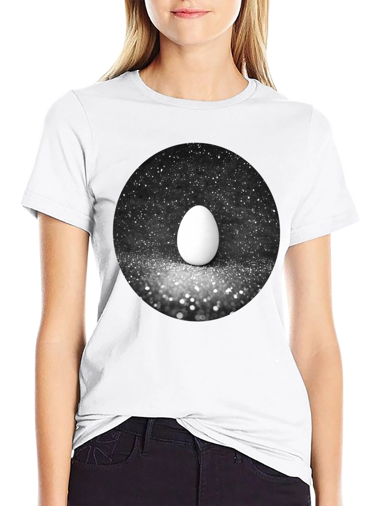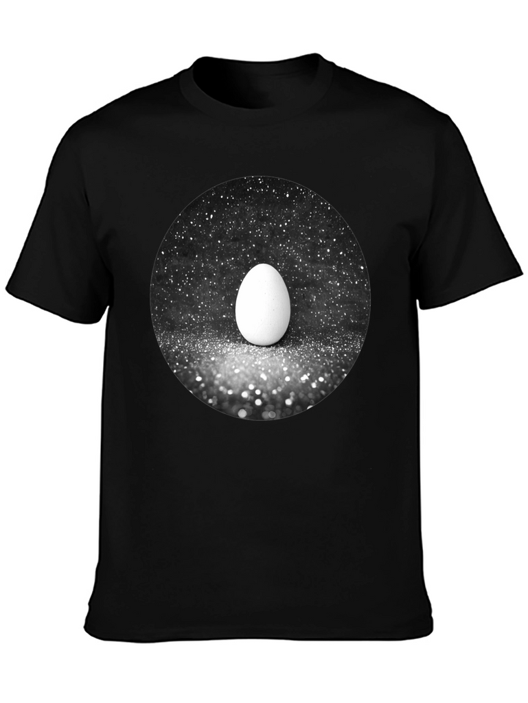 Showcase your unique style with this eye-catching black t-shirt. The design features a single, white egg centered in a stunning, galaxy-like background of shimmering specks. This visually striking image is sure to turn heads and spark conversations. Made from a comfortable, breathable fabric, this tee is perfect for everyday wear. Whether you're looking to express your individuality or simply add a cool piece to your wardrobe, this egg galaxy t-shirt is an excellent choice. Dress it up or down for versatile styling options. Get yours today and stand out from the crowd!