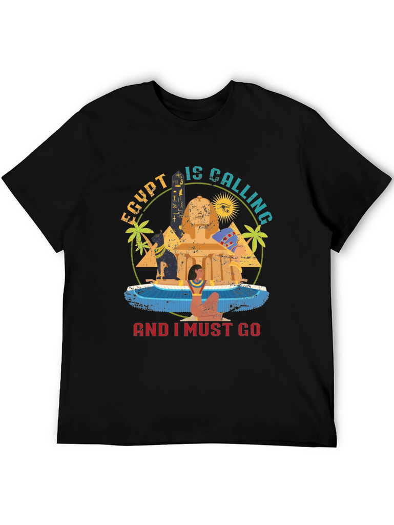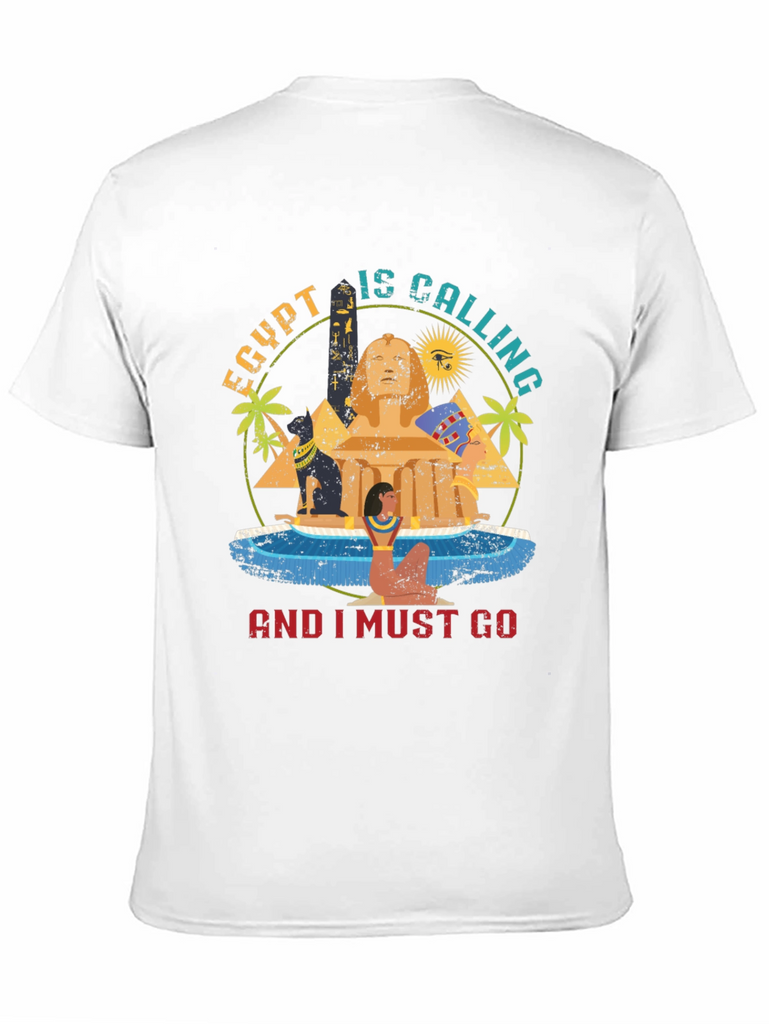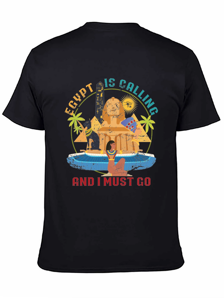 Journey back in time with this captivating graphic tee. Featuring an eye-catching design, it showcases iconic Egyptian imagery including the Sphinx, pyramids, and hieroglyphics. The phrase "Egypt Is Calling And I Must Go" is prominently displayed, perfect for travel enthusiasts and history buffs alike. The vibrant colors and distressed print give it a vintage feel. Made from soft, breathable fabric, this t-shirt offers both comfort and style. Wear it on your next adventure or simply to express your love for ancient civilizations. A unique and fashionable addition to any wardrobe!