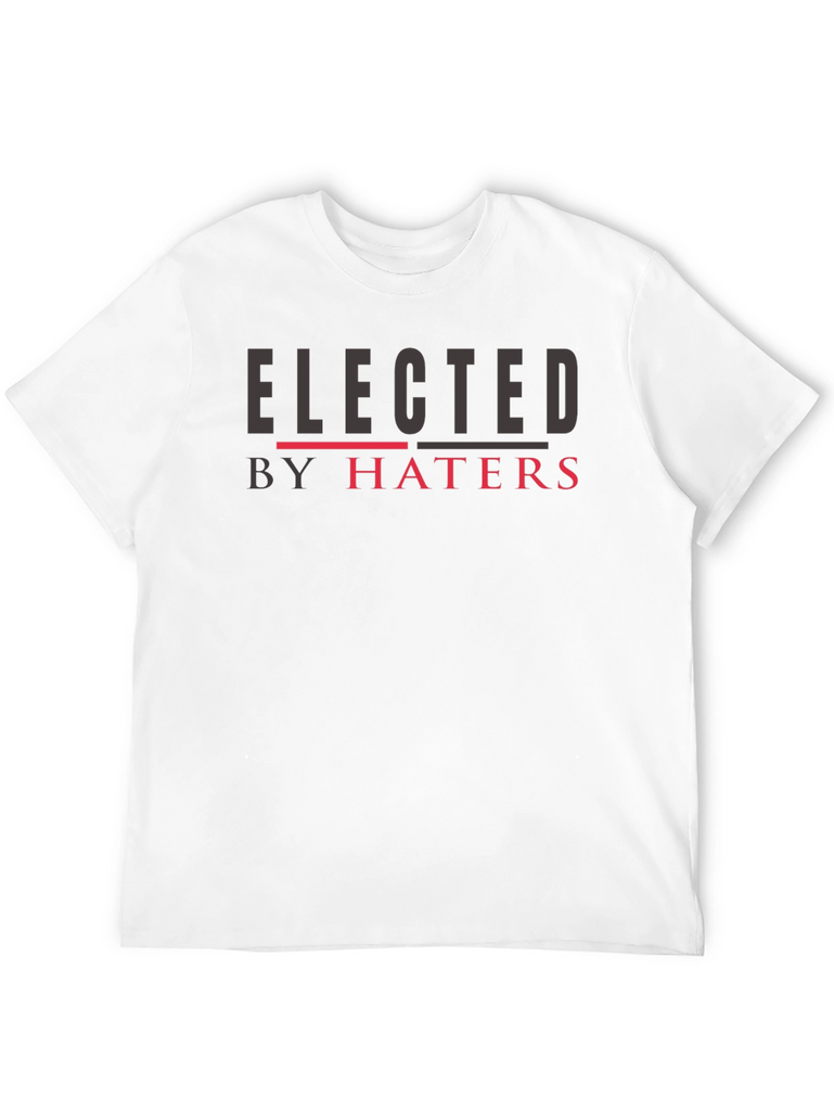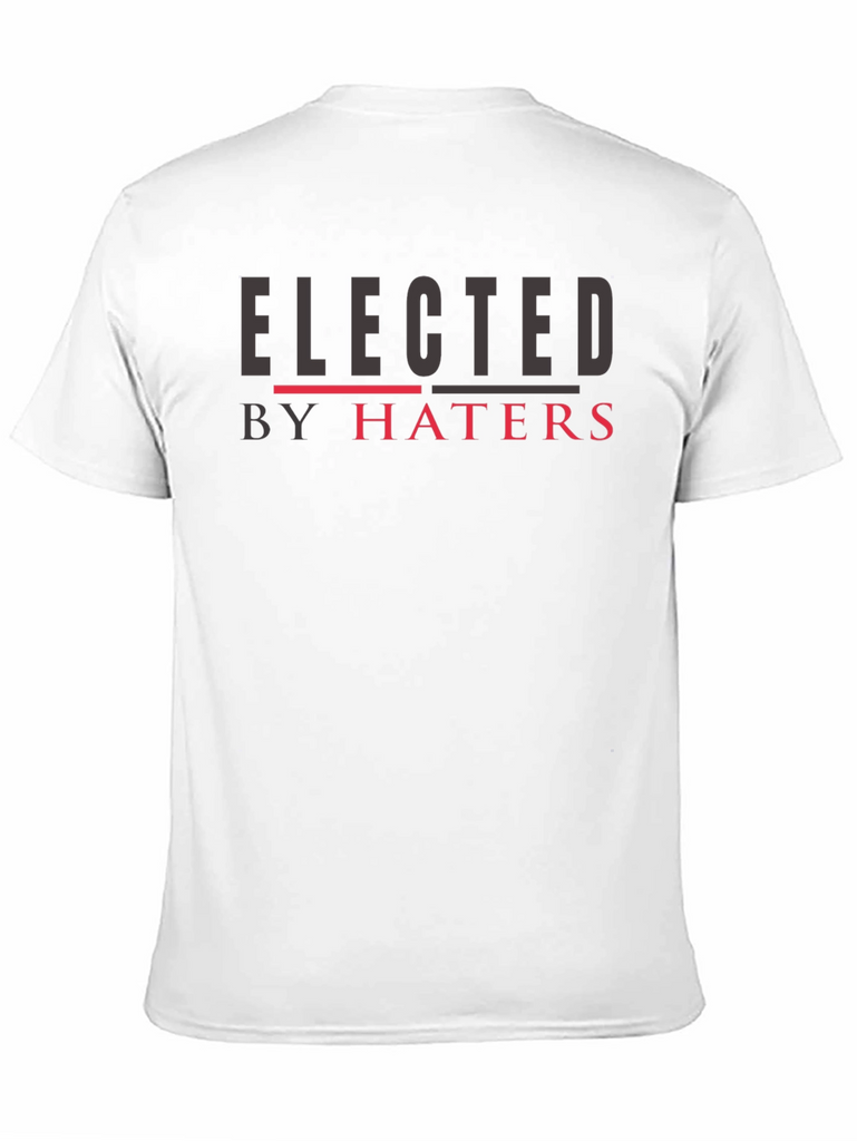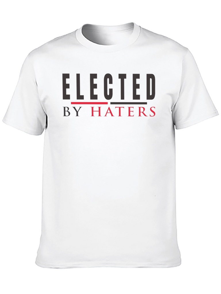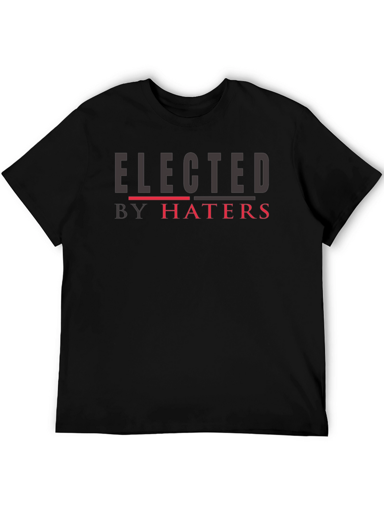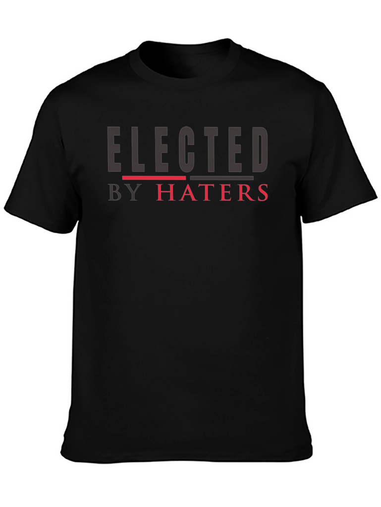 Show off your sense of humor with this bold graphic tee. This classic black t-shirt features the text 'ELECTED by HATERS', with 'ELECTED' in grey, 'HATERS' in a striking red, and a horizontal line between them. Crafted from comfortable materials, this shirt is perfect for casual wear. Makes a great conversation starter! Ideal for social gatherings, rallies, or just everyday wear. Stand out from the crowd with this politically-themed tee.