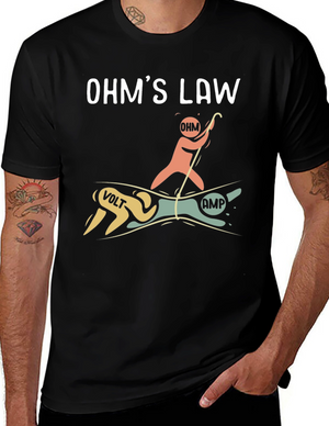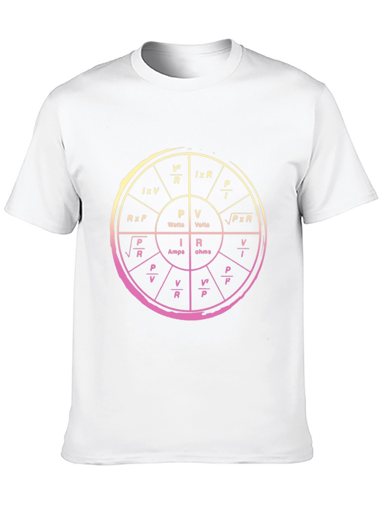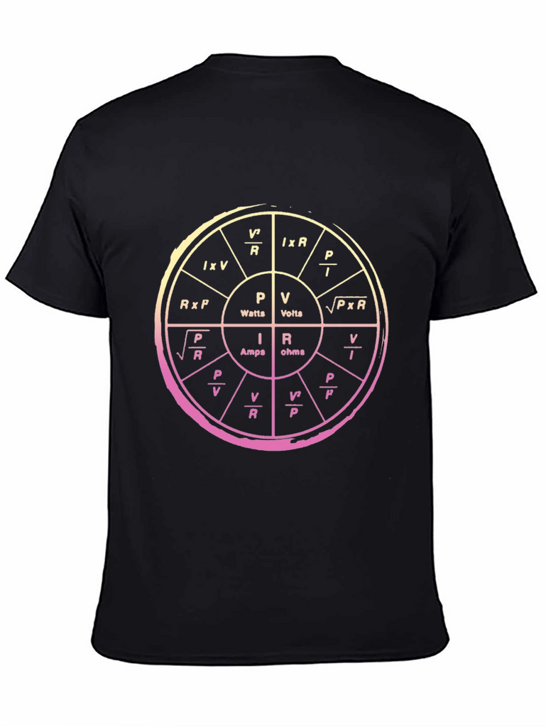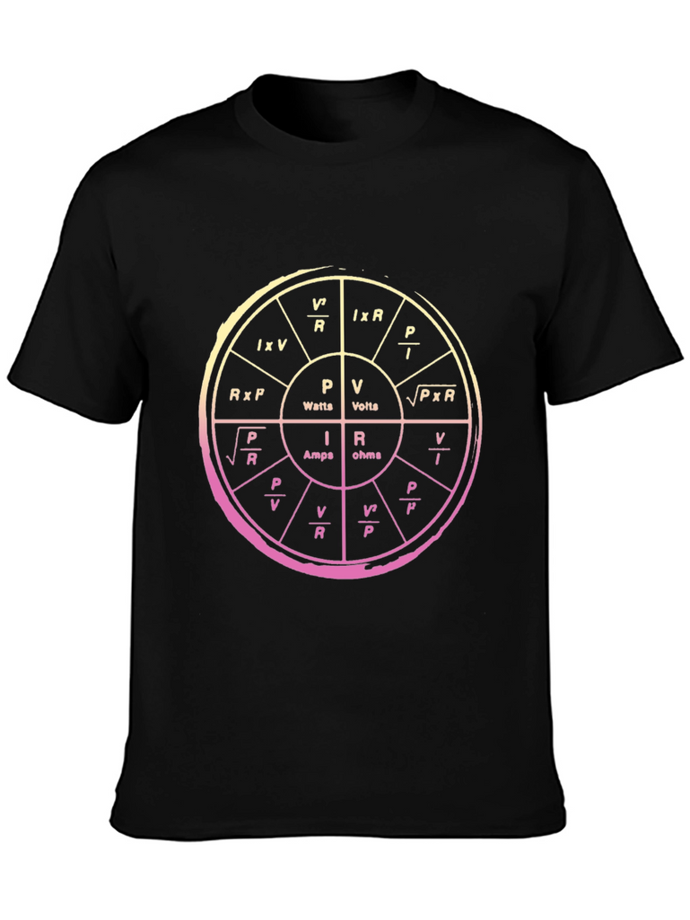 Show off your love for electrical engineering with this unique t-shirt. The design features a circular diagram displaying Ohm's Law formulas, including power, voltage, current, and resistance. The print showcases a vibrant gradient color scheme that transitions from yellow to pink, providing a visually appealing contrast against the black fabric. Made from comfortable and breathable material, this shirt is perfect for everyday wear, science enthusiasts, and engineering students. It's a great conversation starter and a stylish way to display your knowledge and passion for electronics. Ideal for casual outings, classroom settings, or as a gift for the science geek in your life!