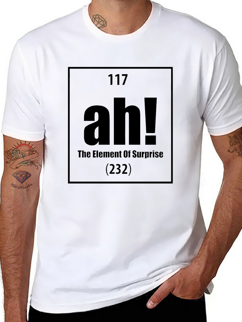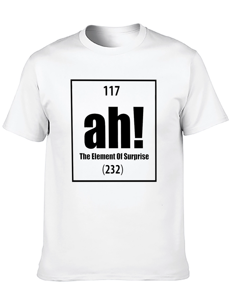 This black t-shirt features a clever design resembling an element on the periodic table. Boldly printed is 'ah!' with the number 117 above and '(232)' below, and the words 'The Element of Surprise' printed in between. The design is printed in a matching black that gives it a more stealthy and subtle look. Made from what appears to be a soft, comfortable fabric, this shirt is perfect for casual wear, science enthusiasts, or anyone with a quirky sense of humor. It's a unique conversation starter and a fun way to express your personality. Pair it with jeans, shorts, or your favorite casual bottoms for a relaxed and stylish look.