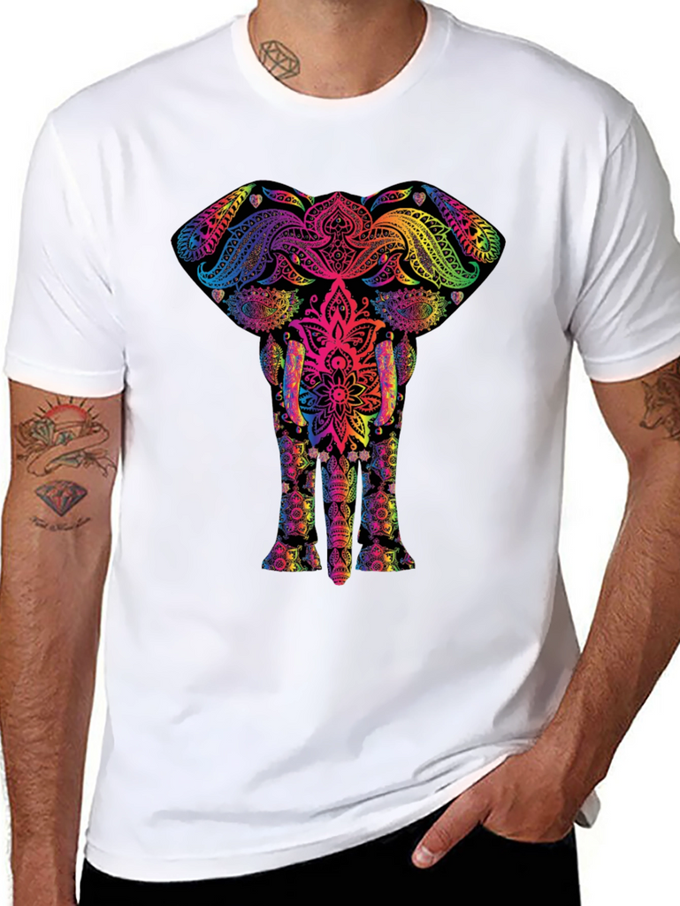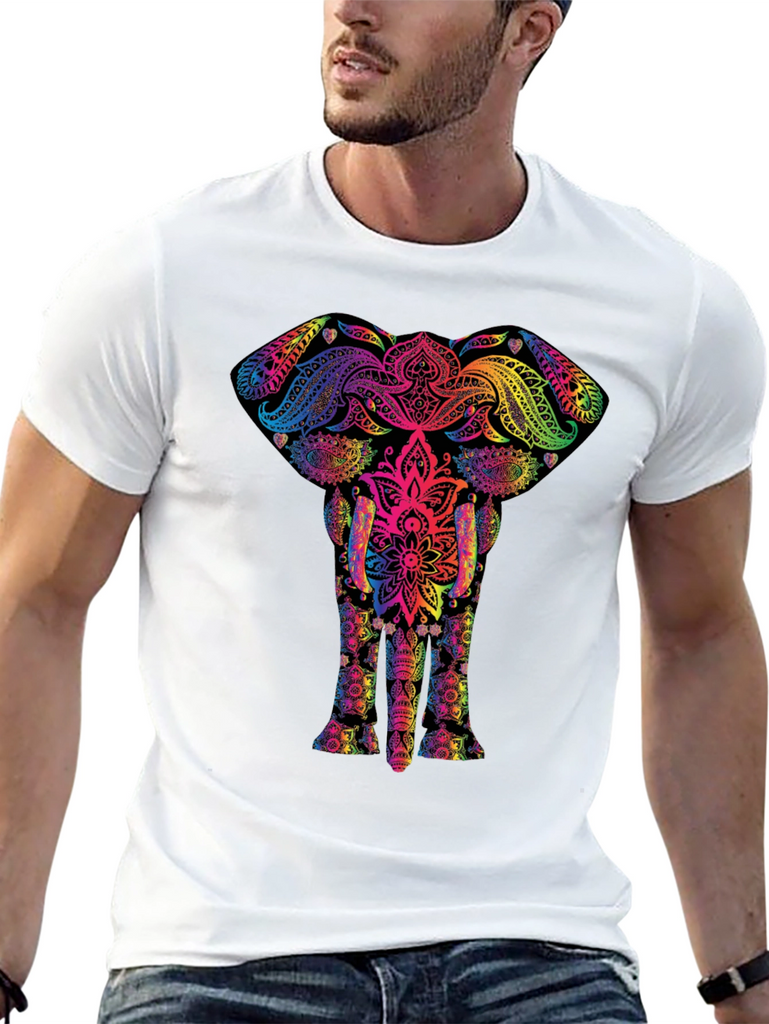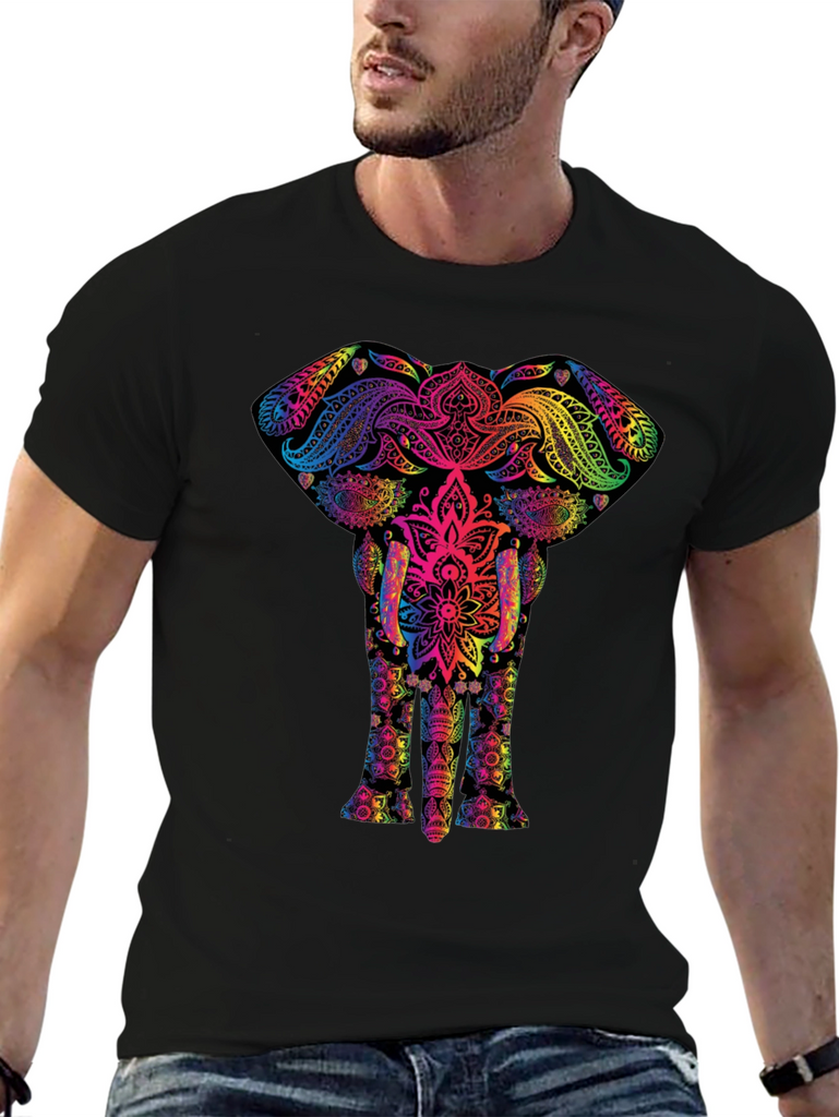 Stand out in this unique black t-shirt featuring a vibrant, rainbow-colored elephant mandala design. The intricate pattern blends traditional art with modern style, creating a visually stunning piece. Made from a soft, breathable fabric, this shirt ensures comfort and durability. Perfect for casual wear, festivals, or expressing your individuality. Pair it with jeans or shorts for a stylish, eye-catching look. A great addition to any wardrobe, this elephant mandala tee is sure to turn heads and spark conversations. Show off your unique style and love for art with this must-have t-shirt.