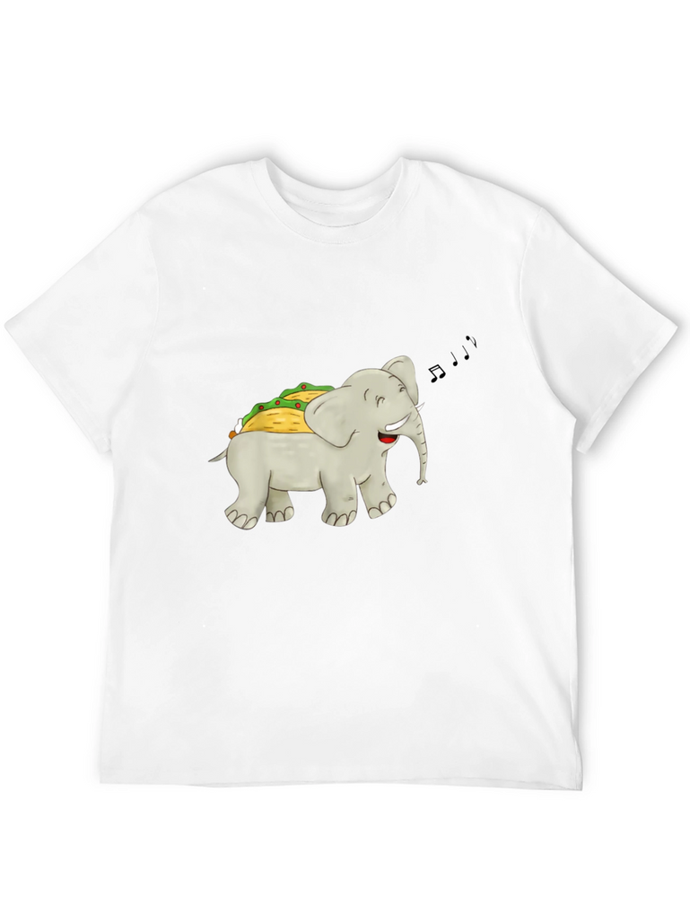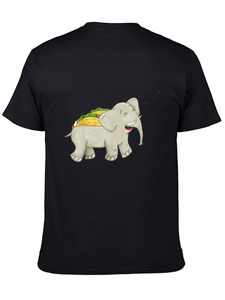 This unique t-shirt features a whimsical graphic of an elephant carrying a taco on its back, appearing to happily sing along. The design is printed on a comfortable, likely cotton blend, black t-shirt. The playful and humorous design makes it a great conversation starter and a fun addition to any wardrobe. This tee is perfect for casual outings, parties, or anyone who loves quirky and original clothing. Show off your fun side with this eye-catching elephant taco tee!