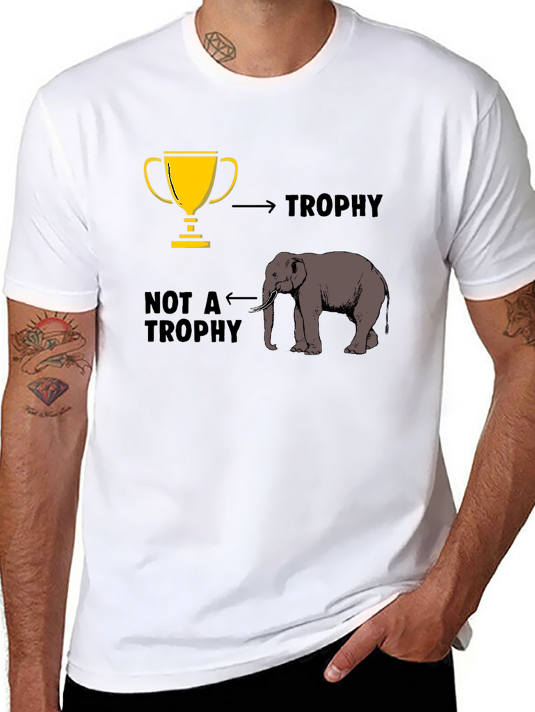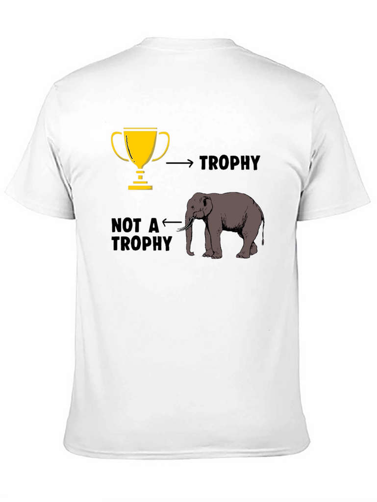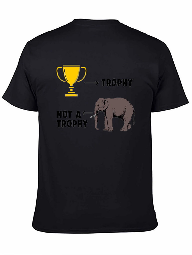 Make a statement with this unique graphic t-shirt. The black tee features a clever design with a trophy illustration and an elephant, accompanied by the text "Trophy" and "Not A Trophy", promoting wildlife conservation awareness. Made from comfortable, breathable fabric, this shirt is perfect for everyday wear. The design is printed with high-quality ink for long-lasting vibrancy. Show your support for elephants and add a touch of humor to your wardrobe with this eye-catching t-shirt. Ideal for casual outings, social gatherings, or as a thoughtful gift for animal lovers.