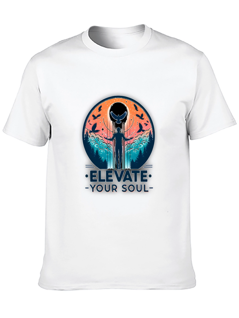 Showcase your spiritual side with this unique graphic t-shirt. The black tee features an eye-catching design with a stylized illustration of a person connecting with nature. The design includes birds, trees, and the phrase "Elevate Your Soul", suggesting themes of enlightenment and personal growth. Made from a comfortable-looking material, this shirt is perfect for casual wear, spiritual gatherings, or as a meaningful gift. Express yourself with this inspiring and artistic tee!