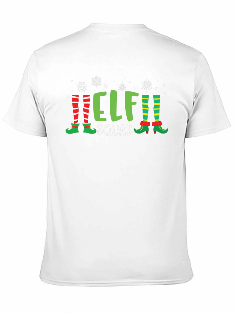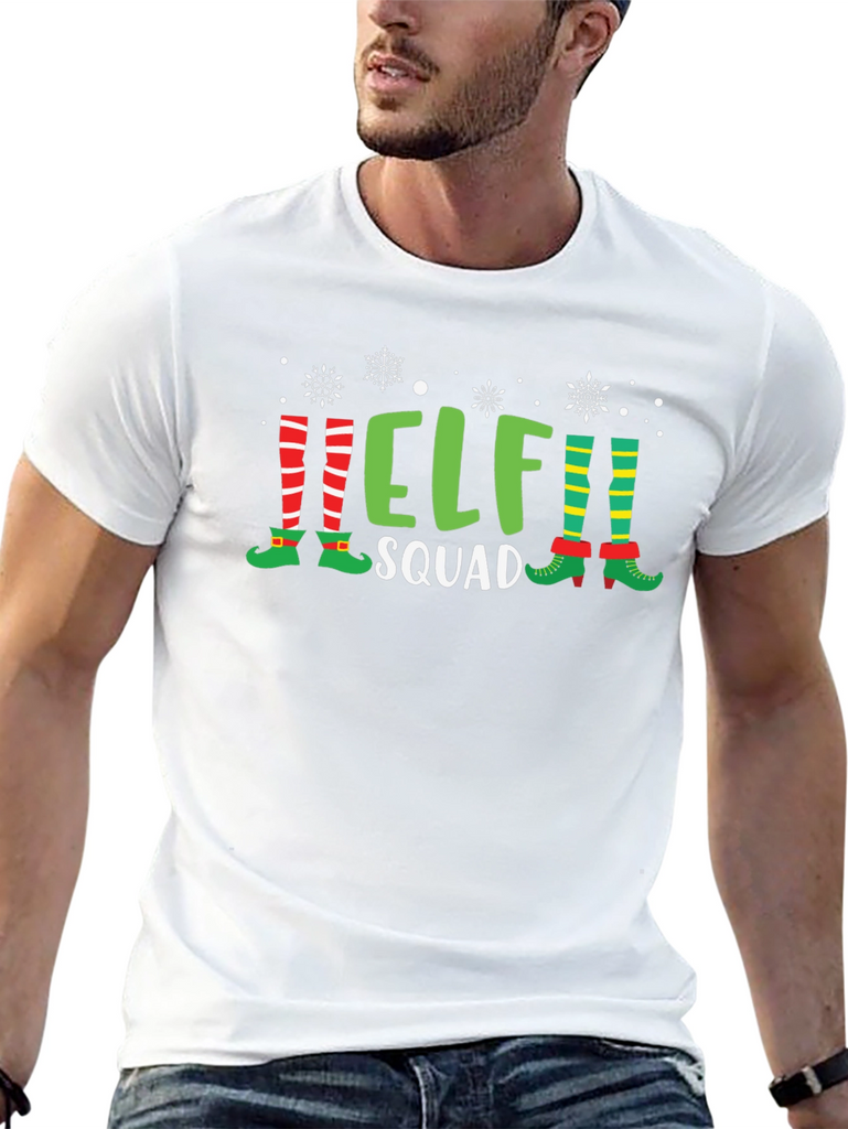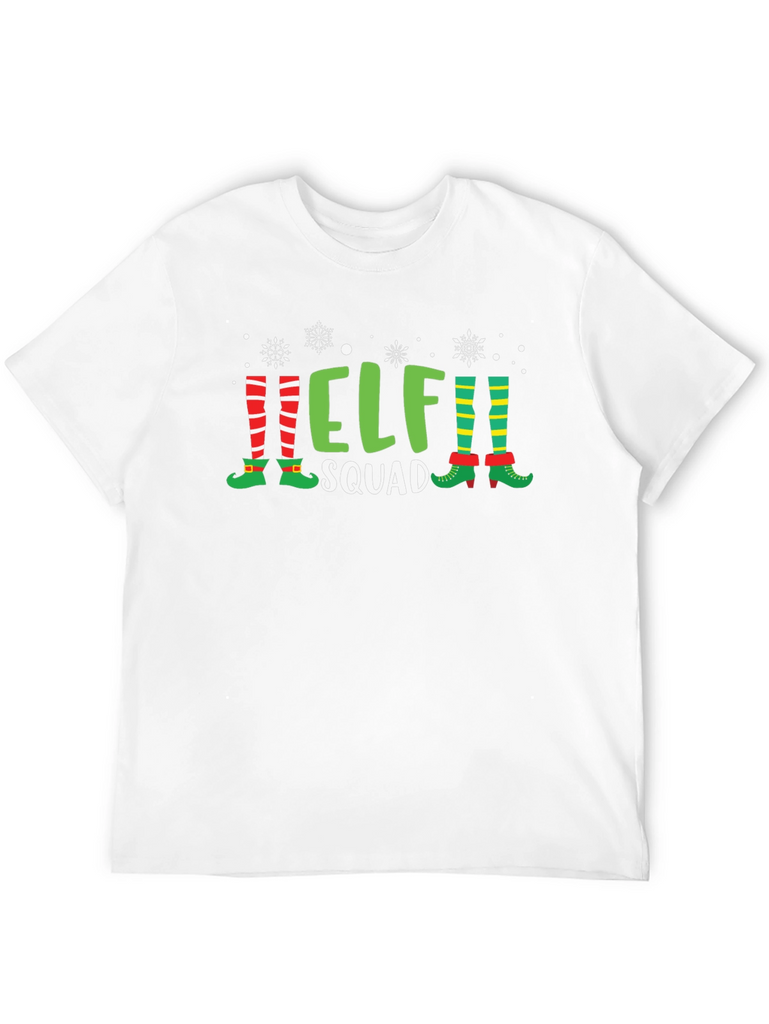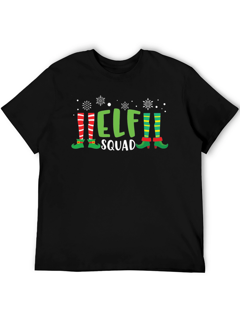 Get ready for the holidays with this fun Elfie Squad T-Shirt! The black tee features a playful design with striped elf legs and festive snowflakes. The bright colors and unique design make this shirt perfect for Christmas parties, family gatherings, or just spreading holiday cheer. Show off your festive spirit with this comfortable and eye-catching t-shirt.