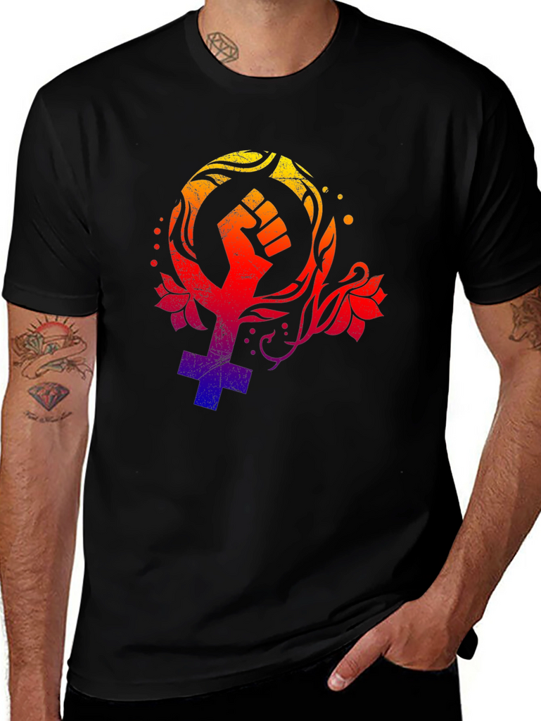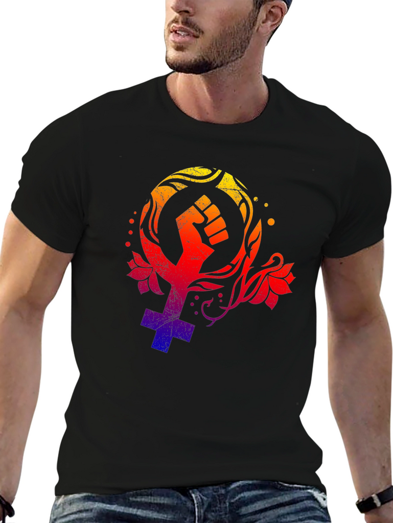 Show your support for equality with this striking black t-shirt. The eye-catching design features a vibrant, gradient fist emerging from the female symbol, surrounded by ornate floral details. The gradient transitions smoothly from yellow to orange, red, and blue, adding a modern and artistic touch. Made from comfortable, breathable fabric, this tee is perfect for everyday wear, rallies, or expressing your values. Make a statement and spark conversations with this stylish and meaningful t-shirt. Wear your beliefs with pride!