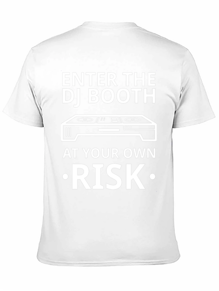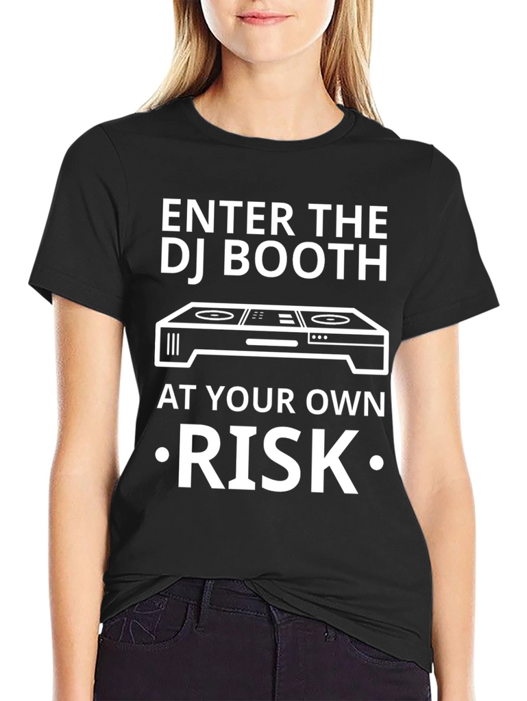 This black t-shirt features a bold, white graphic design that's perfect for music lovers and DJs. The design showcases the phrase "ENTER THE DJ BOOTH" above an image of a DJ mixer, followed by "AT YOUR OWN •RISK•". Made from a comfortable-looking fabric, this shirt is ideal for casual wear, concerts, or DJing gigs. Its humorous message adds a touch of personality and is sure to grab attention. Whether you're a DJ yourself or simply appreciate good music, this tee makes a statement.