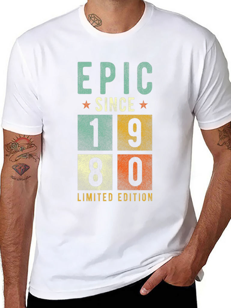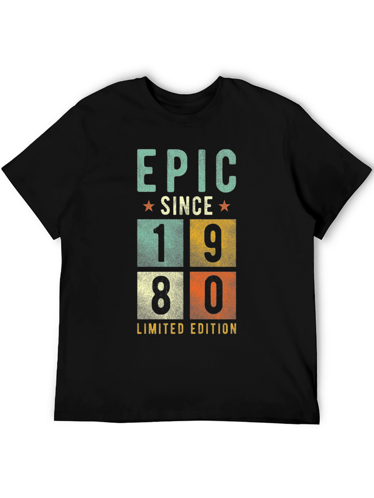 Celebrate a legendary year with this vintage-inspired 'Epic Since 1980' t-shirt! This black tee features a distressed design with a retro color palette. The print showcases the word 'EPIC' above the phrase 'SINCE' flanked by stars, and the year '1980' displayed in individual blocks of teal, yellow, beige and orange. Below that the phrase 'Limited Edition' is written. Made from a soft, comfortable fabric, this shirt is perfect for casual wear, birthday celebrations, or as a unique gift. Its timeless design will add a touch of nostalgia to your wardrobe. Show off your birth year, or give the gift of laughter to a 1980 baby. Get yours today!