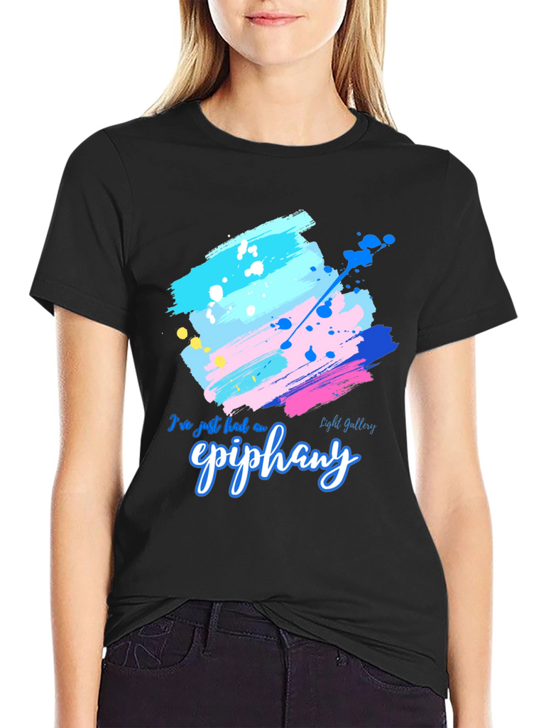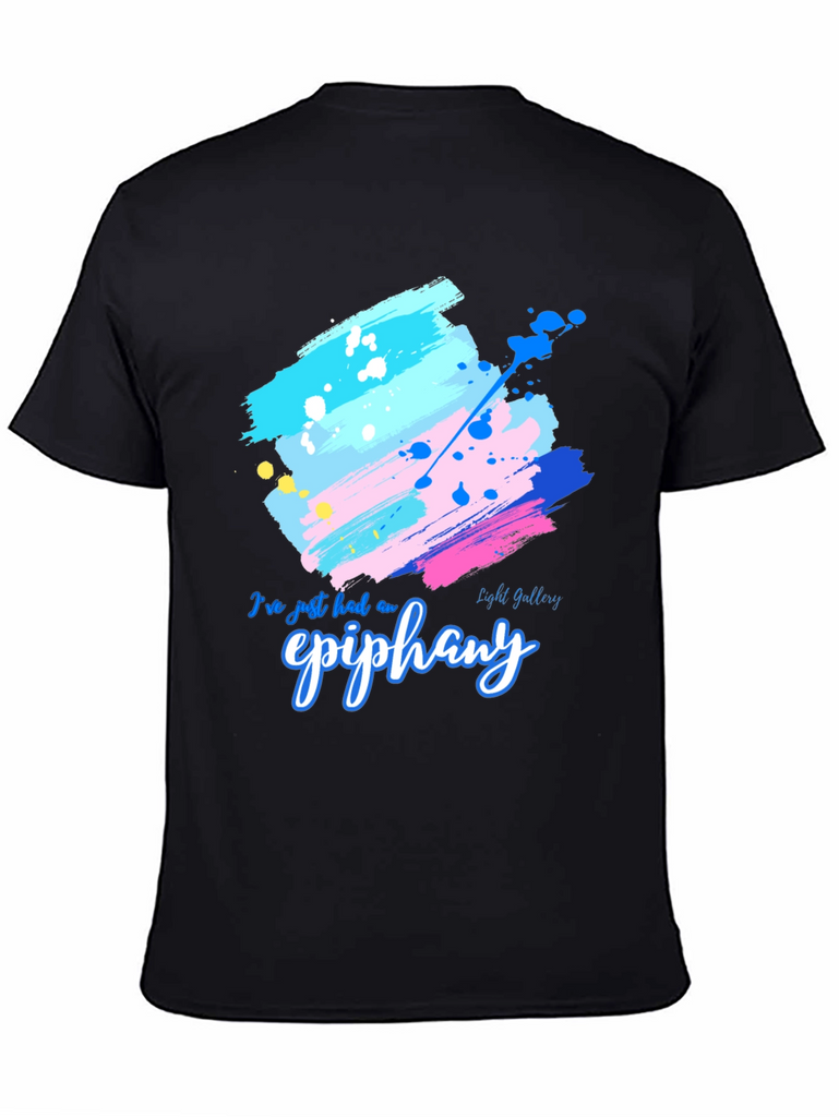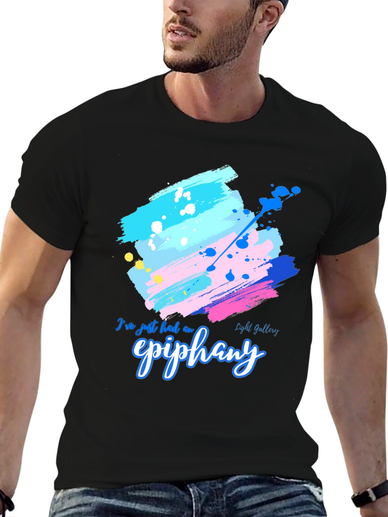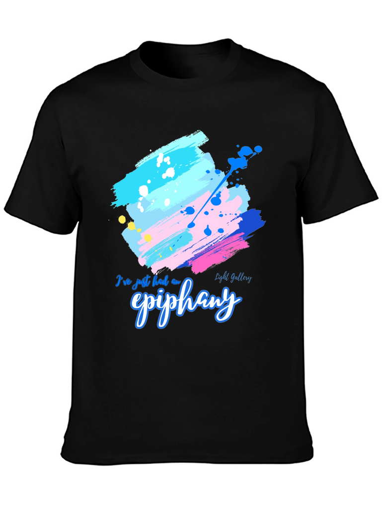Embrace inspiration with this unique black T-shirt featuring a vibrant, abstract paint stroke design. The colorful splashes of blue, pink, and white create an eye-catching effect, while the playful 'I've just had an epiphany' lettering adds a touch of whimsy. Crafted from a comfortable, breathable fabric, this tee is perfect for casual wear and expressing your creative spirit. Pair it with jeans or shorts for a relaxed yet stylish look. Ideal for art lovers, thinkers, and anyone who appreciates a pop of color in their wardrobe.