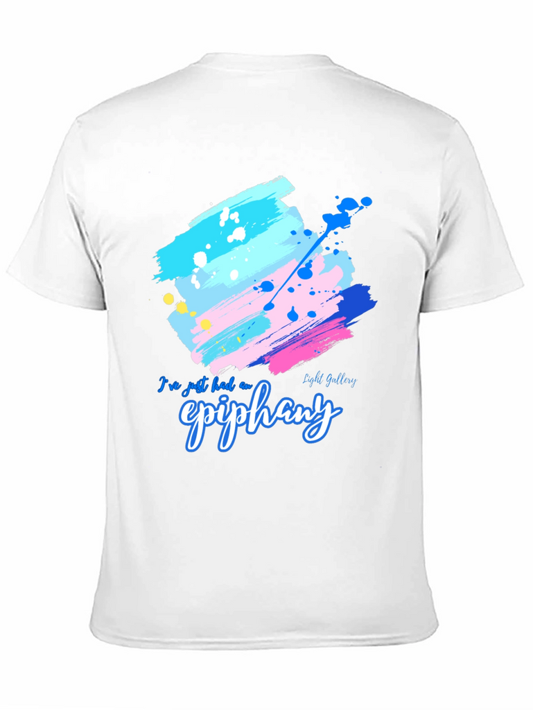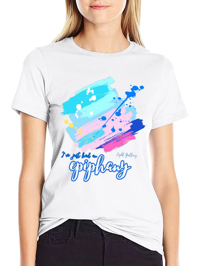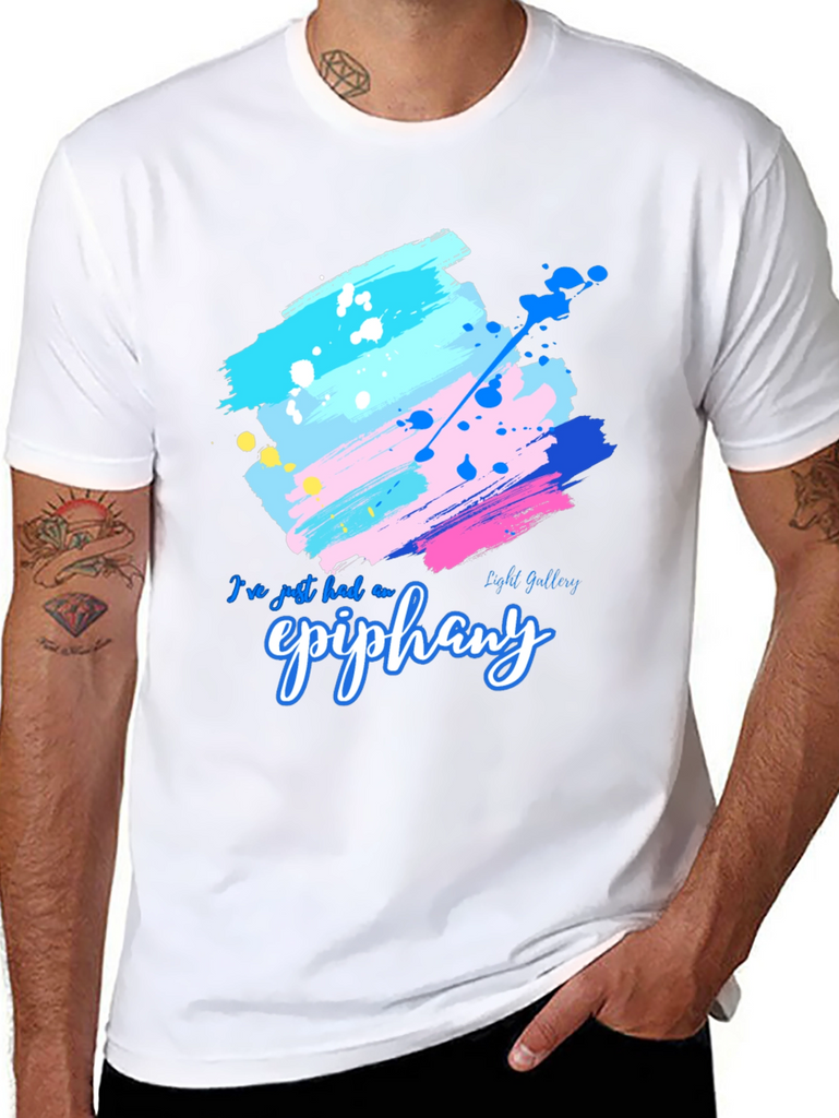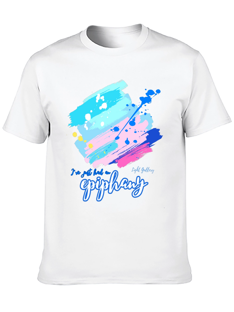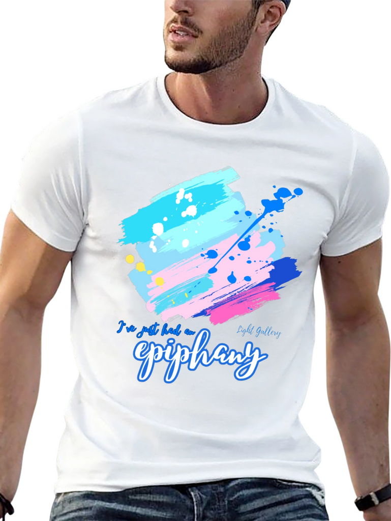 Embrace inspiration with this unique black T-shirt featuring a vibrant, abstract paint stroke design. The colorful splashes of blue, pink, and white create an eye-catching effect, while the playful 'I've just had an epiphany' lettering adds a touch of whimsy. Crafted from a comfortable, breathable fabric, this tee is perfect for casual wear and expressing your creative spirit. Pair it with jeans or shorts for a relaxed yet stylish look. Ideal for art lovers, thinkers, and anyone who appreciates a pop of color in their wardrobe.