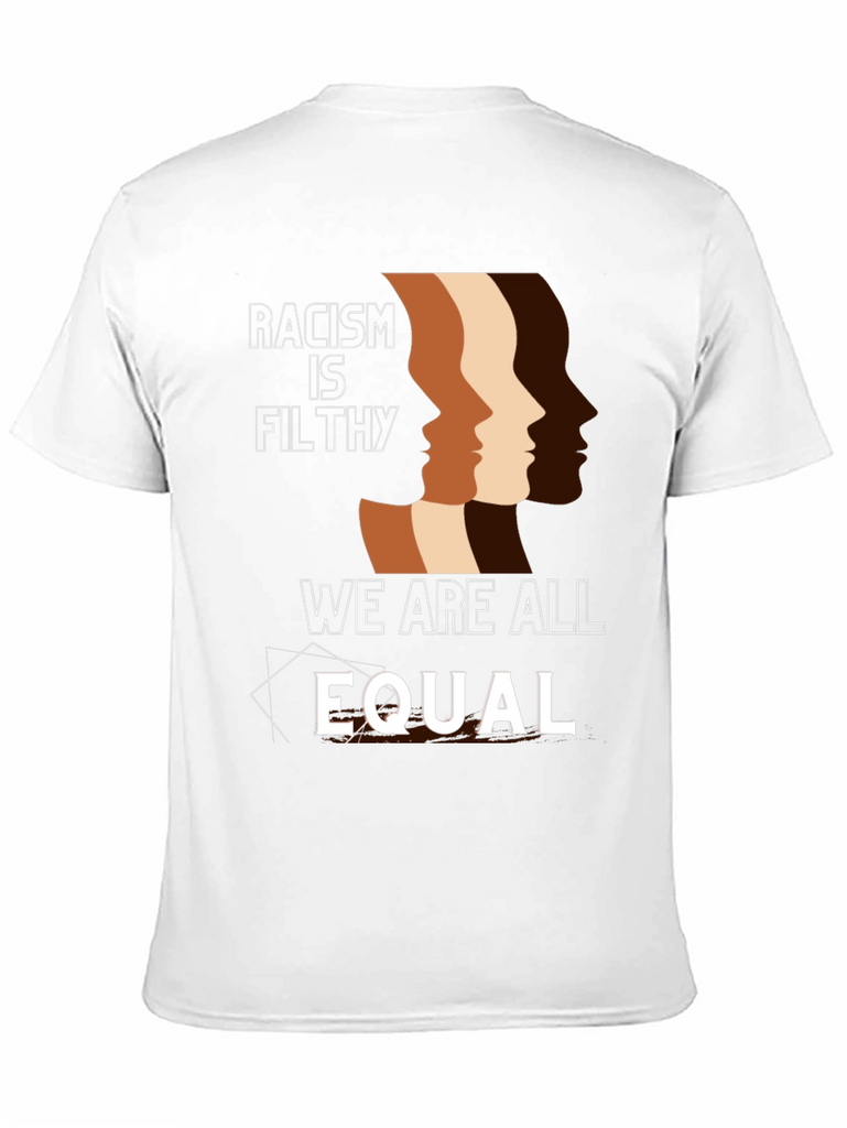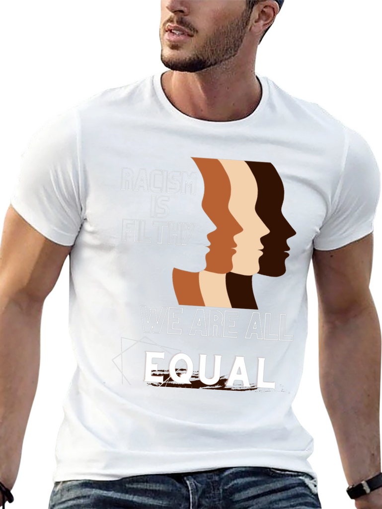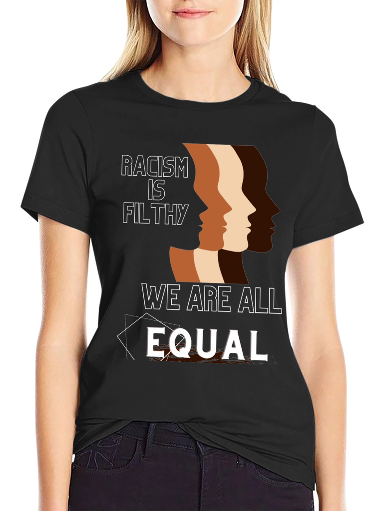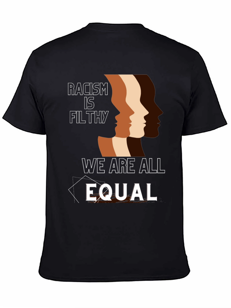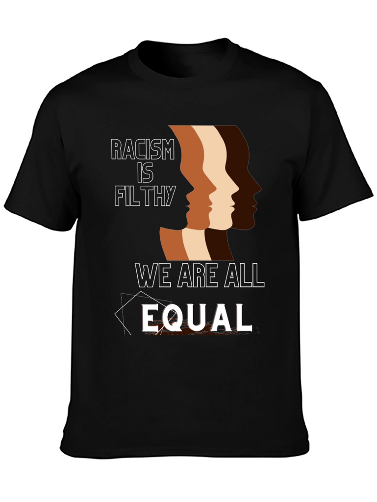 Show your support for equality with this powerful statement t-shirt. The black tee features the message "Racism is Filthy. We Are All Equal" in bold lettering, accompanied by silhouettes of diverse faces. The design is printed prominently on the front, making it a wearable expression of solidarity. Made from a comfortable-looking fabric, this t-shirt is perfect for casual wear, rallies, or everyday activism. It's a meaningful way to spark conversations and promote a message of unity and inclusivity. Wear your values with pride!