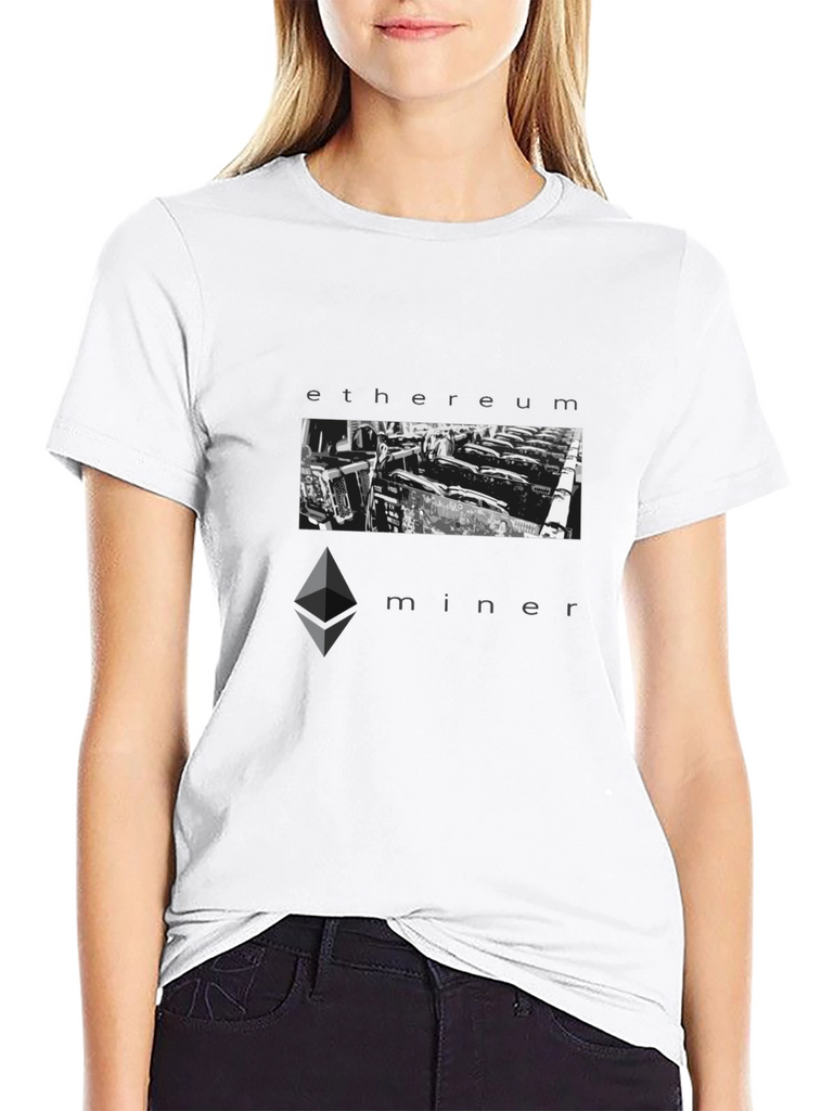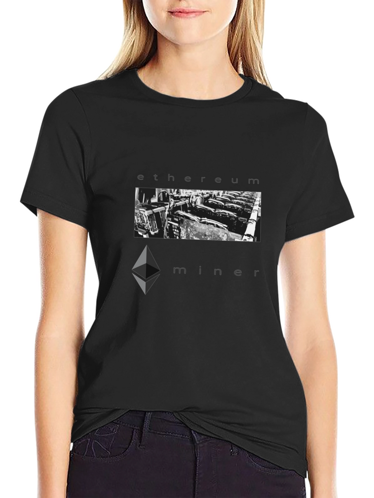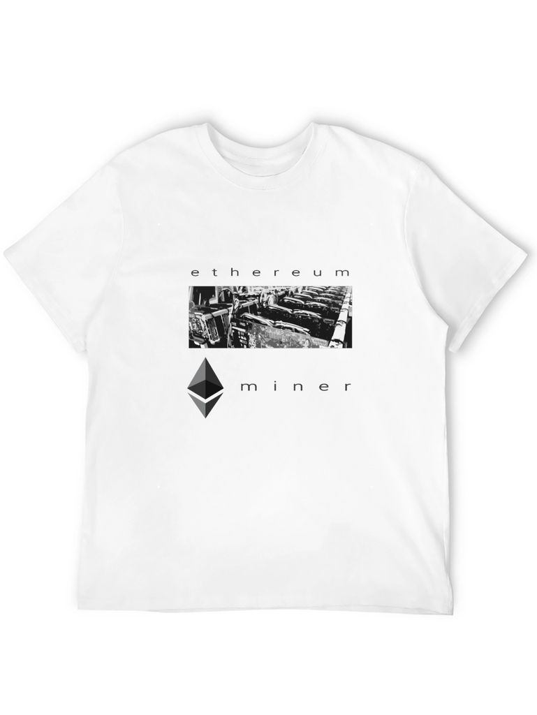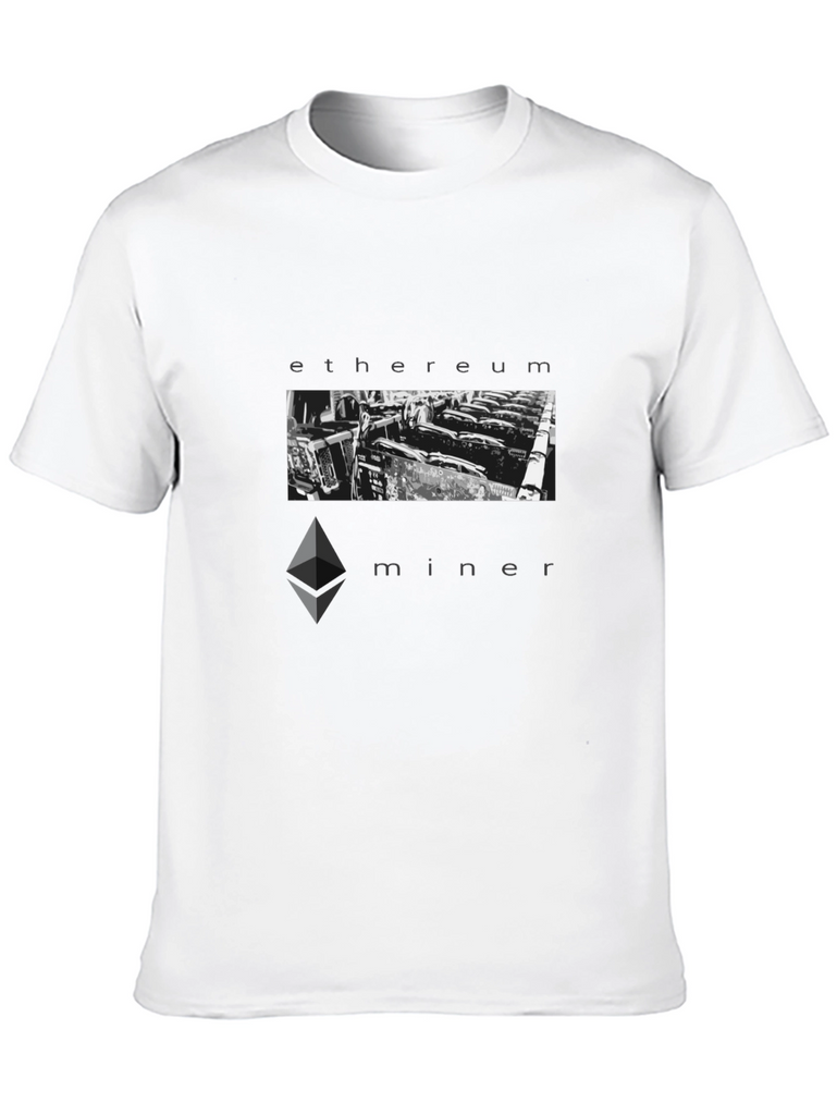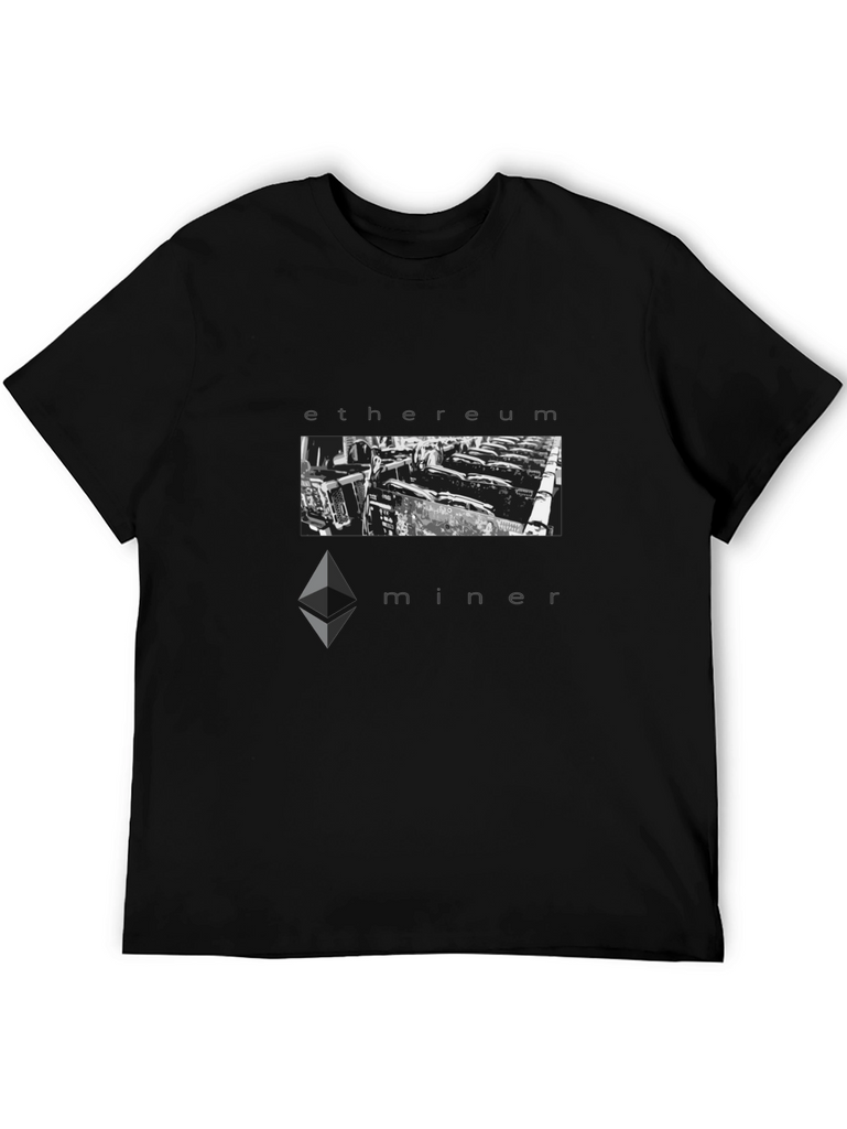 Show your passion for cryptocurrency with this bold 'Ethereum Miner' graphic tee. Made from comfortable, breathable fabric, this black t-shirt features a striking monochrome design. The image of a GPU mining farm is framed by the words 'ethereum' and 'miner', making a statement. Perfect for crypto enthusiasts, blockchain developers, or anyone interested in the digital revolution. Wear it to crypto meetups, tech conferences, or casually. A must-have addition to any cryptocurrency lover's wardrobe!