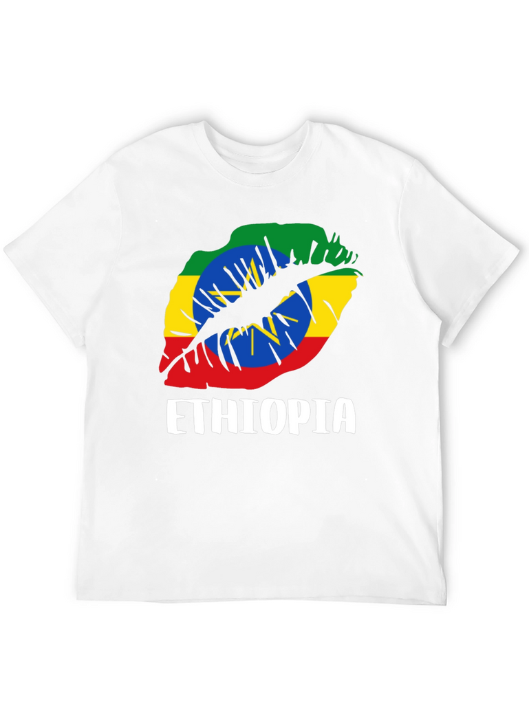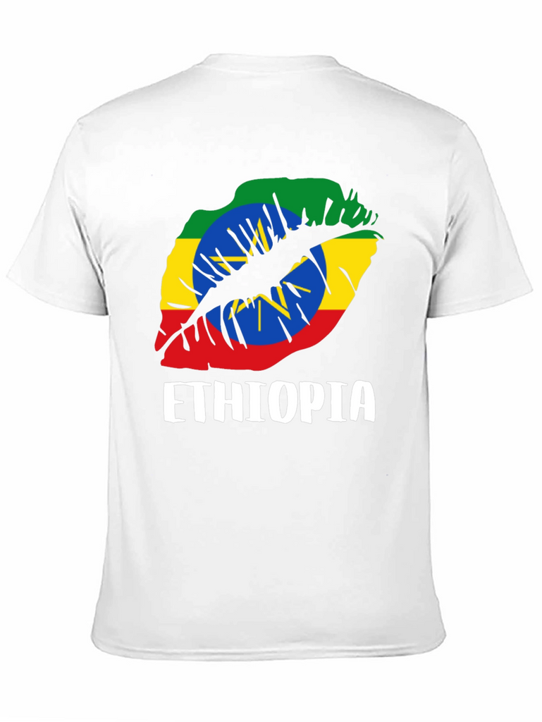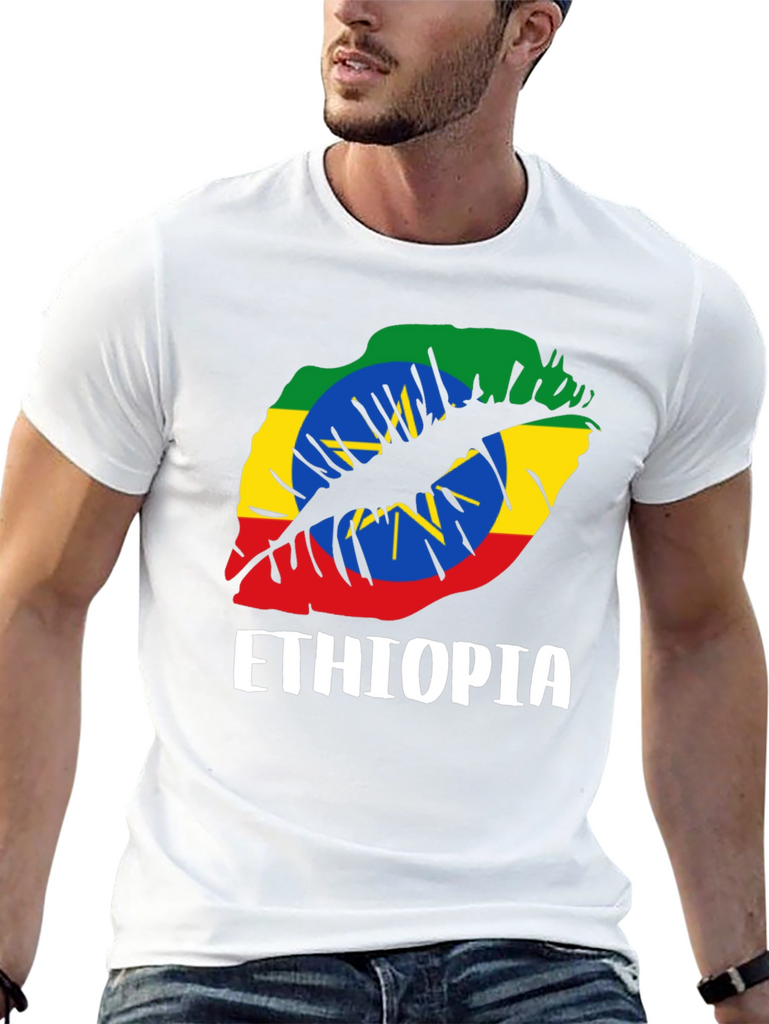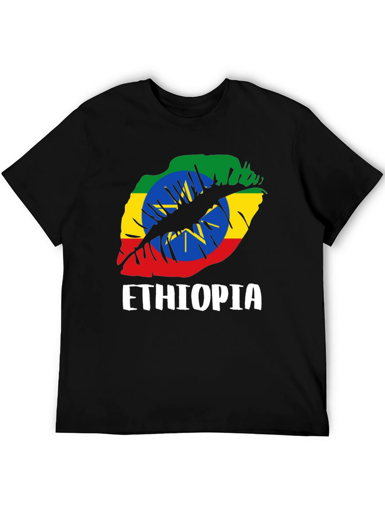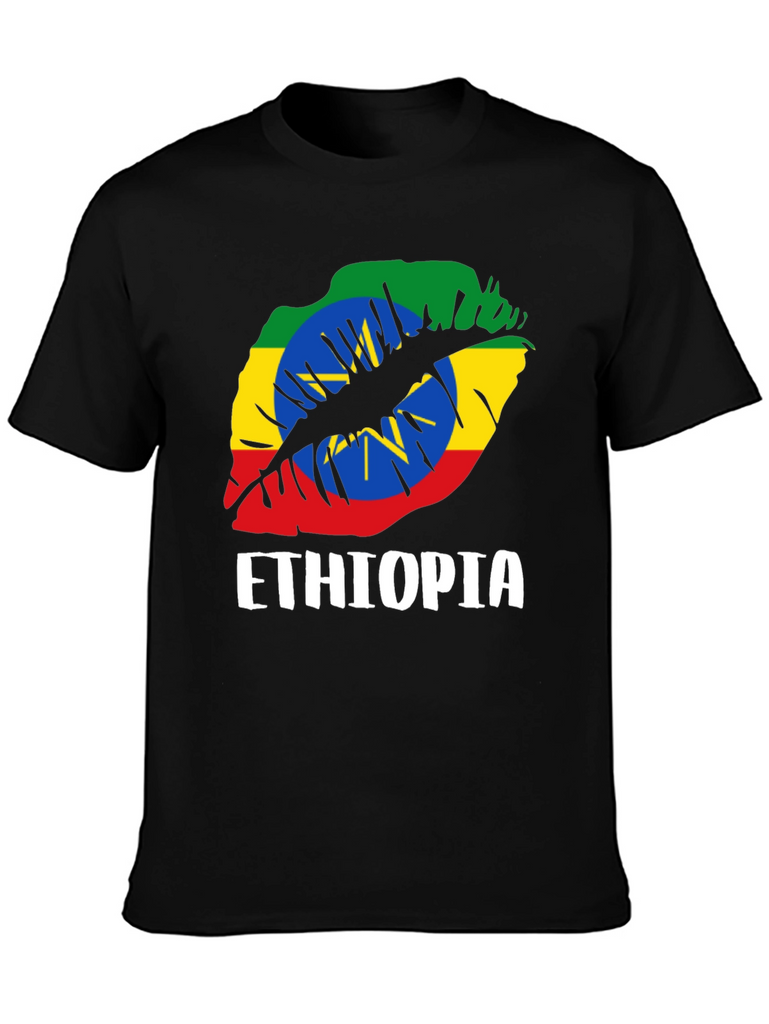 Show your Ethiopian pride with this unique graphic t-shirt. Featuring a bold lip print design in the colors of the Ethiopian flag, this tee is sure to turn heads. The word 'ETHIOPIA' is printed below the lip. Made from a comfortable material, this short sleeve t-shirt is perfect for everyday wear or special occasions. Ideal for casual outings, cultural events, or simply showing off your heritage. Express your love for Ethiopia with this stylish and eye-catching tee!