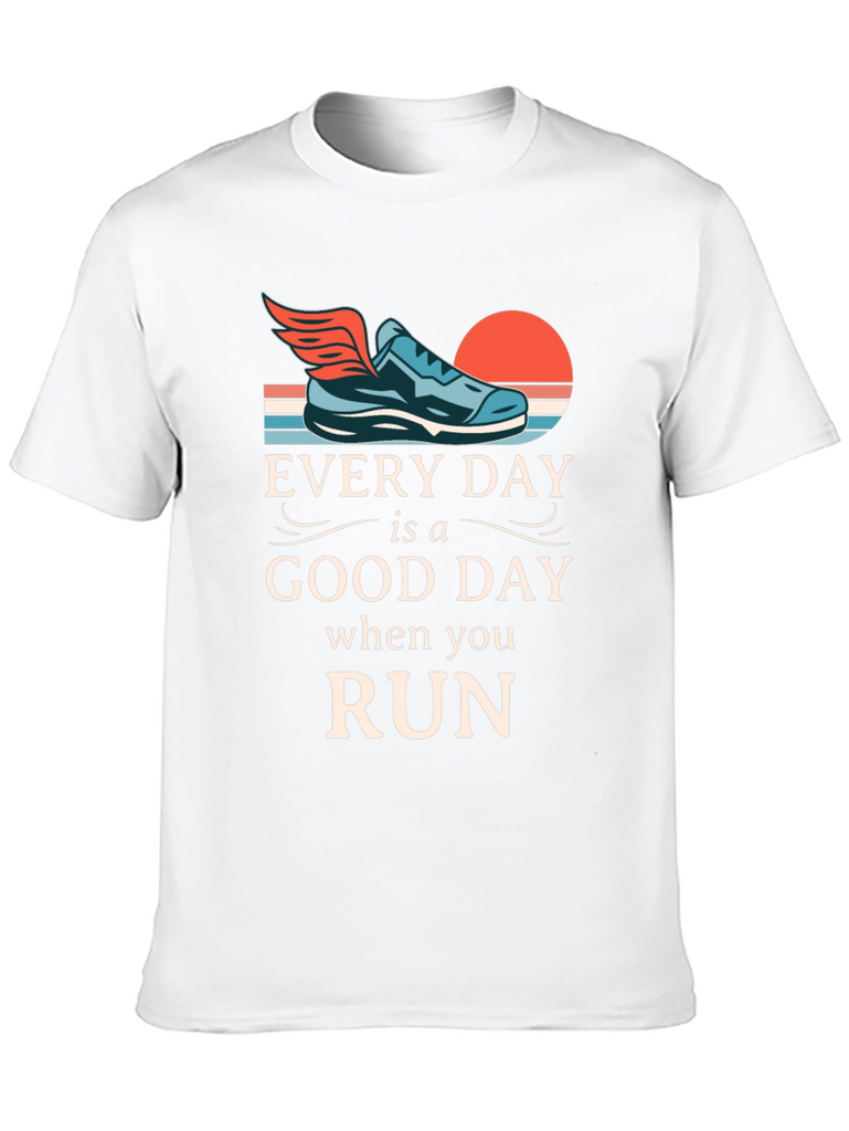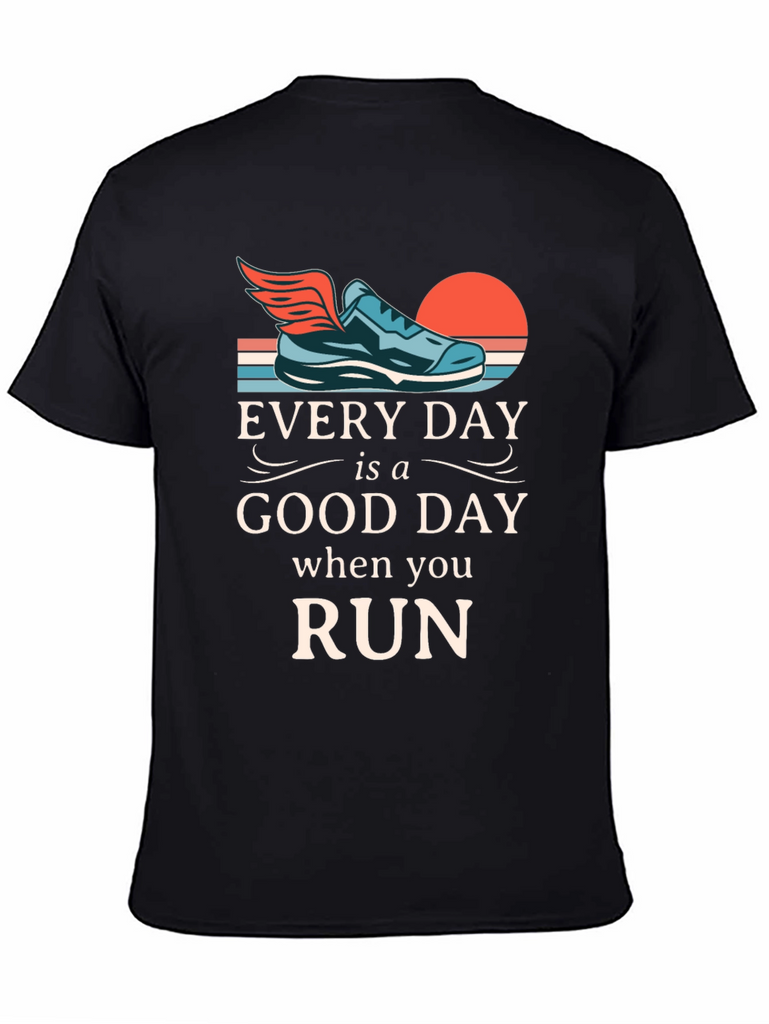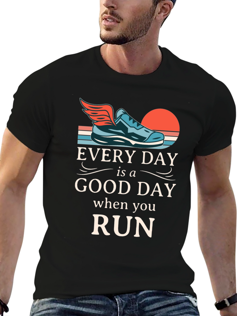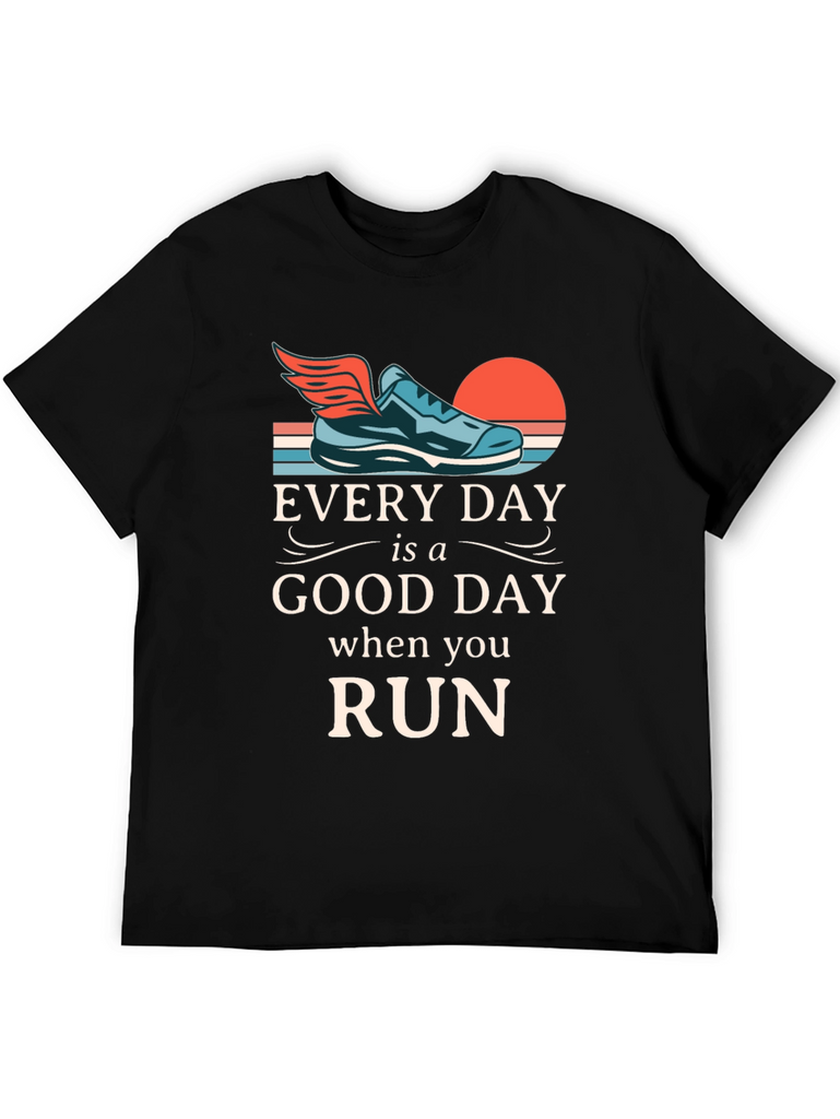 This eye-catching black t-shirt features a unique graphic design perfect for runners and fitness enthusiasts. The design showcases a winged running shoe with a retro sunset backdrop, accompanied by the inspiring message "Every Day is a Good Day when you RUN." Made from comfortable, breathable fabric, this tee is ideal for workouts, casual wear, or making a statement. The classic fit ensures a relaxed and stylish look. Show off your passion for running with this motivational and trendy t-shirt! It is also an ideal gift for runners.