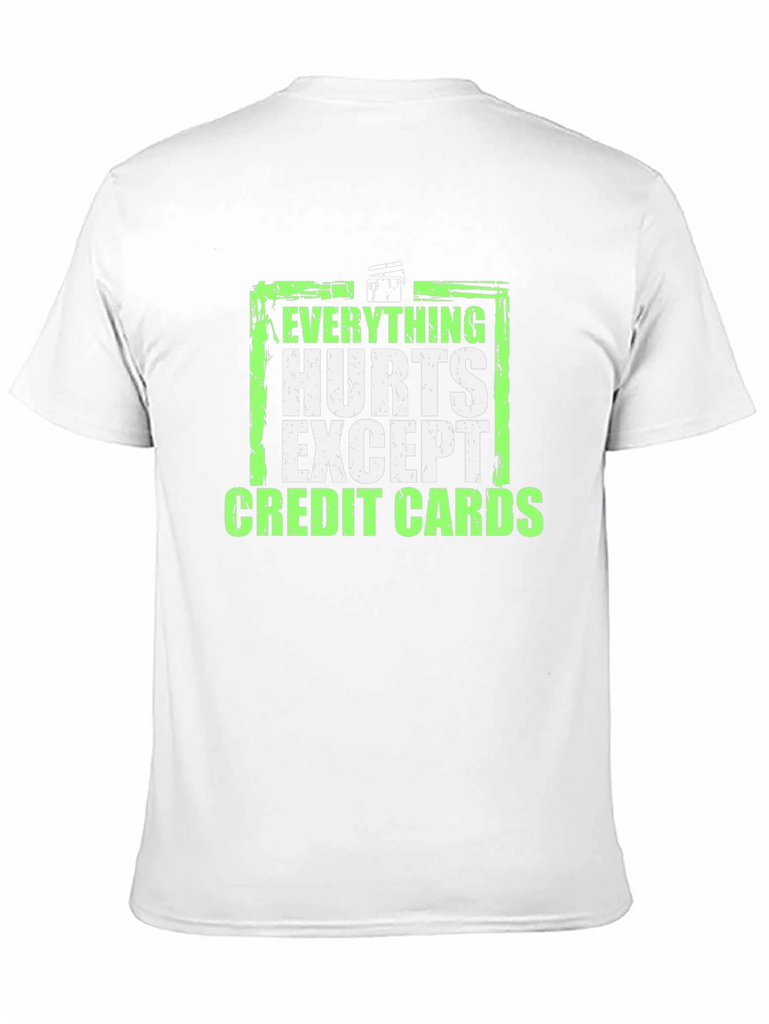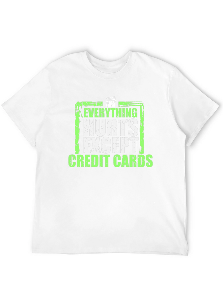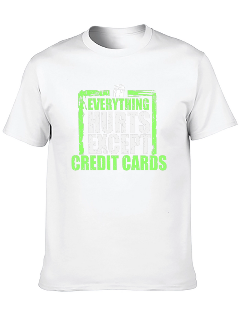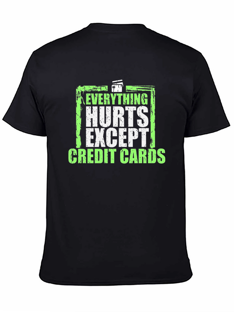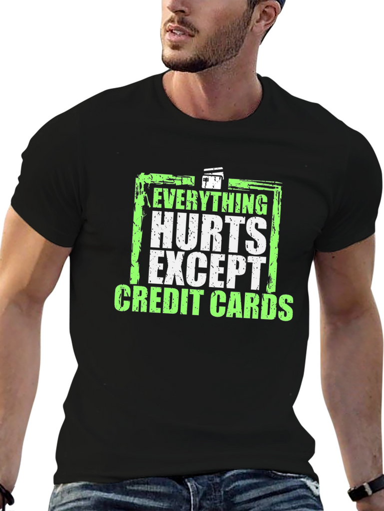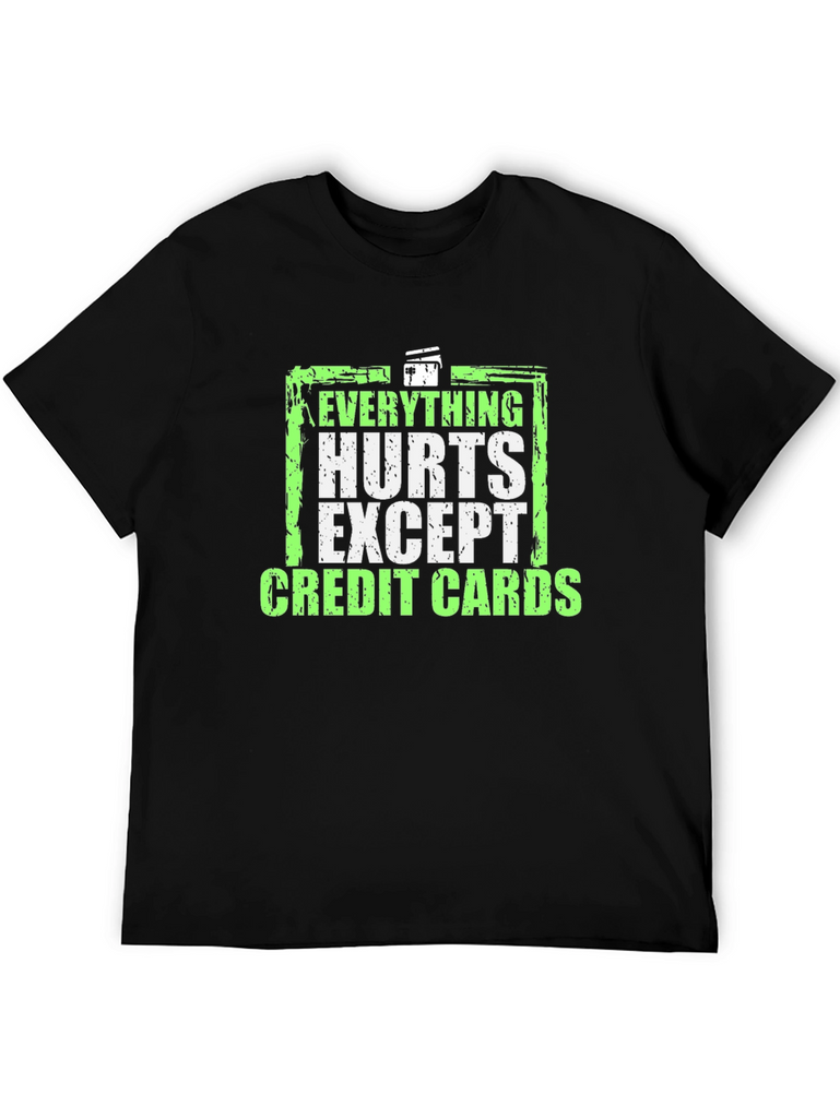 Show off your love for credit cards with this funny graphic tee! This black t-shirt features a bold, green graphic that states 'Everything Hurts Except Credit Cards,' enclosed in a rectangular design. Made from a comfortable-looking fabric, this short-sleeved shirt is perfect for casual wear, workouts, or just lounging around. It's a fun way to express your sense of humor and unique style, while making a statement about your love for spending. Ideal for everyday wear or a gift for the credit card enthusiast in your life.