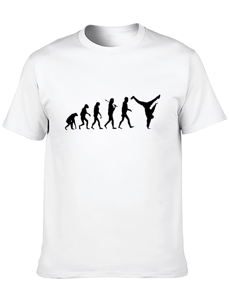 Show your love for dance with this cool black t-shirt! It features a unique graphic depicting the evolution of humans culminating in a breakdancing pose. Made from what appears to be a comfortable, breathable material, this tee is perfect for casual wear, dance practice, or making a statement. The simple design makes it versatile to pair with any bottoms and is sure to be a conversation starter. Get yours today and celebrate the artistry of movement!