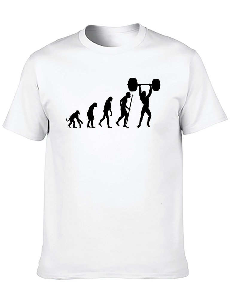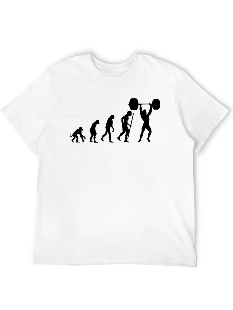 Show off your love of fitness with this unique black T-shirt. The shirt features a creative graphic depicting the evolution of humans ending with a weightlifter hoisting a barbell overhead. Made from what appears to be a soft and comfortable fabric, this tee is perfect for casual wear, gym sessions, or lounging around the house. The minimalist design and classic fit make it a versatile addition to any wardrobe. A great gift for lifters, athletes, and anyone who appreciates a good workout! Get yours today and celebrate the journey of strength!