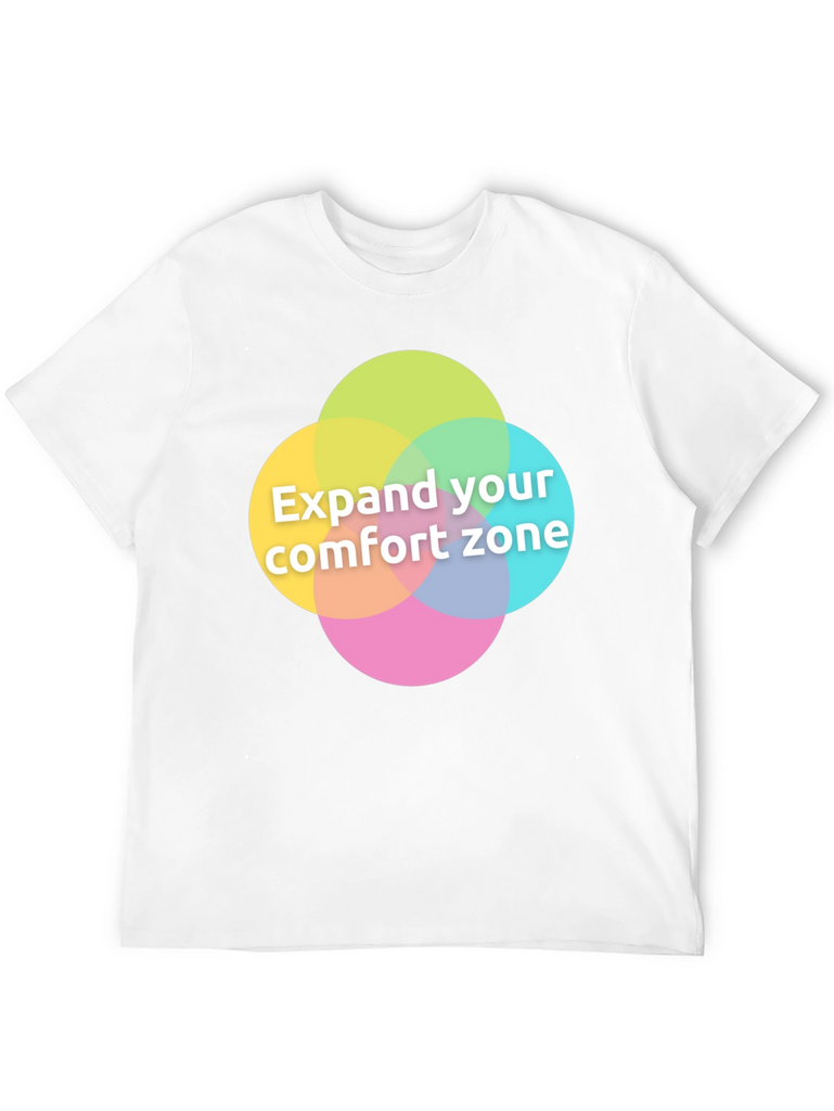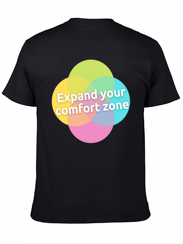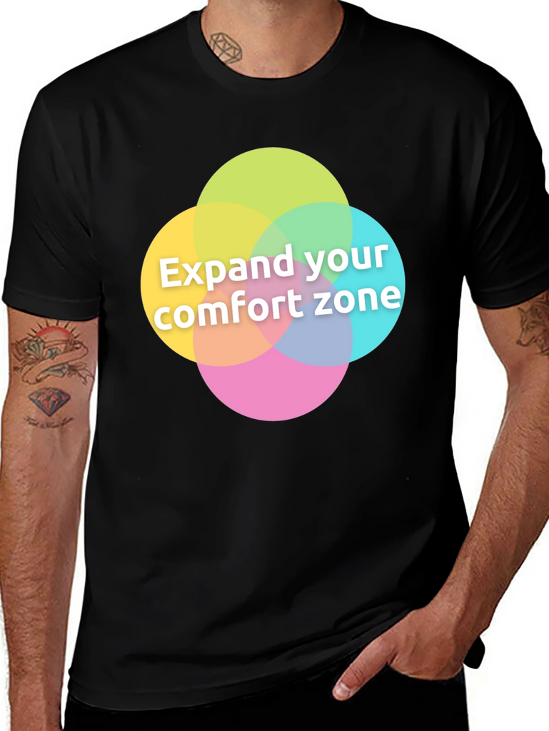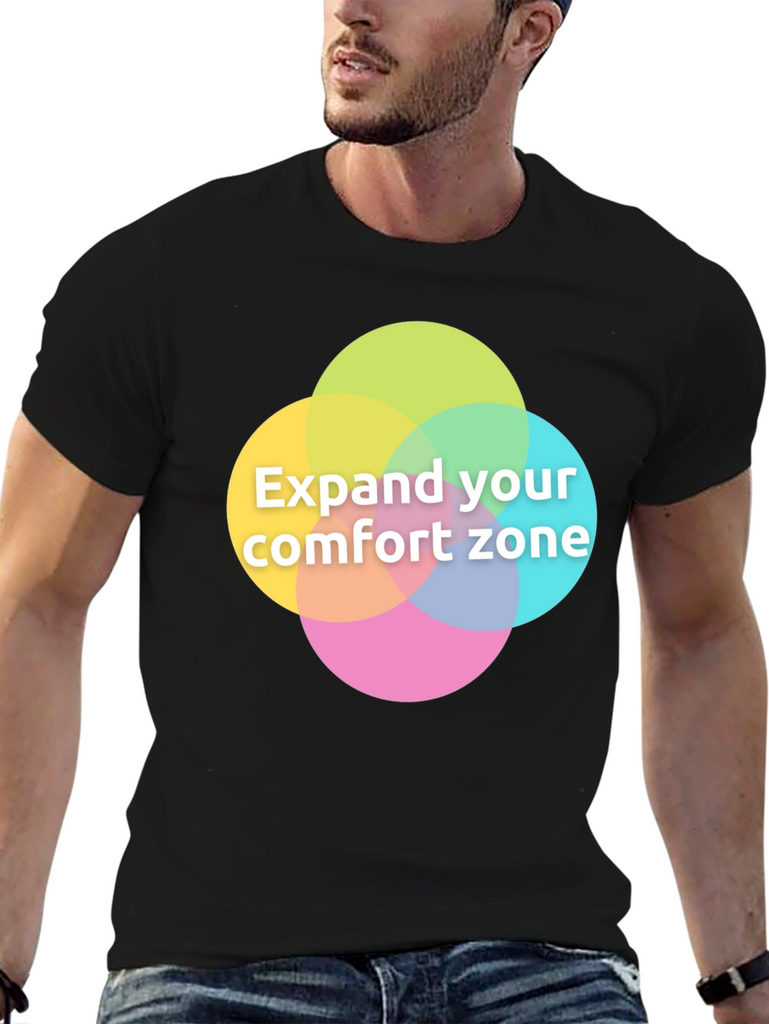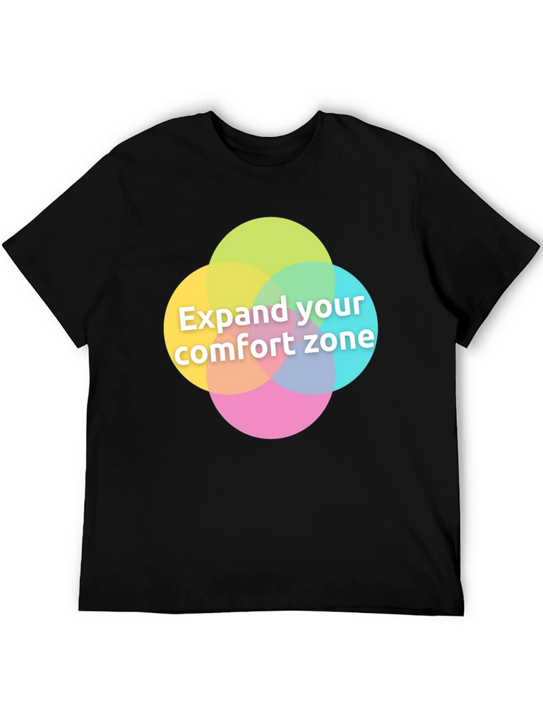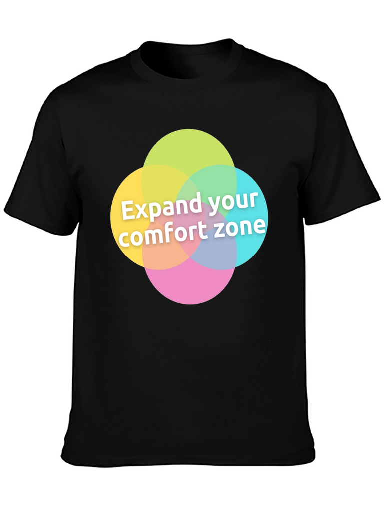 This eye-catching black t-shirt features a vibrant and colorful graphic design. The design consists of overlapping circles in shades of yellow, green, blue, and pink, creating a visually appealing effect. Bold white text overlayed says "Expand your comfort zone". Made from comfortable materials, this shirt is ideal for casual wear. Its unique design makes it a great conversation starter and a fun way to express your individuality. Perfect for everyday activities, the gym, or hanging out with friends, this t-shirt will keep you looking and feeling great.