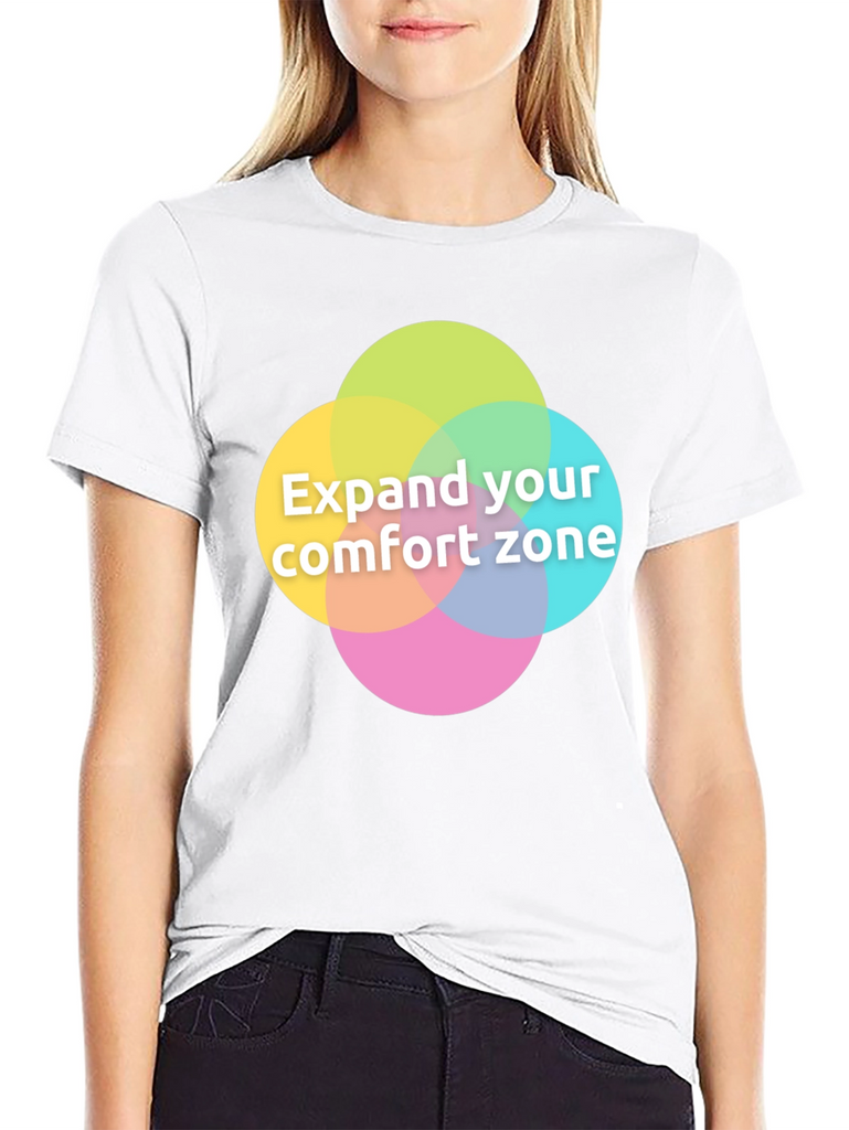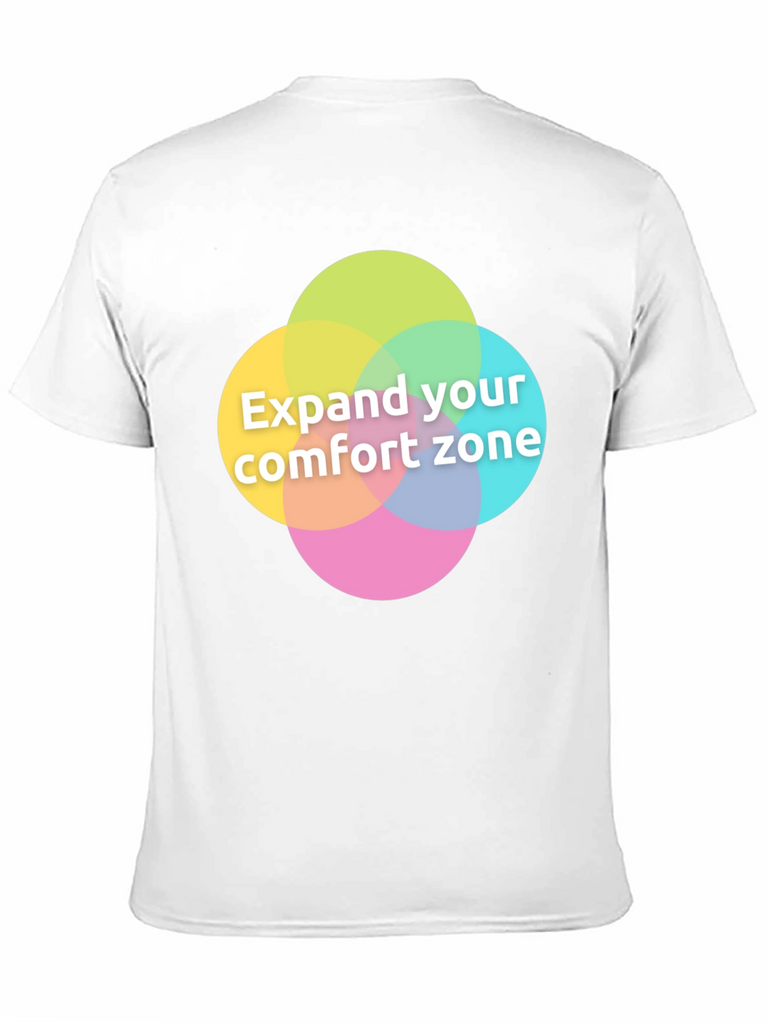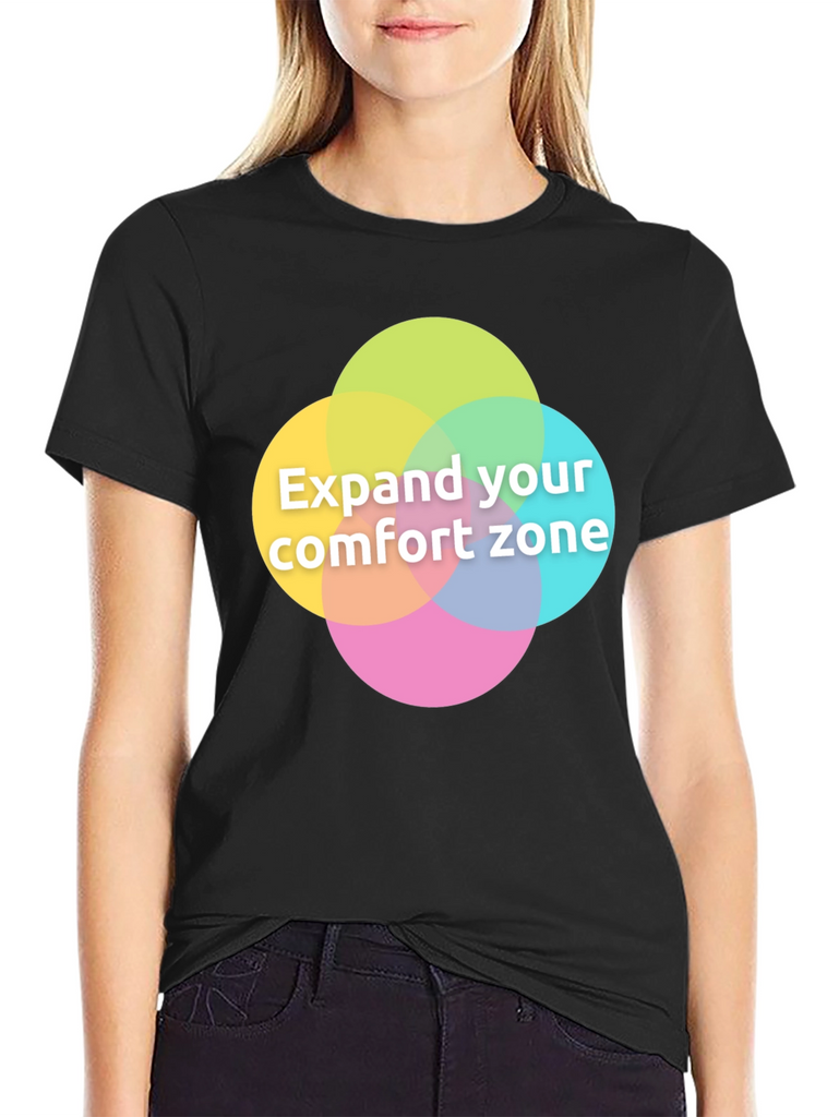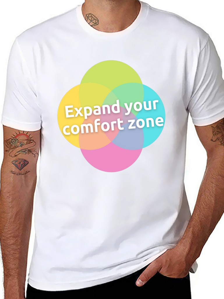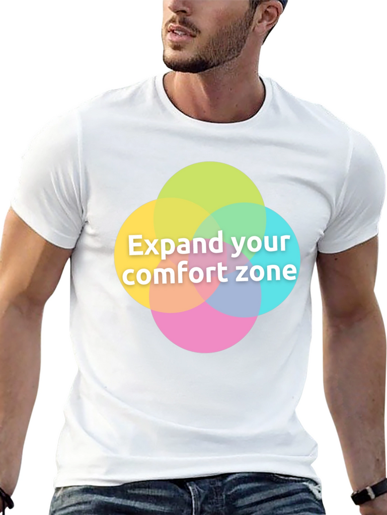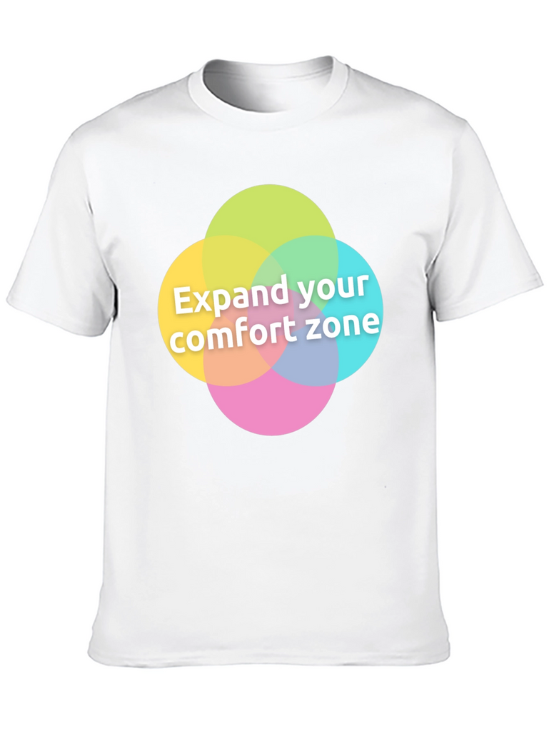 This eye-catching black t-shirt features a vibrant and colorful graphic design. The design consists of overlapping circles in shades of yellow, green, blue, and pink, creating a visually appealing effect. Bold white text overlayed says "Expand your comfort zone". Made from comfortable materials, this shirt is ideal for casual wear. Its unique design makes it a great conversation starter and a fun way to express your individuality. Perfect for everyday activities, the gym, or hanging out with friends, this t-shirt will keep you looking and feeling great.