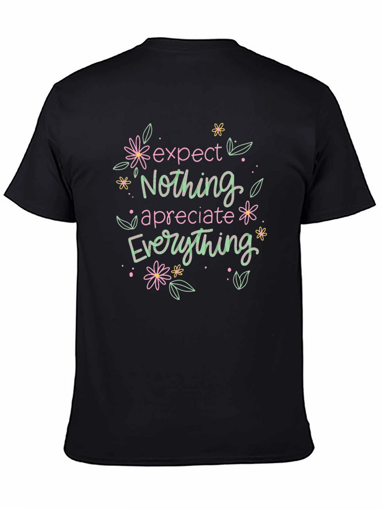 Showcase a positive mindset with this stylish black graphic t-shirt. The design features the phrase 'Expect Nothing, Appreciate Everything' in a decorative, whimsical font, surrounded by charming floral accents in pastel colors. Crafted from a comfortable-looking fabric, this tee offers a relaxed fit and casual style, perfect for everyday wear. Pair it with jeans or shorts for a laid-back look that radiates optimism and good vibes. Make a statement while staying comfortable with this unique and uplifting t-shirt!