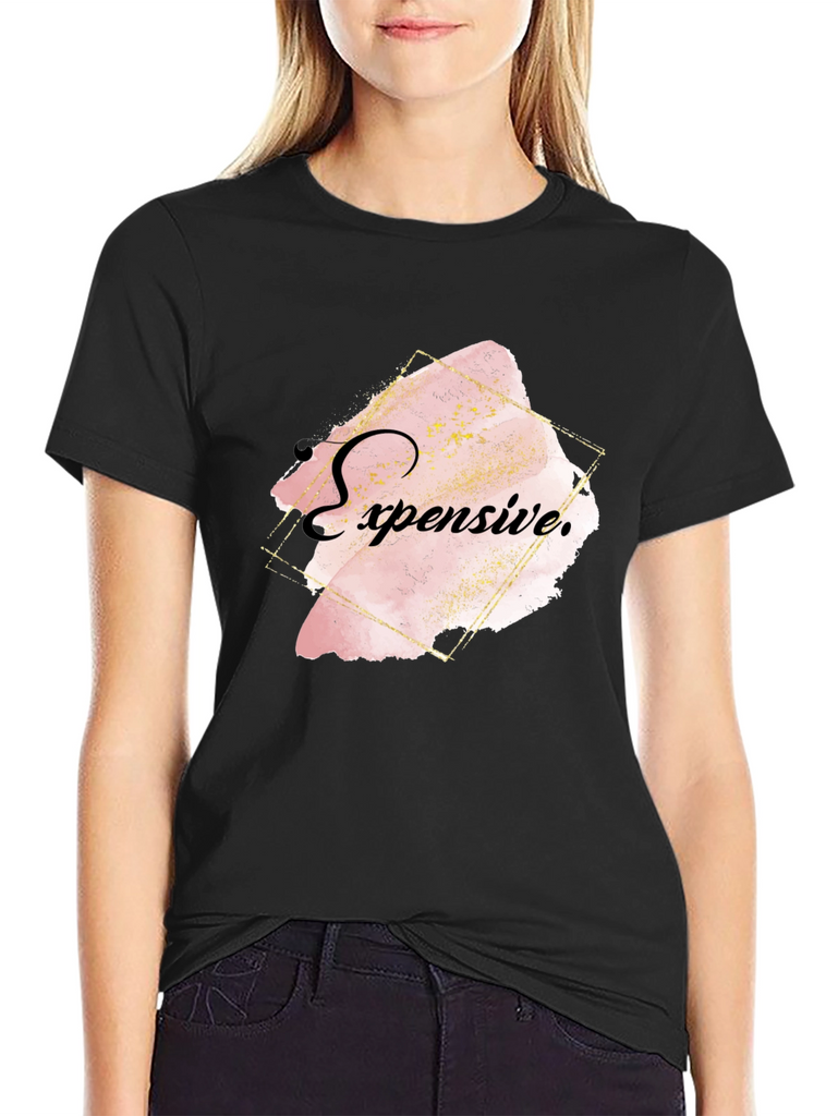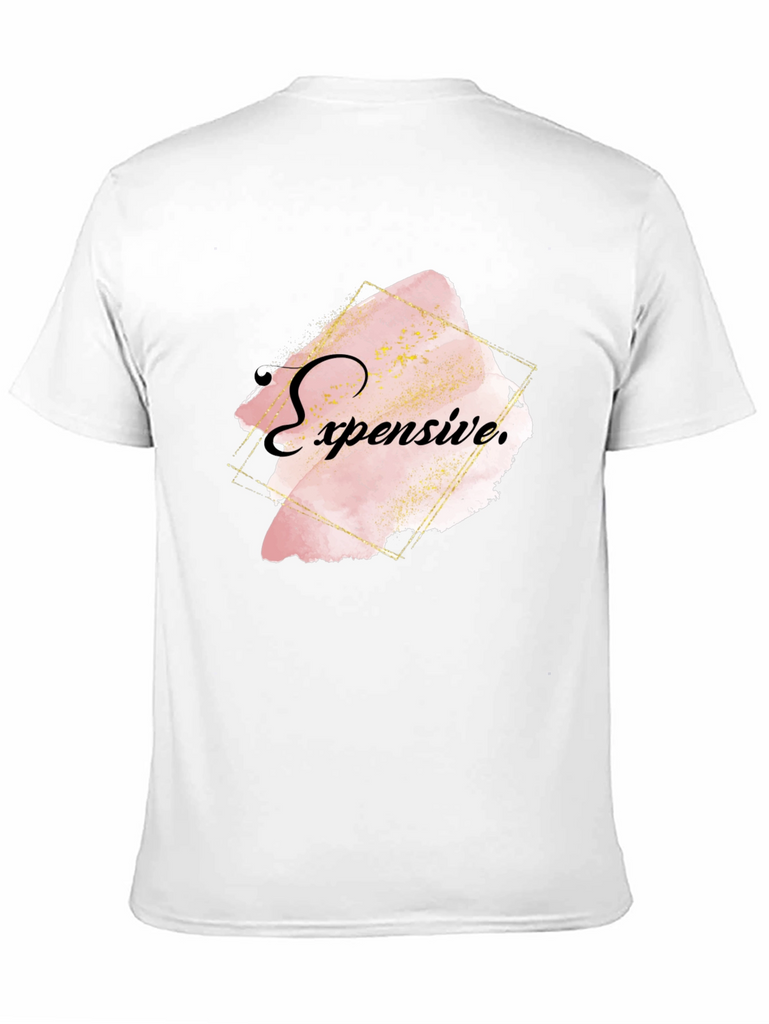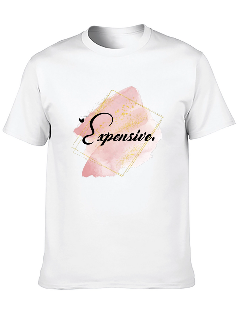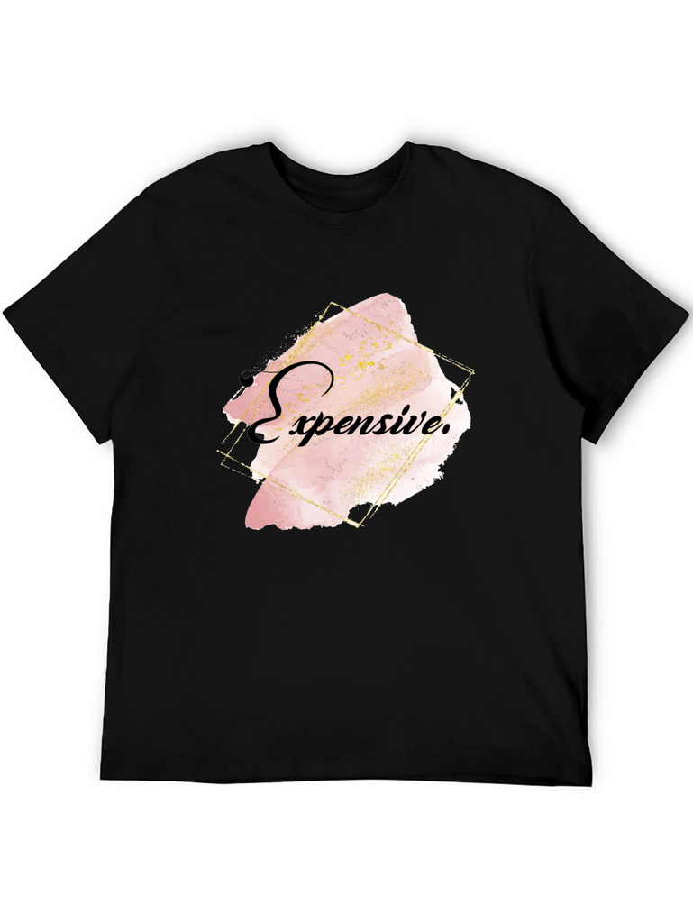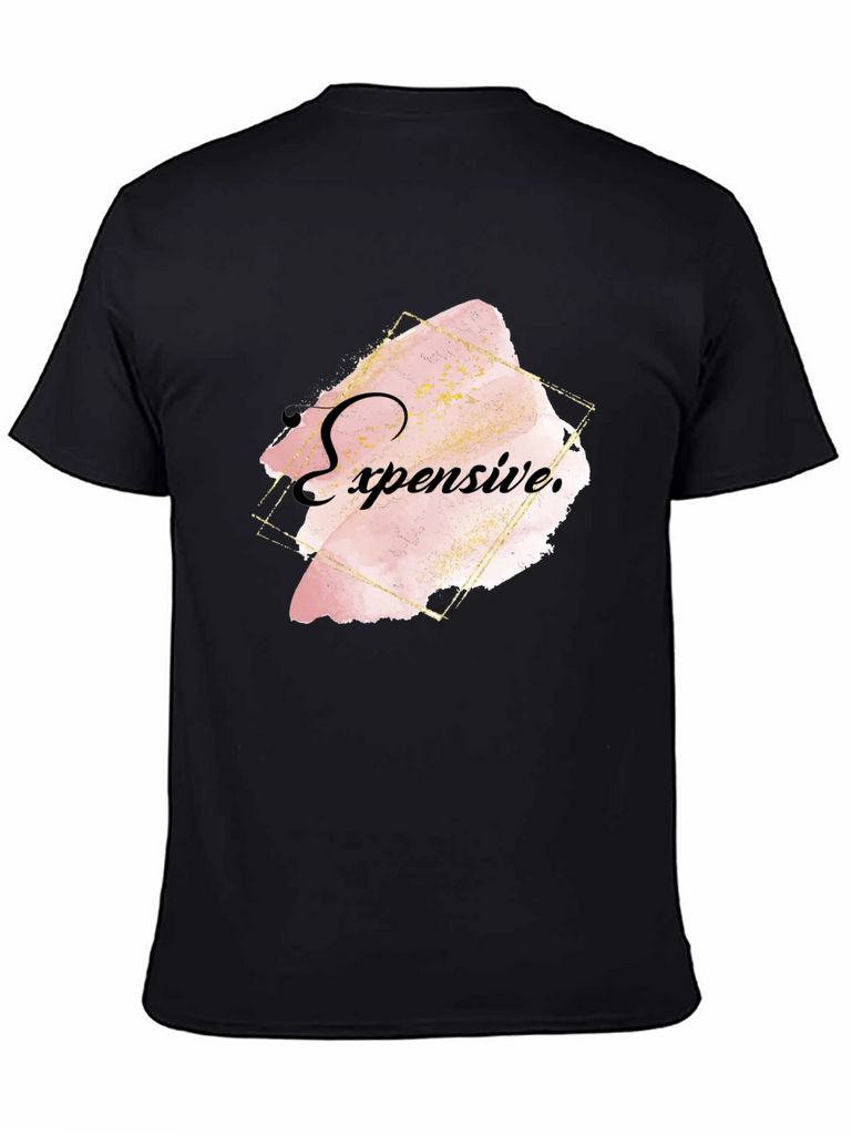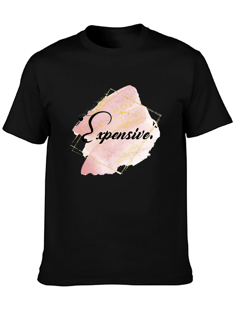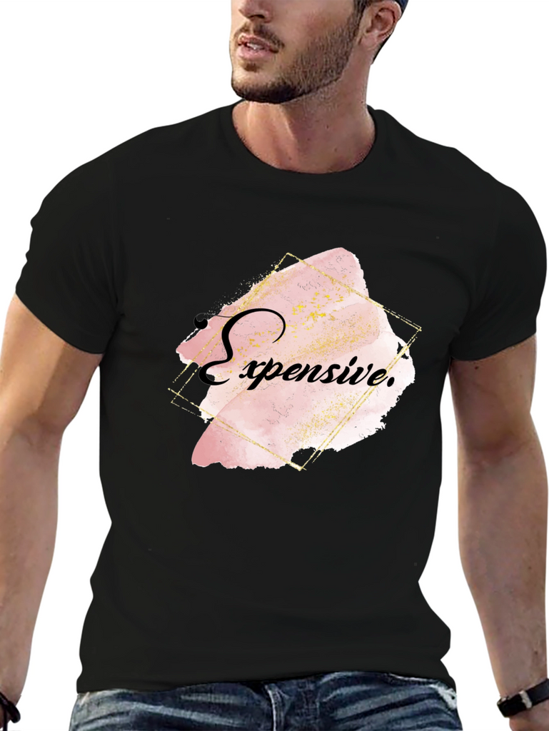 Elevate your style with this bold black T-shirt featuring an eye-catching "Expensive" graphic. The design showcases a trendy, abstract watercolor effect in soft pink and gold tones, framed by a modern geometric outline. Crafted from comfortable, breathable fabric, this shirt offers both style and comfort. Ideal for casual outings, social events, or making a statement wherever you go. Pair it with jeans or dress it up with a blazer for a versatile look. Show off your unique sense of fashion with this statement piece!