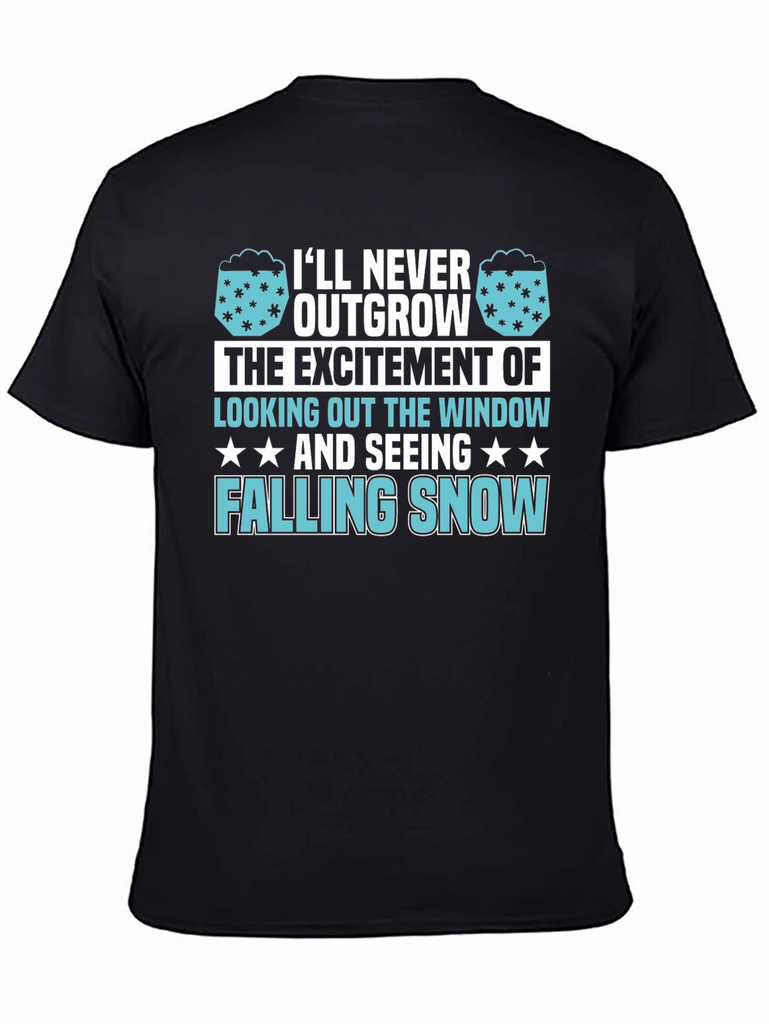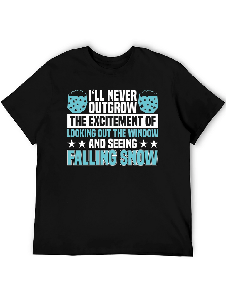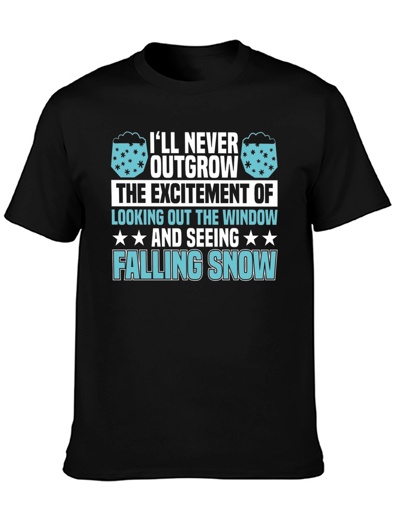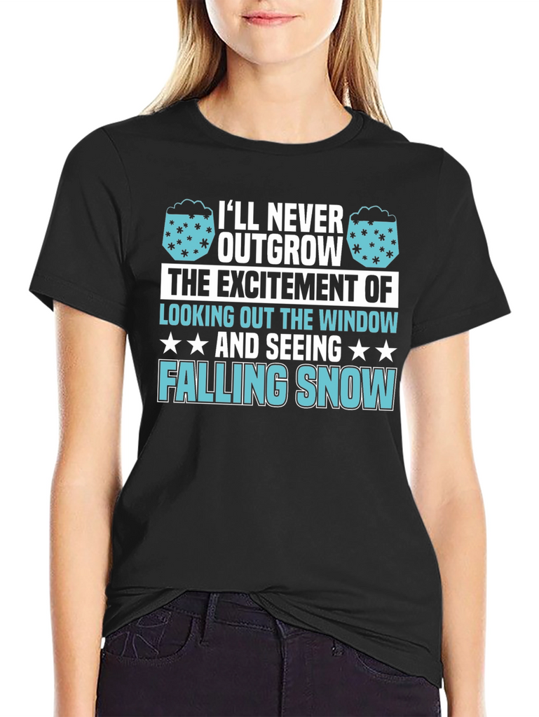 Embrace your inner child with this cozy black t-shirt! Featuring a fun graphic print in a refreshing light blue, the shirt displays the heartwarming message: "I'll never outgrow the excitement of looking out the window and seeing falling snow". Made from comfortable material, it's perfect for casual wear, holiday gatherings, or simply expressing your love for the winter season. Spread holiday cheer with this statement piece and make every day feel like a snow day!