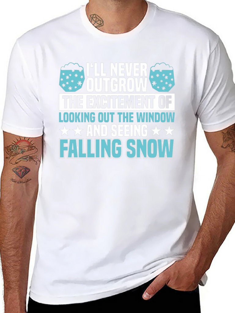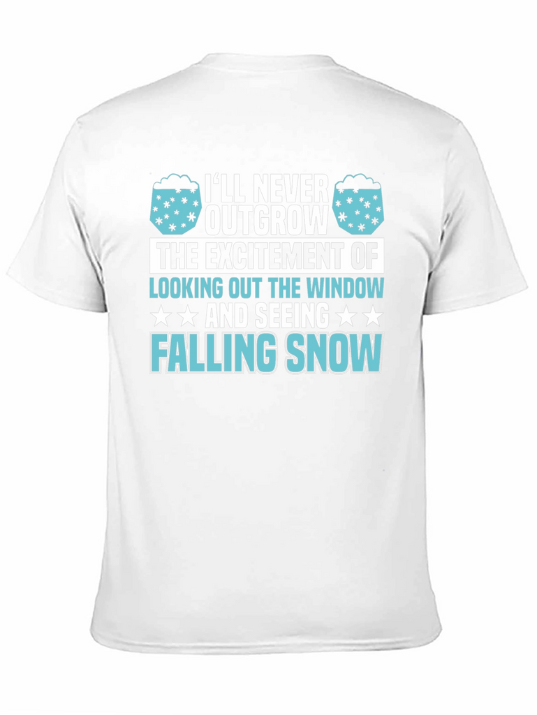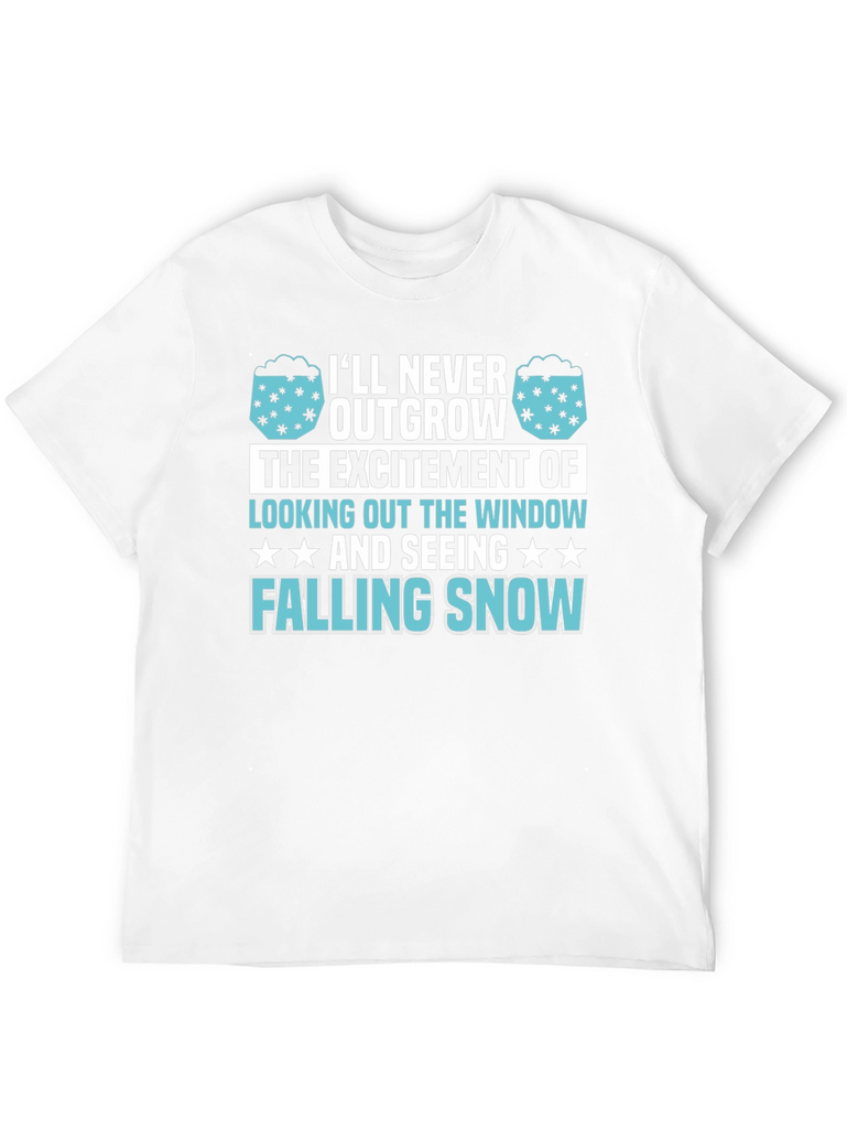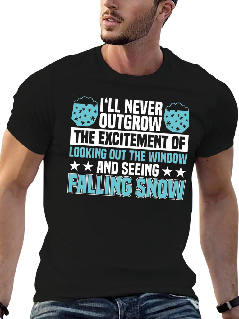 Embrace your inner child with this cozy black t-shirt! Featuring a fun graphic print in a refreshing light blue, the shirt displays the heartwarming message: "I'll never outgrow the excitement of looking out the window and seeing falling snow". Made from comfortable material, it's perfect for casual wear, holiday gatherings, or simply expressing your love for the winter season. Spread holiday cheer with this statement piece and make every day feel like a snow day!