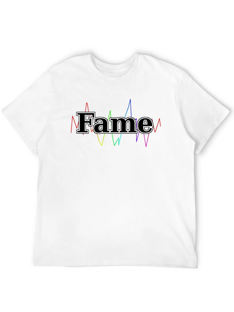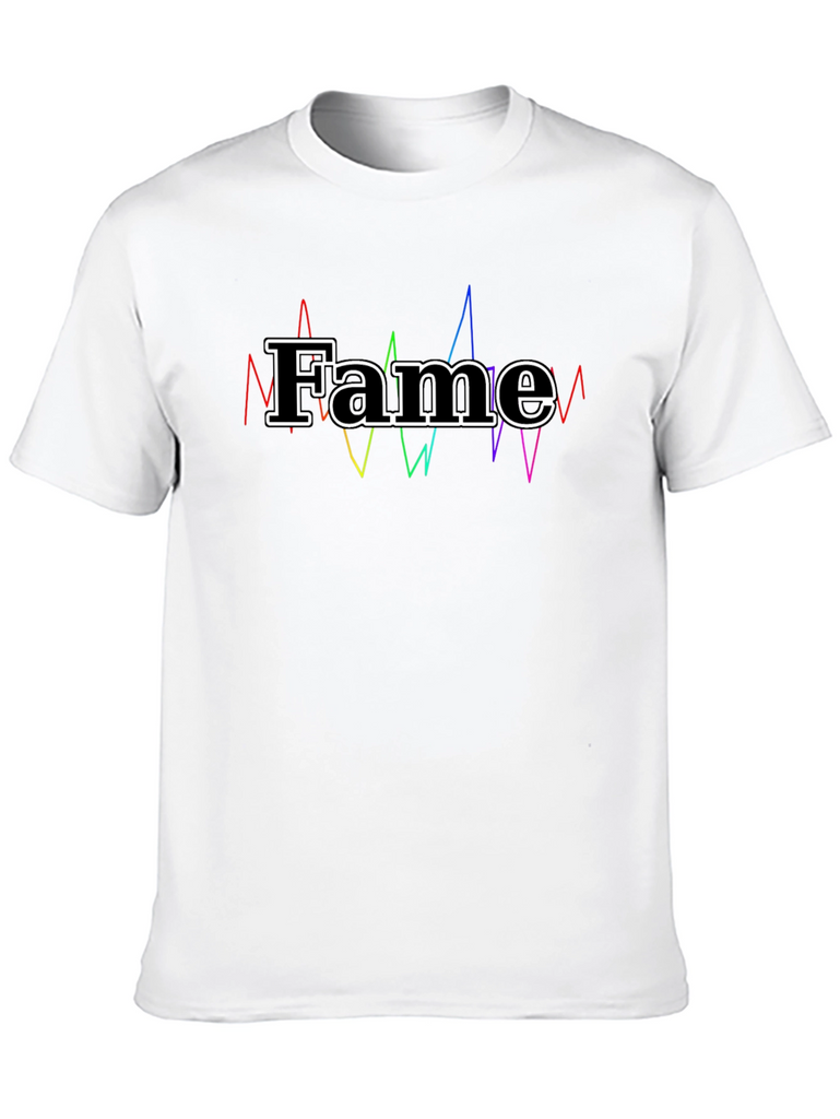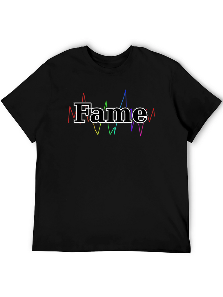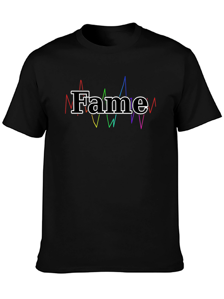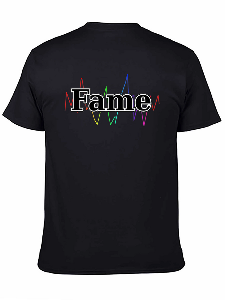 Showcase your love for fame with this stylish black t-shirt. Crafted from soft and breathable cotton, this tee offers all-day comfort and a classic fit. The standout feature is the bold "Fame" graphic, outlined in white and complemented by vibrant, colorful sound waves for a unique design. Perfect for casual wear, music enthusiasts, or anyone who enjoys making a statement. Pair it with jeans, shorts, or joggers for a trendy, laid-back look. Elevate your wardrobe with this eye-catching and expressive t-shirt!