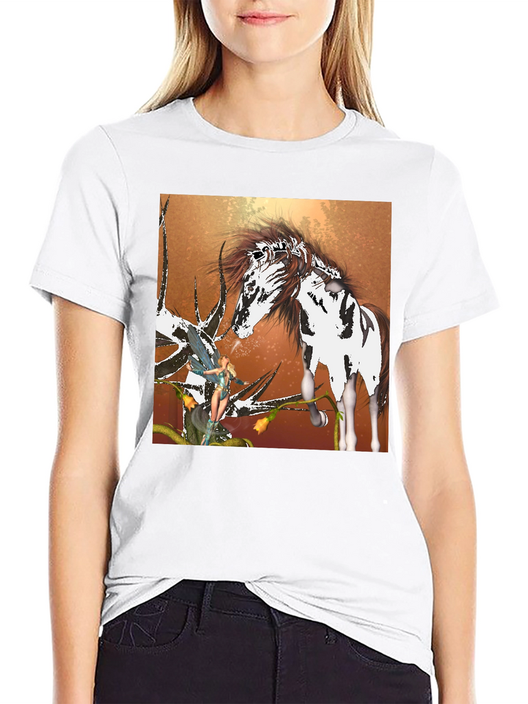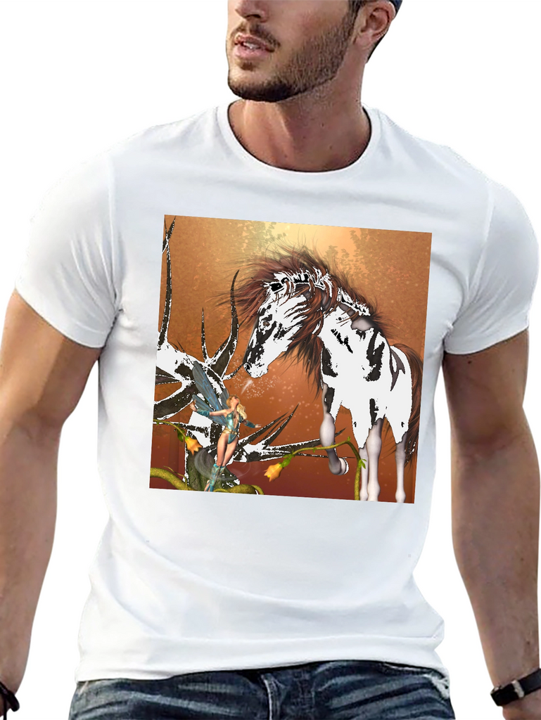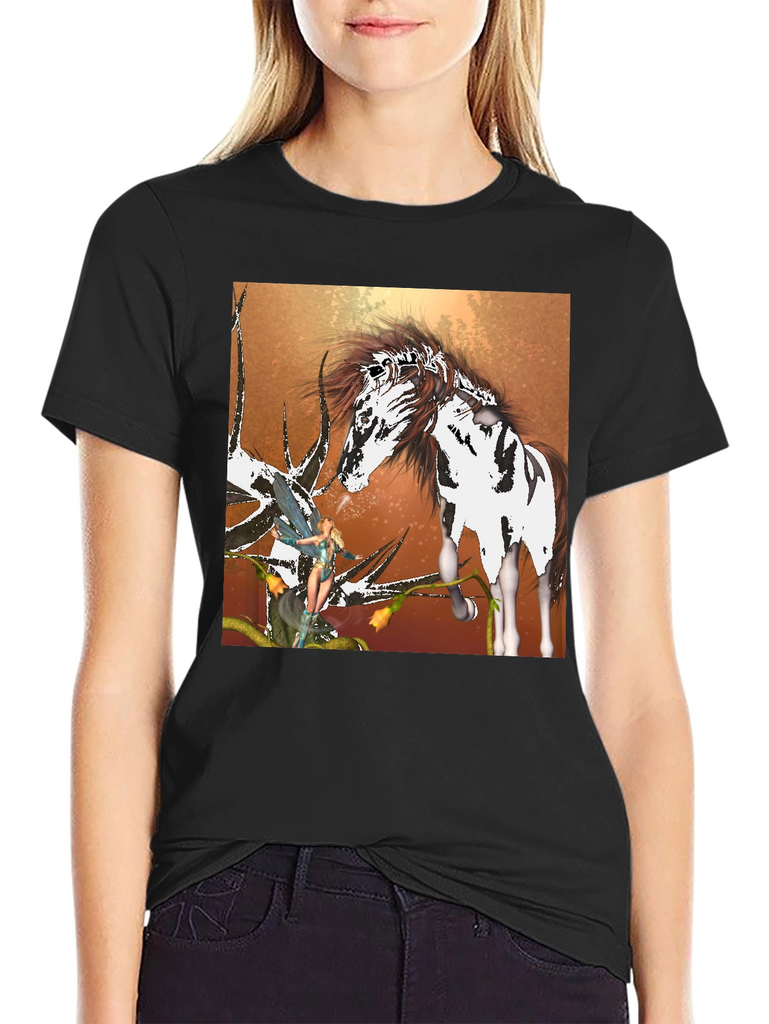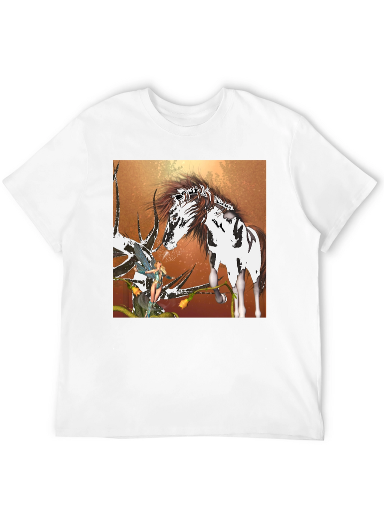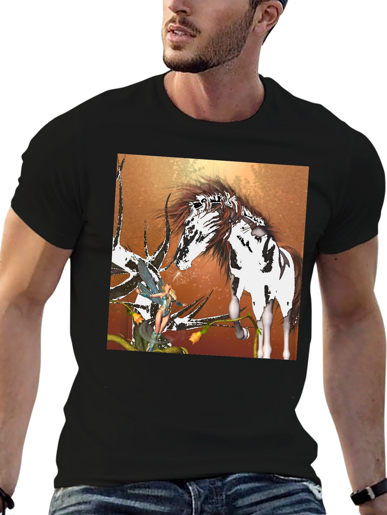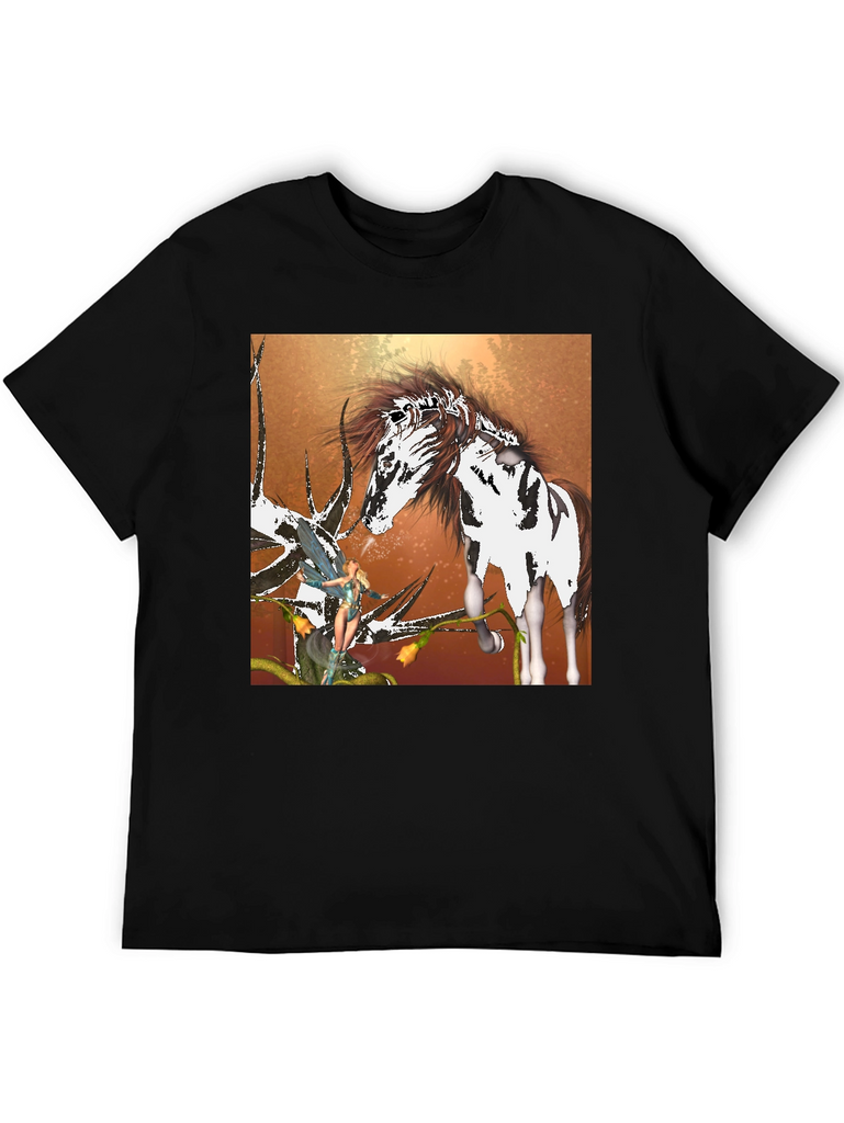 This stylish black t-shirt features a vibrant graphic print of a fantasy horse. The detailed artwork shows a unique horse design with a fantasy forest setting. Made from comfortable fabric, this tee is perfect for casual wear or as a statement piece for those who love fantasy art. The classic crew neck and short sleeves offer a relaxed fit. Showcase your unique style with this eye-catching fantasy horse tee. Ideal for fantasy lovers, horse enthusiasts, or anyone looking to add a touch of creativity to their wardrobe.