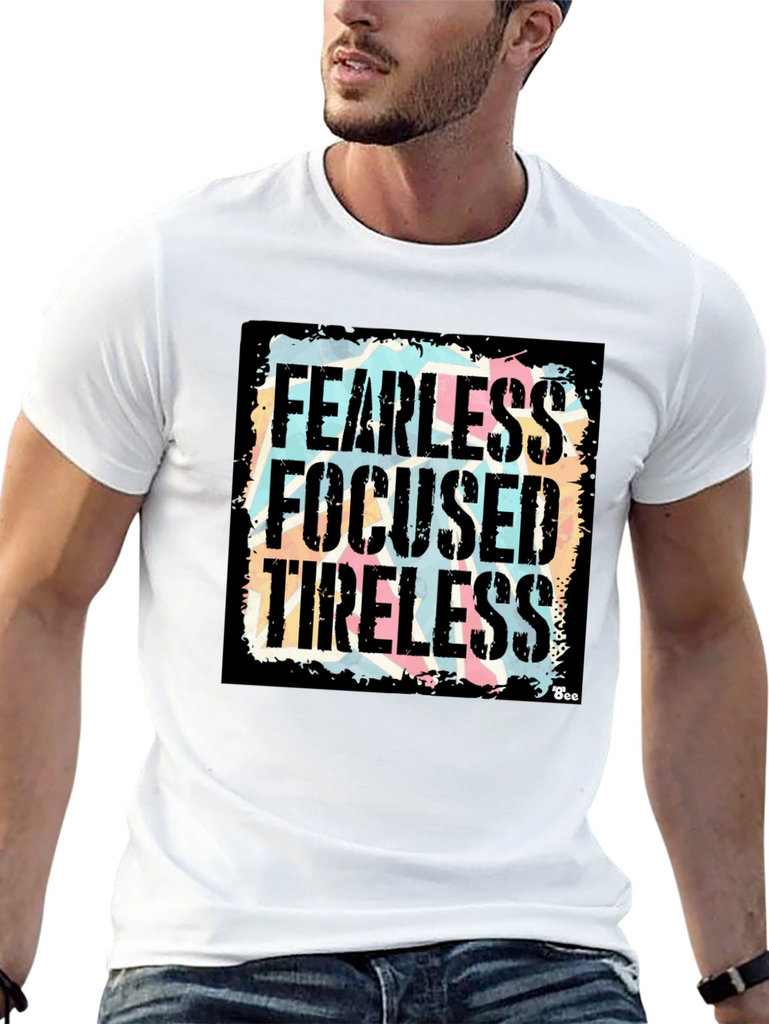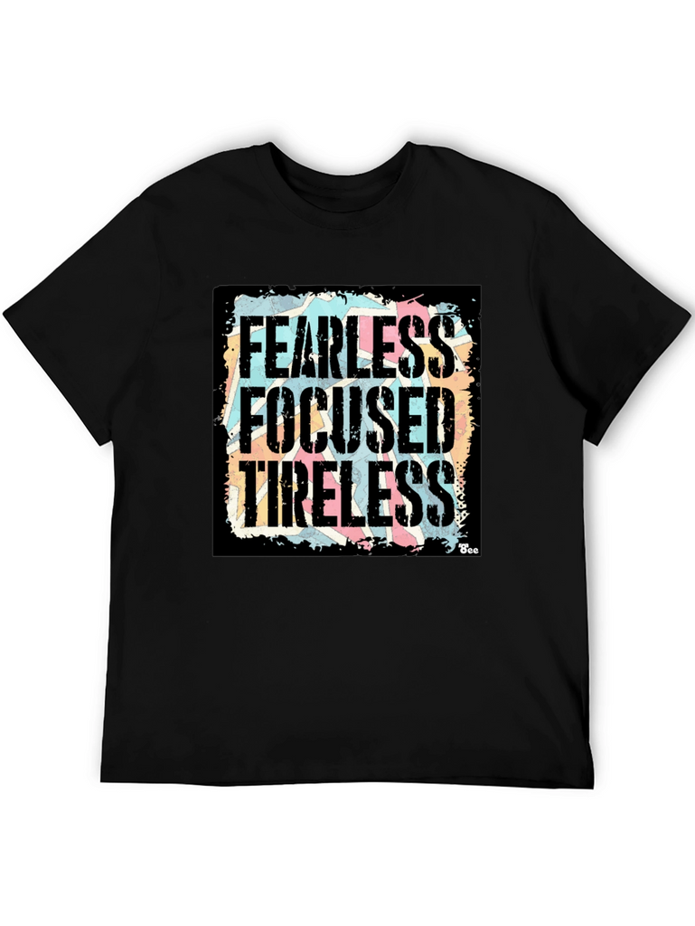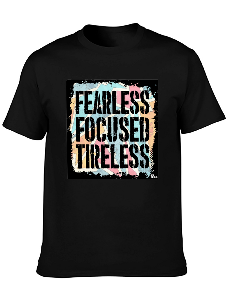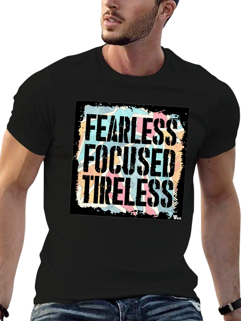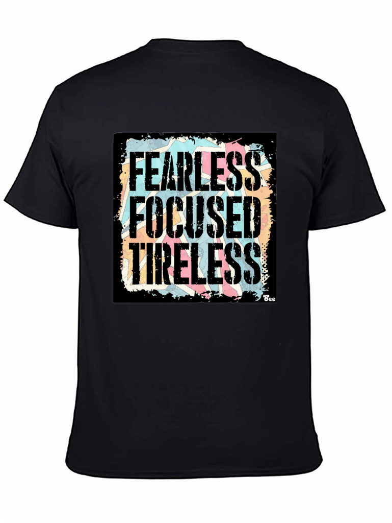 Show your determination with this bold black graphic t-shirt! Featuring the powerful words "Fearless, Focused, Tireless" in a distressed, vintage-style font against a colorful background, this shirt makes a statement. The design is eye-catching and unique, perfect for everyday wear. Made from a comfortable fabric, this tee offers both style and comfort. Whether you're hitting the gym, running errands, or just relaxing with friends, this shirt will keep you feeling motivated and looking great. A must-have addition to any wardrobe!