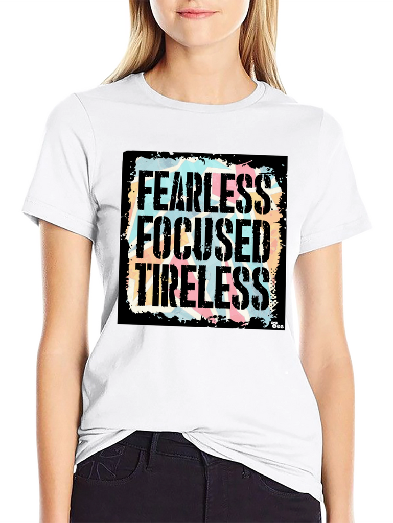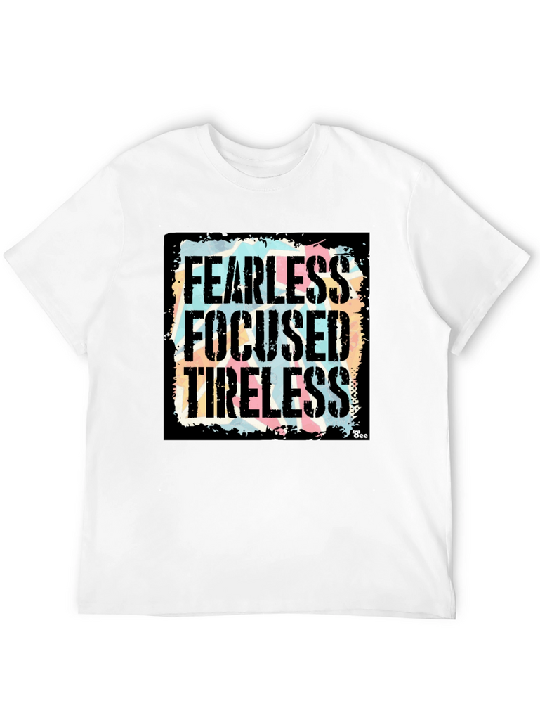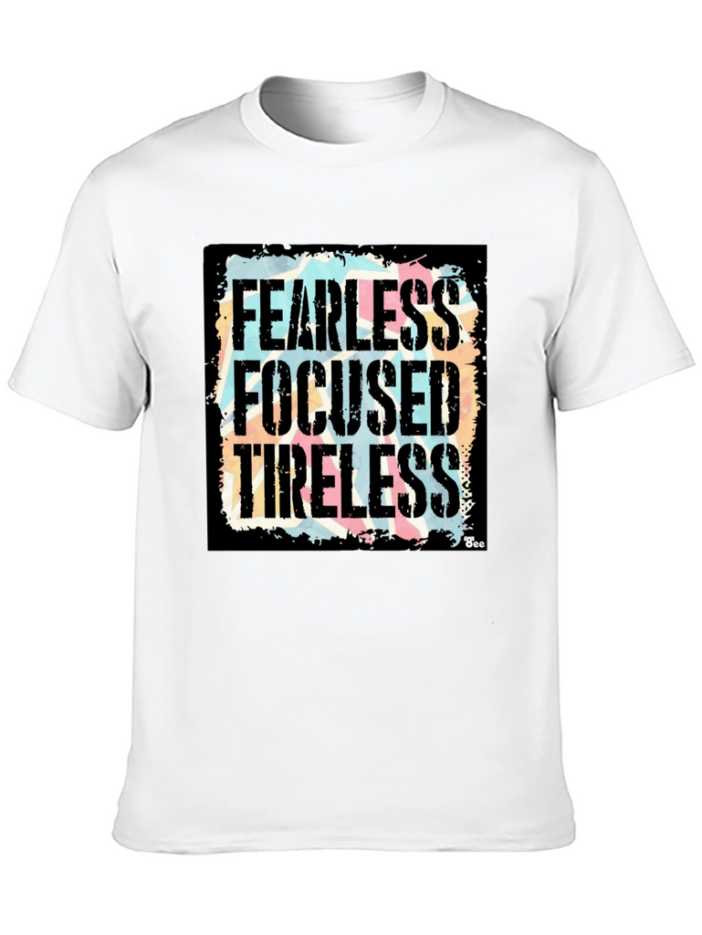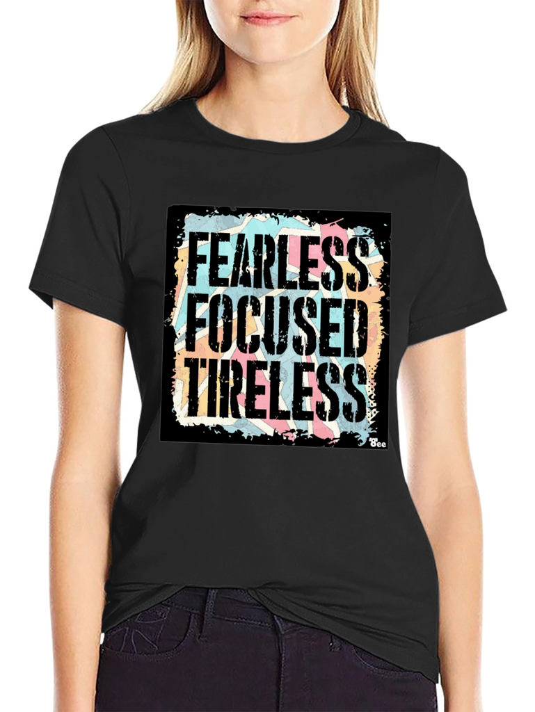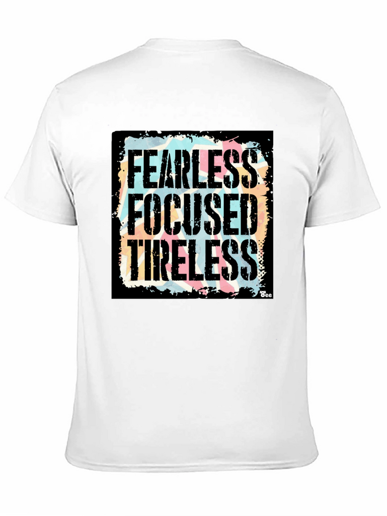 Show your determination with this bold black graphic t-shirt! Featuring the powerful words "Fearless, Focused, Tireless" in a distressed, vintage-style font against a colorful background, this shirt makes a statement. The design is eye-catching and unique, perfect for everyday wear. Made from a comfortable fabric, this tee offers both style and comfort. Whether you're hitting the gym, running errands, or just relaxing with friends, this shirt will keep you feeling motivated and looking great. A must-have addition to any wardrobe!