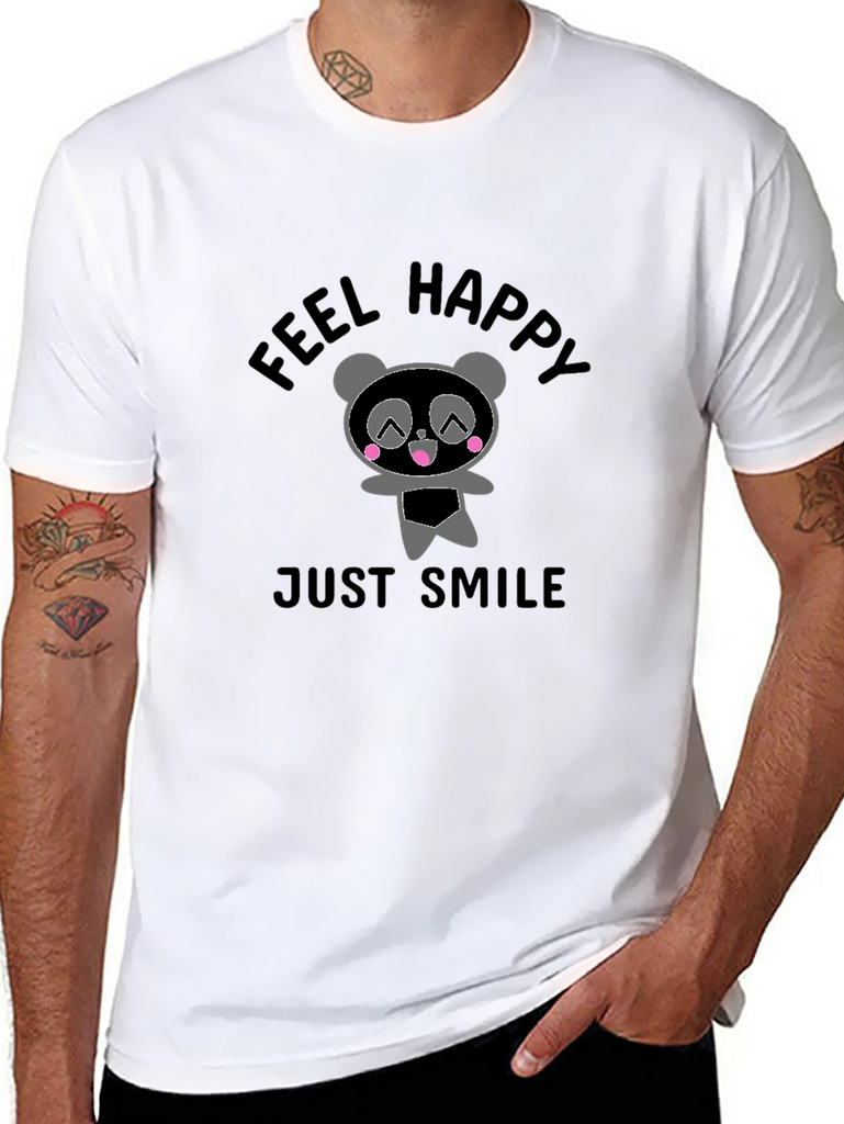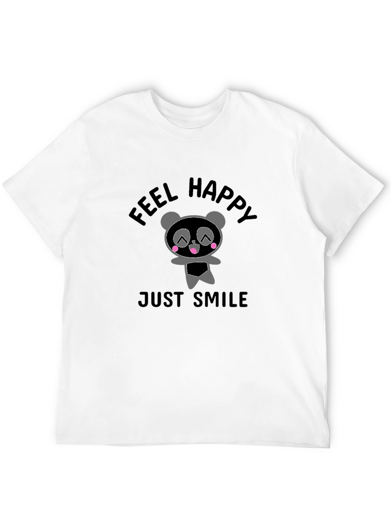 This stylish black t-shirt features an adorable panda graphic with the words "Feel Happy" and "Just Smile." Made from a soft, comfortable fabric, this tee is perfect for everyday wear. The cute panda design adds a touch of whimsy to your outfit. Ideal for casual outings, lounging at home, or as a fun gift for panda lovers. Embrace a cheerful vibe with this unique and eye-catching tee!