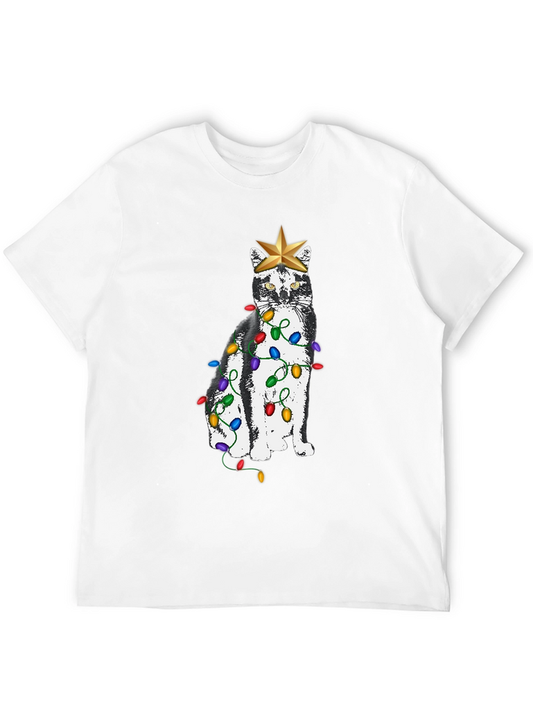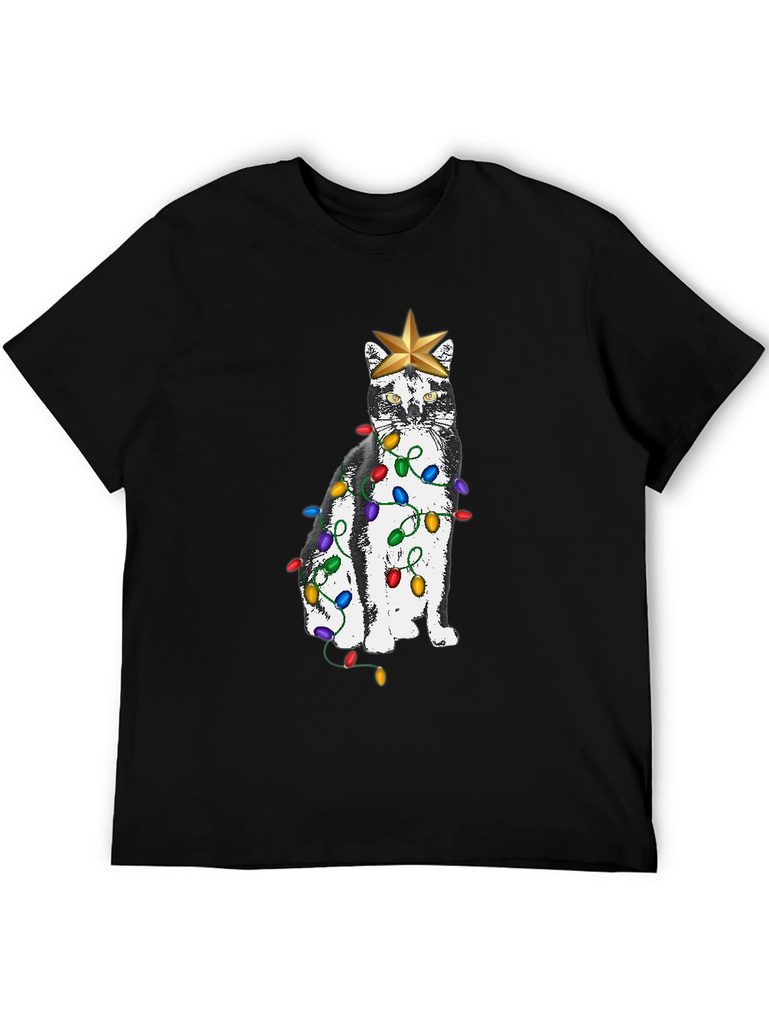 Spread holiday cheer with this unique black t-shirt featuring a charming cat illustration. The cat is adorned with a golden star crown and wrapped in colorful Christmas lights, creating a festive and playful design. Made from comfortable, breathable fabric, this shirt is perfect for casual wear during the holiday season. Show off your love for cats and Christmas with this eye-catching tee. It's an ideal gift for cat lovers or anyone who enjoys quirky and festive apparel. Wear it to holiday parties, family gatherings, or simply around town to add a touch of holiday spirit to your wardrobe.