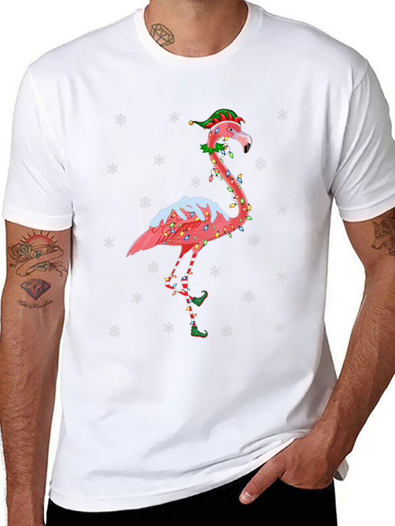 Spread holiday cheer with this fun flamingo Christmas t-shirt! This black tee features a playful flamingo adorned with Christmas lights and a festive elf hat. Snow sits gently on its back, adding a touch of winter magic. Tiny snowflakes surround the flamingo, creating a whimsical scene. Made from a comfortable fabric, this t-shirt is perfect for holiday parties, family gatherings, or simply adding a festive touch to your everyday wardrobe. Stand out from the crowd and embrace the holiday spirit with this unique and eye-catching design.