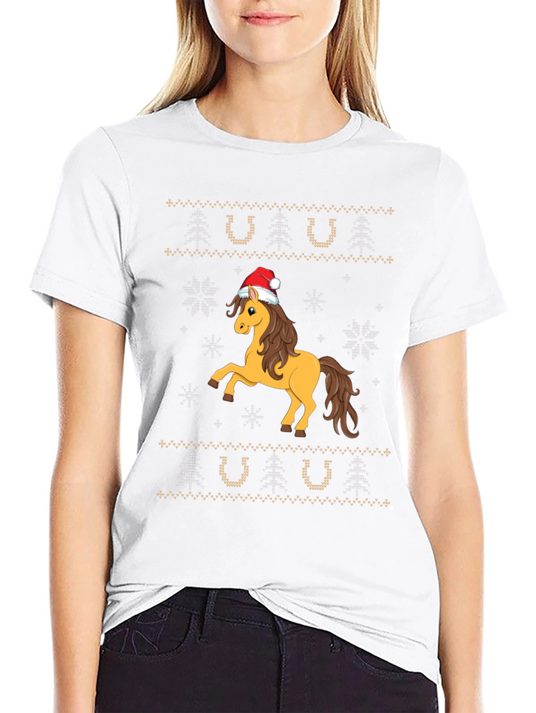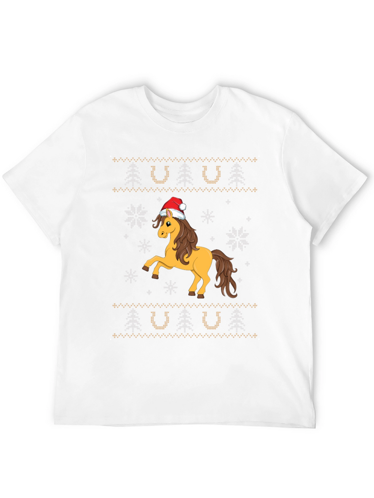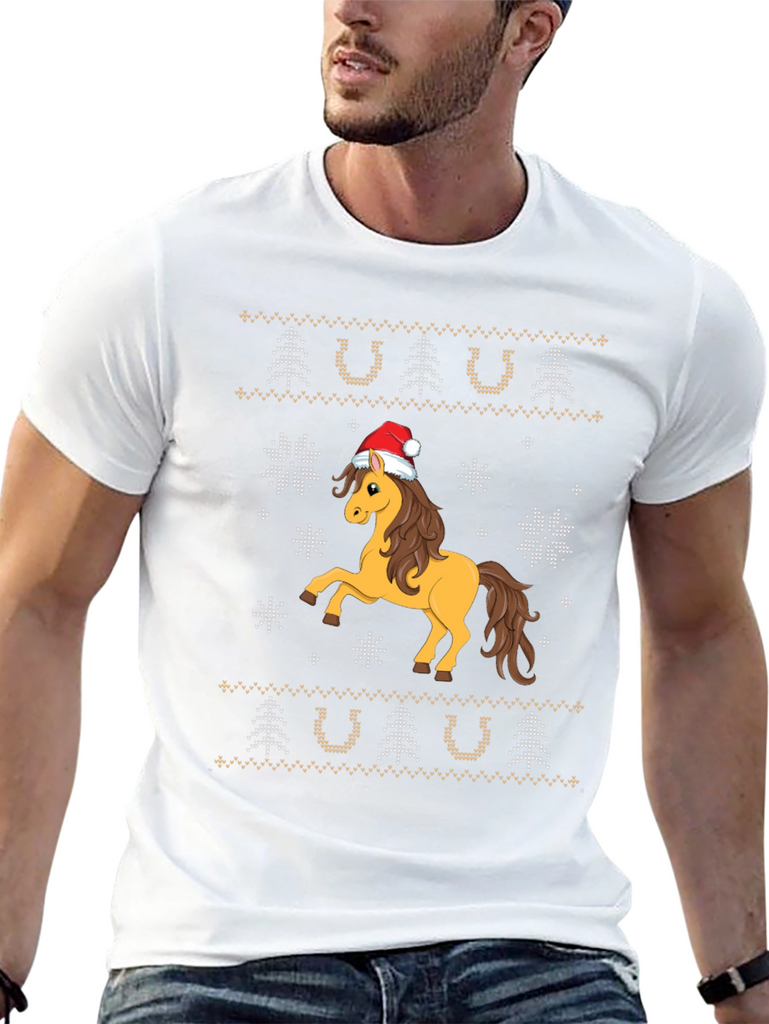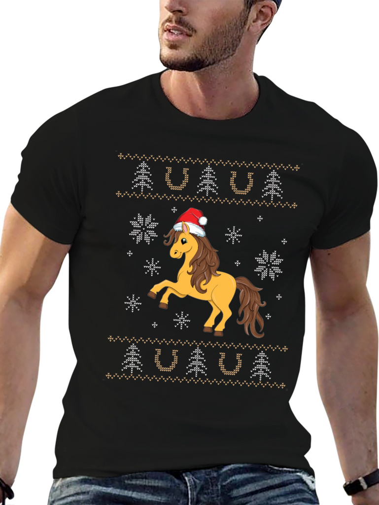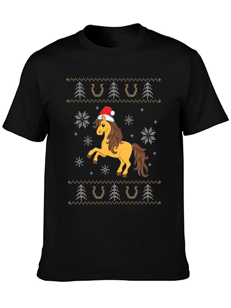 Celebrate the holidays in style with this unique Christmas t-shirt. The design features a charming horse wearing a Santa hat, surrounded by festive snowflakes, Christmas trees, and horseshoes. This eye-catching design is perfect for horse lovers who want to spread some holiday cheer. The black tee ensures the festive design stands out. The shirt is made from a soft-looking fabric. Wear it to holiday parties, family gatherings, or just to show off your Christmas spirit. This fun shirt is sure to be a conversation starter.